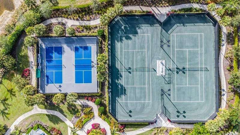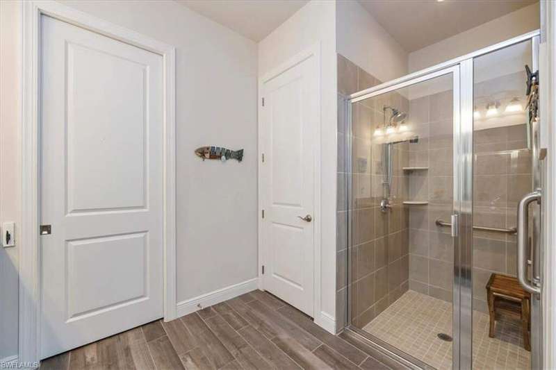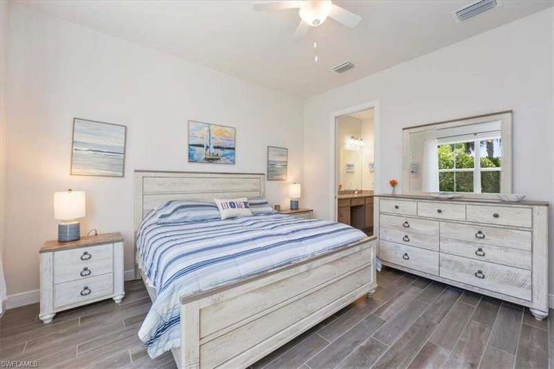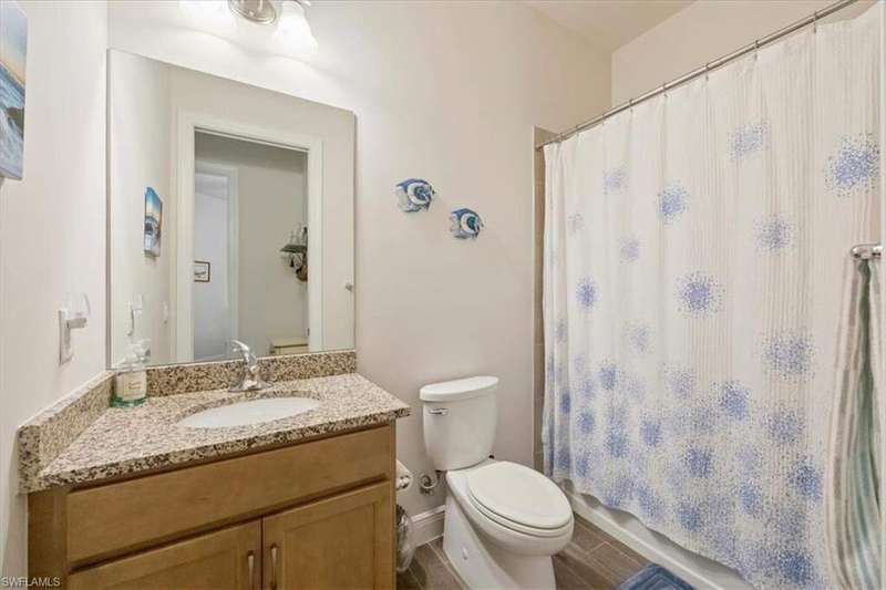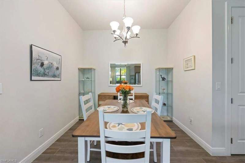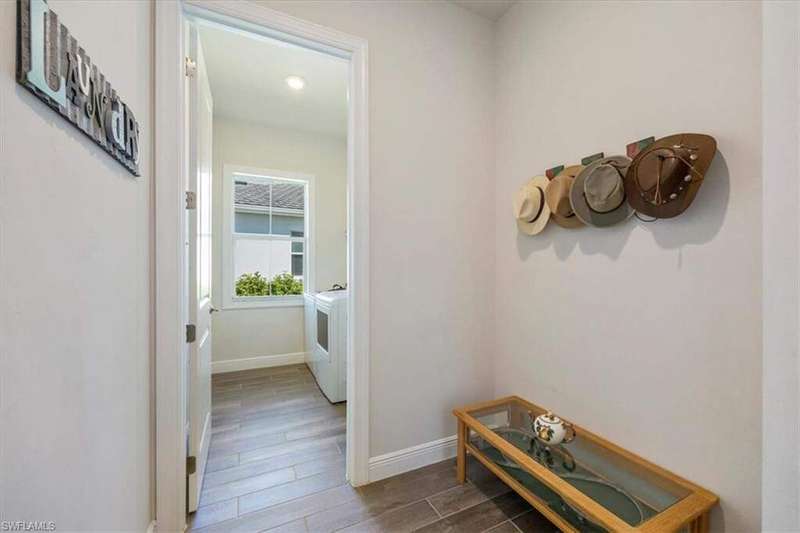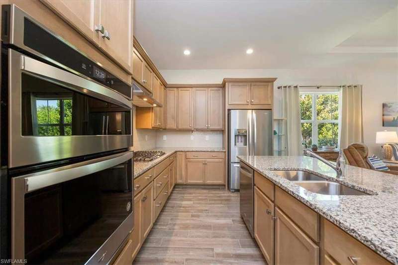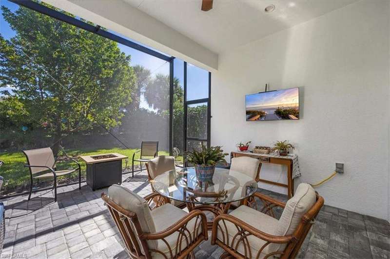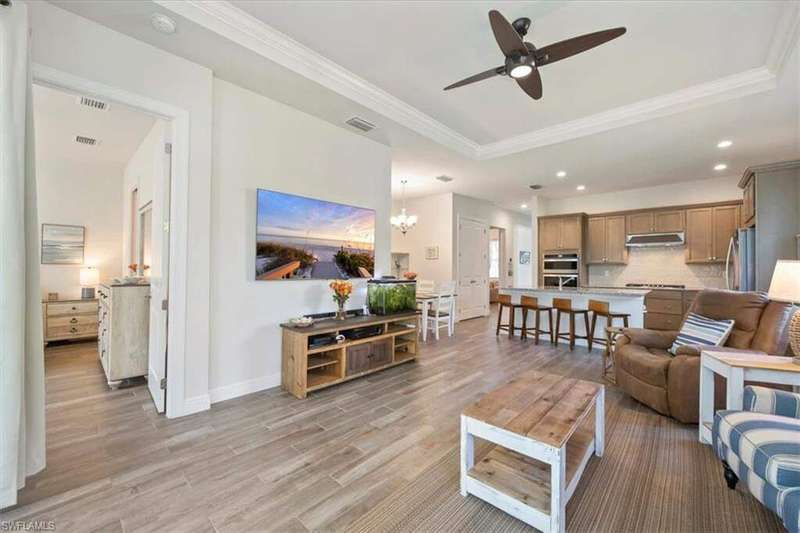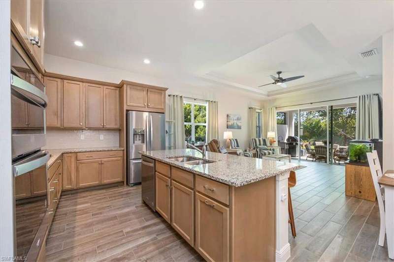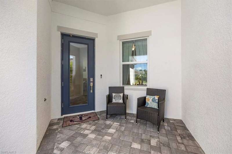 Welcome to 9016 Saint Lucia Drive in Azure at Hacienda Lakes-Naples, Florida, a premier gated community offering coastal-inspired living. This beautifully designed and furnished Baypointe Villa features 1,569 square feet of thoughtfully planned living space with 2 bedrooms, 2 bathrooms, a versatile den (ideal as a home office or optional third bedroom), and a spacious 2-car garage complete with built-in storage racks, cabinets, and a handy workbench for all your projects. Step inside and you'll find 10-foot ceilings, wide wood-look tile flooring throughout, and elegant coffered ceilings in the foyer and great room. The open concept layout showcases a gourmet kitchen with gas cooking, stainless steel appliances, granite countertops, tile backsplash, breakfast bar and pantry. The kitchen flows seamlessly into the dining area and expansive great room-ideal for both everyday living and entertaining. The owner's suite offers a bathroom featuring a dual-sink granite vanity, walk-in shower and spacious walk-in closet. The guest bedroom, located near a full bathroom, provides comfort and privacy for visitors. Additional upgrades include smart home technology, recessed lighting, ceiling fans, upgraded wood shelving in all closets, tankless water heater, hurricane impact front window and door, HVAC UV light for clean air, and a laundry room with tub sink. Outdoor living is equally impressive. Enjoy a private backyard with a covered lanai, extended brick pavers, open-air screen enclosure, outdoor sink and gas hookup for grilling. There's also plenty of room to design your own dream pool. Residents enjoy resort-style amenities including a gated entrance, clubhouse with social activities and game rooms, billiards, cafe, library, heated pool and spa with cabanas, state-of-the-art fitness center, tennis and pickleball courts, firepit and a BBQ/picnic area. Located just minutes from downtown Naples' 5th Avenue, Gulf Coast beaches, Marco Island, the Naples Botanical Garden, the Naples Zoo, top-rated shopping, exceptional dining and medical facilities, this home offers the perfect balance of convenience and luxury. Don't miss the opportunity to make this villa yours. Schedule a private showing today and experience the vacation lifestyle at Azure at Hacienda Lakes.