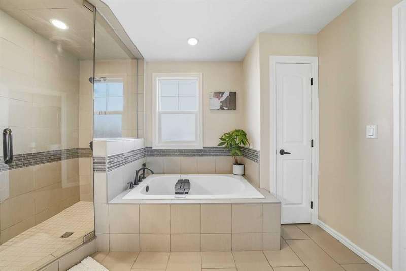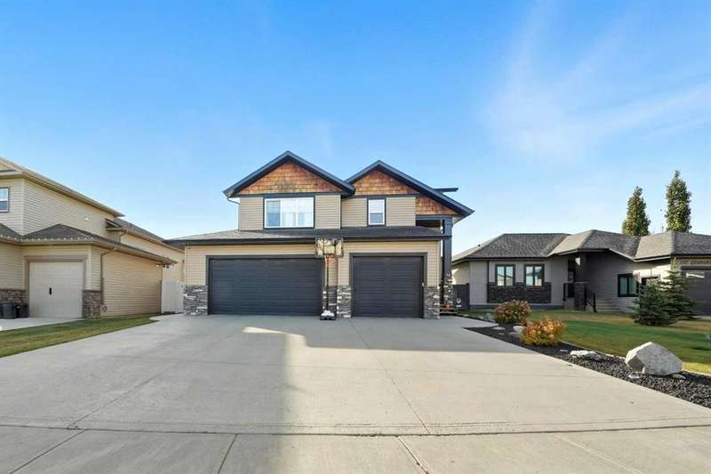 Pride of ownership is evident the moment you step inside this stunning custom-built modified bi-level. The spacious, bright foyer with tile flooring immediately sets the tone for the modern style and thoughtful design carried throughout this home. The open-concept main floor features a gorgeous kitchen with stained maple cabinetry, granite countertops, and stainless steel appliances. The living room impresses with its soaring 14-foot ceilings, creating a warm, inviting atmosphere centered around a cozy fireplace — perfect for relaxing or entertaining. This level includes two bedrooms, convenient for the kids . The primary suite is a true retreat, privately located above the garage and offering a luxurious ensuite with a soaker tub, separate shower, and a massive walk-in closet. The fully finished basement adds even more living space with an additional bedrooms, a spacious family room, a large bathroom, and the comfort of in-floor heating. Quality craftsmanship and attention to detail are showcased throughout, including matching granite in all bathrooms, central A/C, and custom blinds. Outside, you’ll find a beautifully landscaped and fully fenced yard with a storage shed, plus a heated triple garage and an oversized front parking pad — ideal for extra vehicles or toys. This home truly combines luxury, comfort, and functionality in one impressive package.