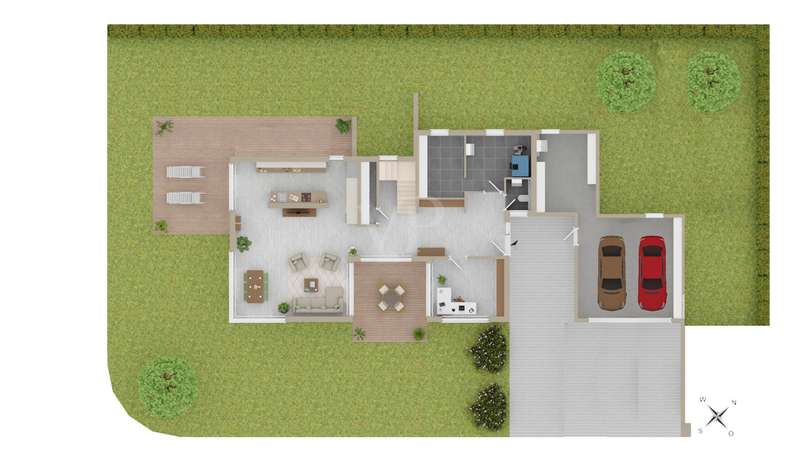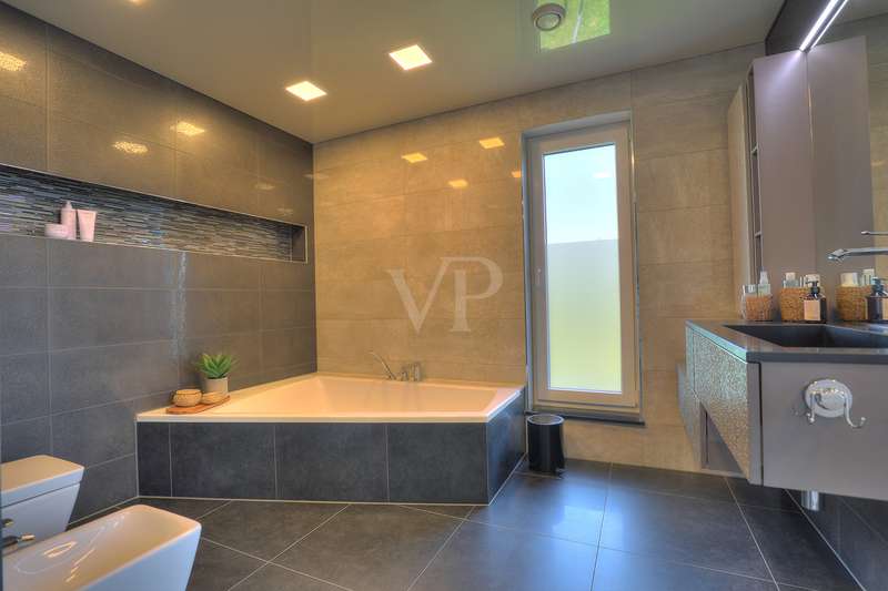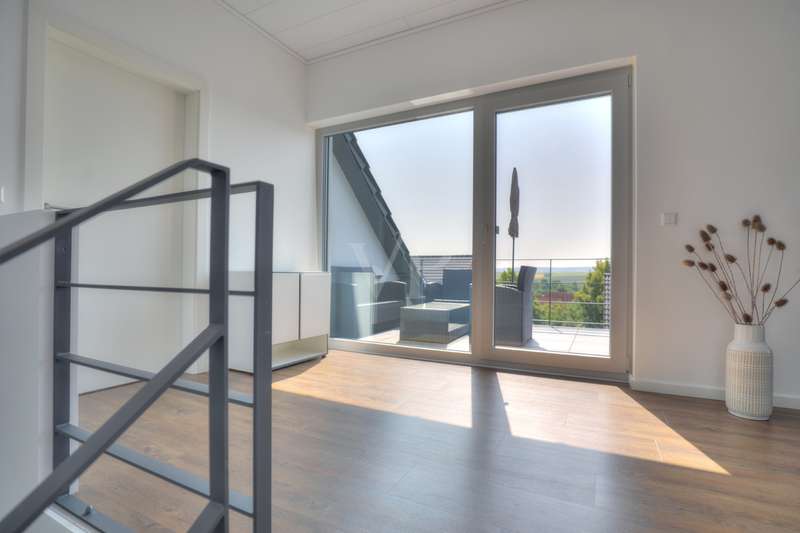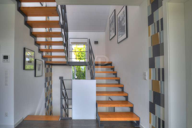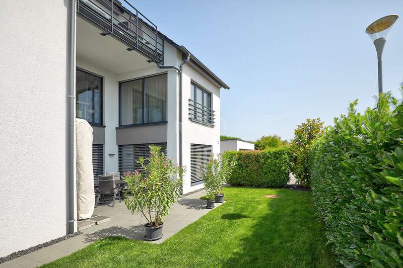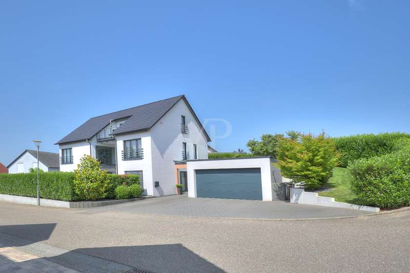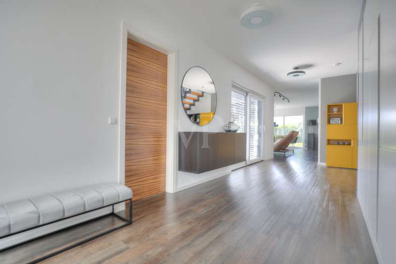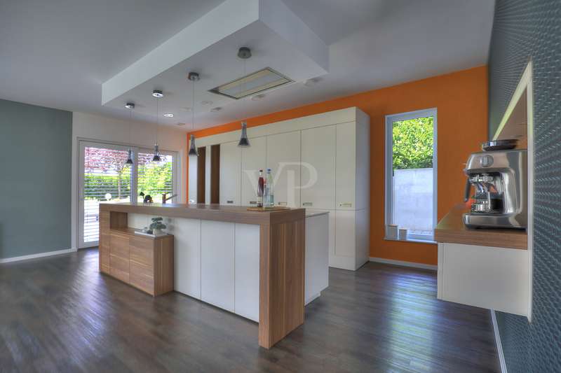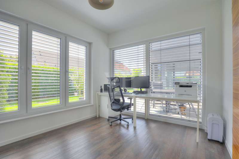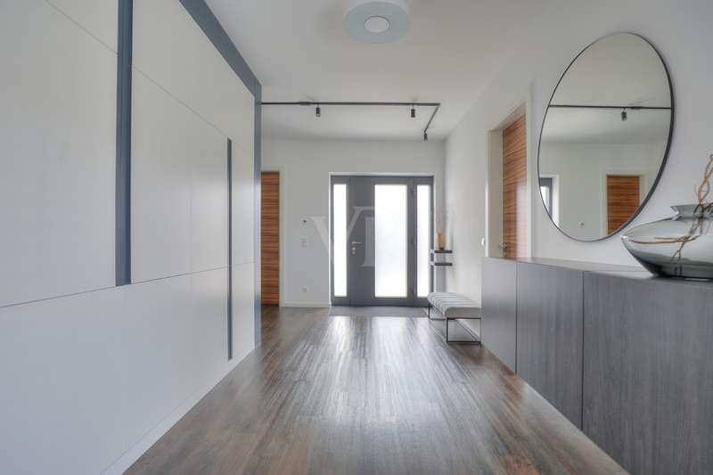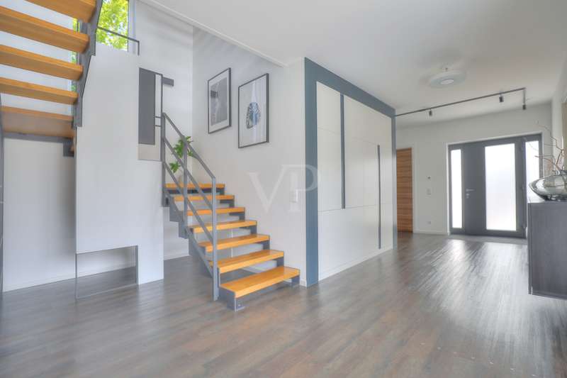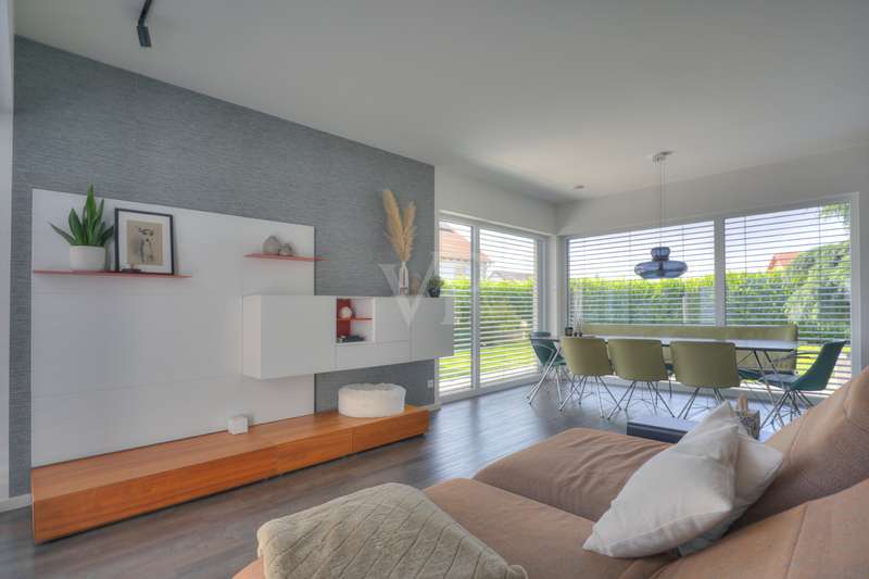 Move in and feel good - modern architect-designed house seeks new homeowners. This elegant detached house was built in 2014 in solid construction on a generous plot of 818 m² and impresses with its clear architecture, high-quality fittings and a well thought-out room concept. With a living area of approx. 292 m², the house offers plenty of space for families who value modern living, comfort and a stylish ambience. As soon as you enter, you are greeted by a stylish, spacious entrance area with a classic guest WC. A small pantry and a directly adjoining utility room offer storage space for food supplies, cleaning products and much more. A beautiful, bright room is located directly opposite and is currently used as a home office. The light-flooded living and dining area forms the heart of the house. It opens onto a high-quality, very modern fitted kitchen, which not only impresses with its design, but also with its equipment - ideal for cooking and enjoying meals together. Two adjoining terraces provide a seamless transition to the outdoors and invite you to linger. The garden faces south/east and south/west and is therefore perfect for sunbathing, barbecuing, playing and relaxing. With three bedrooms and two daylight bathrooms, the upper floor offers an ideal retreat for all family members: the master bedroom impresses with its own dressing area and a beautiful en suite bathroom. There is a spacious hobby room on the top floor, which can also be used as a sports room or guest area. The cozy south-east-facing loggia is the perfect place to relax and unwind. A large utility room with adjoining WC completes the successful layout of the house. All rooms in the entire house are equipped with pleasant underfloor heating including cooling function through active cooling of the heat pump and ensure a comfortable living climate at any time of year. A central ventilation system with heat recovery and hot water preparation combines efficiency and comfort. The features also include a separate utility room and a practical double garage. This detached house combines timeless architecture with generous space, high-quality fittings, excellent energy efficiency and a pleasant living atmosphere - an ideal property for families or couples with high demands on space, functionality and design.