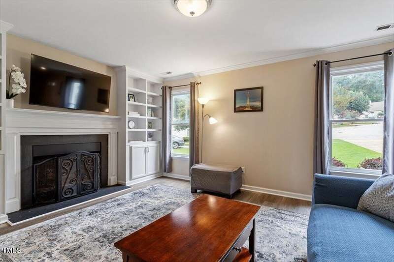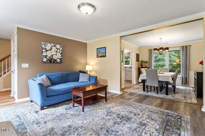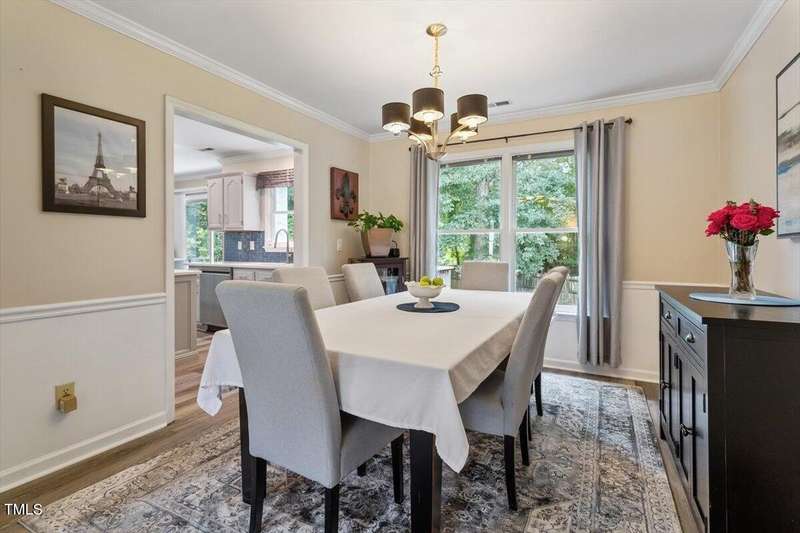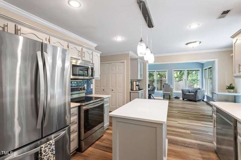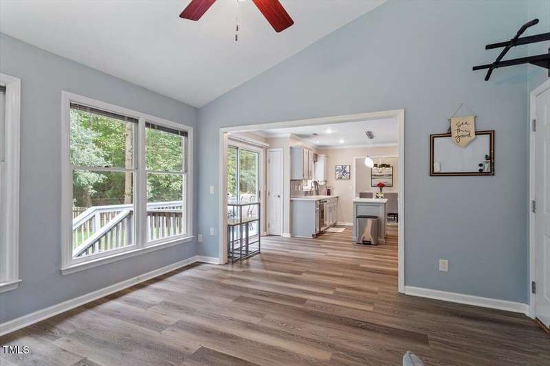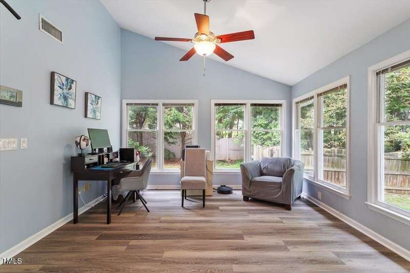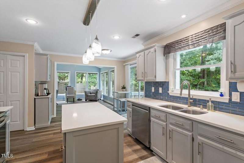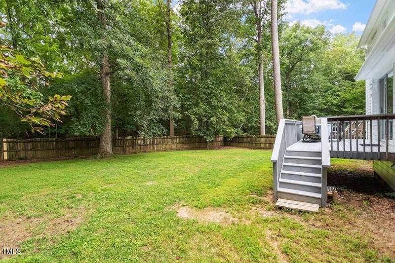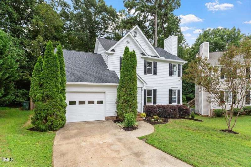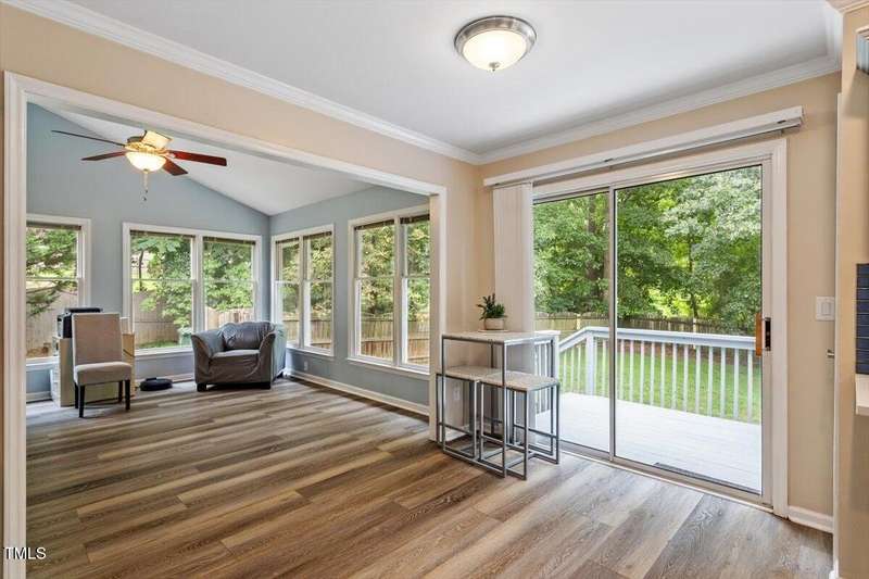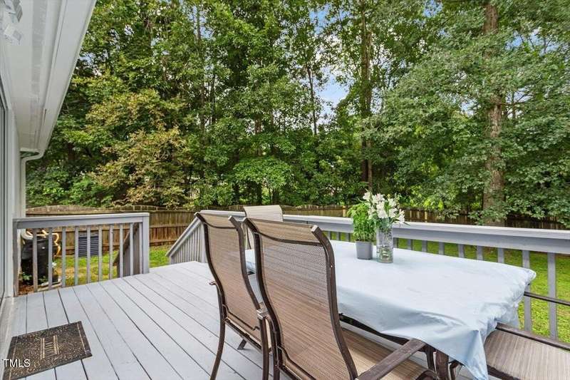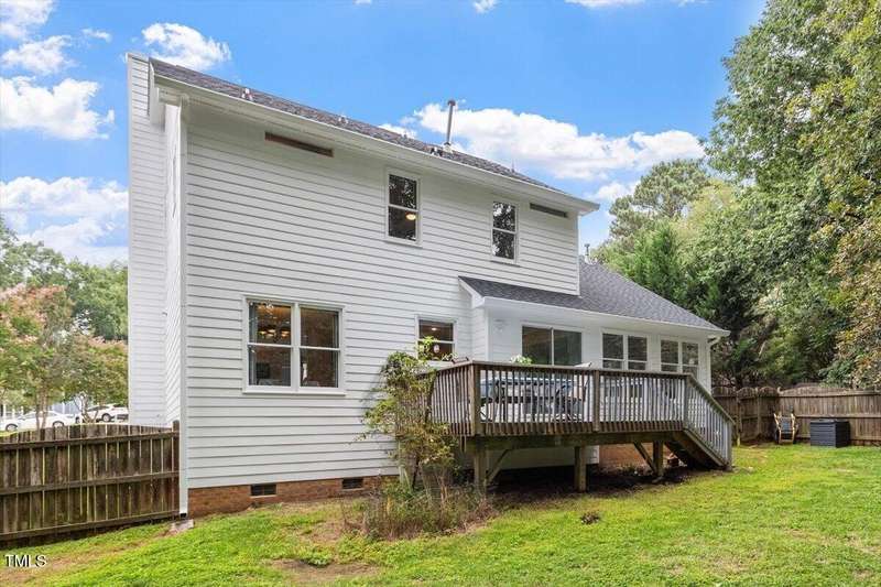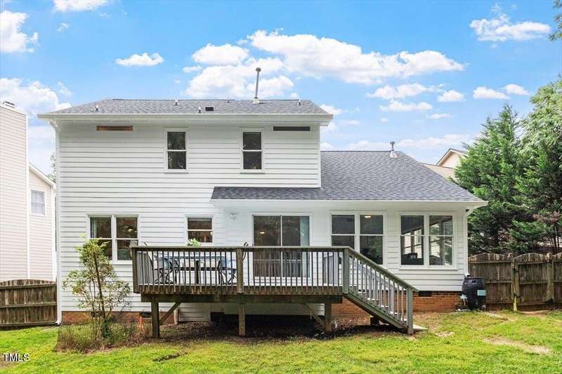 In the heart of Cary minutes to wonderful schools, shopping, restaurants, parks, greenway paths. Sited on a .41-acre quiet cul-de-sac fully fenced lot with wooded back drop. Open flowing floor plan fills with natural light; gorgeous ''hardwood'' style LVP flooring. Spacious family room with custom built in book shelves and cabinetry. Formal dining room can accommodate larger gatherings. Fully updated gourmet chef's kitchen with quartz countertops, center island, beautiful tile backsplash, ss appliances. Flexible sun room with vaulted ceiling also makes a great home office. Primary suite also has a vaulted ceiling, private bath, and large closet. Large sun deck overlooking level private yard. 2017 new roof, 2018 A/C, 2024 water heater, 2025 siding repairs & exterior paint. Seller offering $3,000 credit to replace carpet after closing or $3,000 in seller paid closing costs