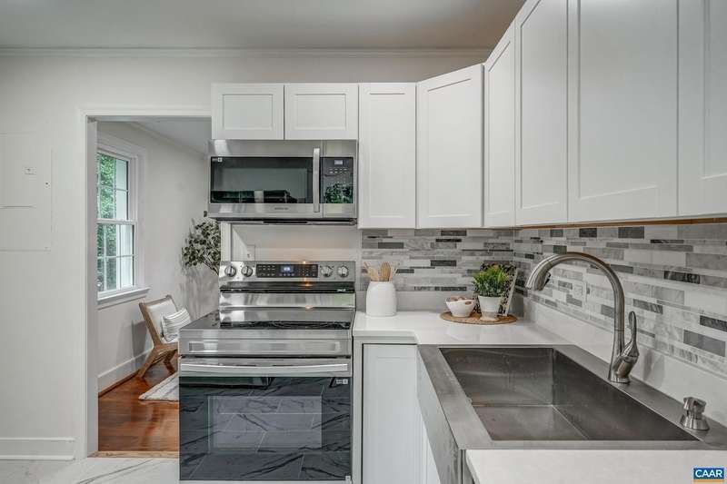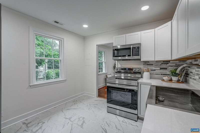 Completely renovated inside with new modern HVAC, new Tankless Hot Water Heater, new Kitchen, New Bathroom, new windows, new drywall and refinished floors! Charming city cottage has been totally updated! This adorable home tucked off of Rugby Road is surrounded by mature trees, with a newly landscaped and seeded yard. Inside, the cozy living room opens to the remodeled kitchen with quartz countertops, tile backsplash, white cabinets, and stainless steel appliances. Everything is brand new! Two bedrooms share a full hall bathroom with new tiled floor and shower, new plumbing and a high-end washer/dryer combo hidden behind the sliding barn door! A flexible room next to the kitchen can be a home office, dining room or third bedroom. New tankless hot water heater for instant hot water too! Enjoy the beautiful landscaping around the patio at the rear of the home. Don't miss your chance at this city charmer!,Quartz Counter,White Cabinets