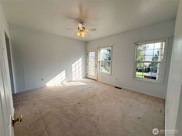 Exceptional 4-bed/2 bath home in Orchard Trails on 1.14 irrigated acres. Warm wooden beams and soaring vaulted ceilings create a welcoming atmosphere, while skylights and tall windows bathe the living room in natural light. The open floor plan flows seamlessly for entertaining—gather around the cozy wood-burning fireplace or step outside to the stone patio and private backyard. Spacious, bright kitchen with all appliances, primary suite with full bath, flexible 4th bedroom/bonus room, and separate utility with W/D. Lush lawn with irrigation sprinklers, storage shed, and double garage with paved driveway. Country feel, just minutes from Omak shopping and schools!