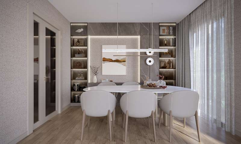 Apartments are situated in a complex which consists of 3 blocks. The project includes an indoor swimming pool, green areas with ornamental pools and gazebos, walking trails, landscaped areas, a modern gym, saunas, children’s playgrounds, an indoor parking lot, 24/7 security and security cameras.