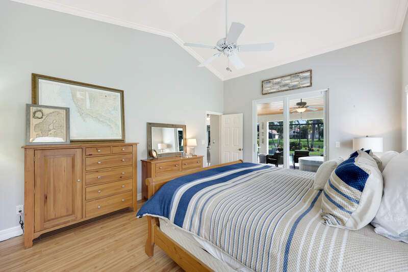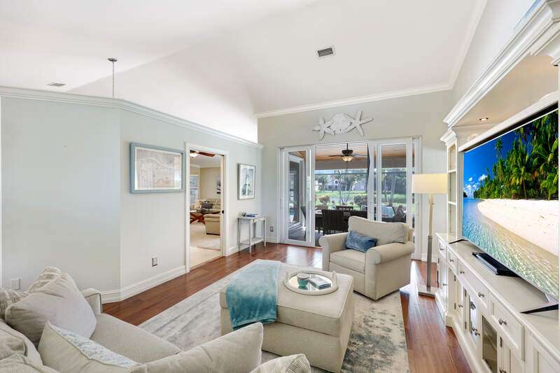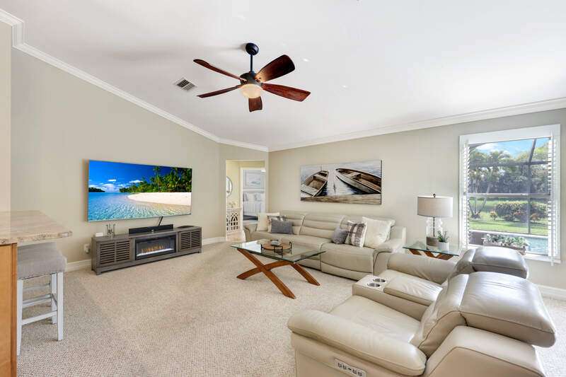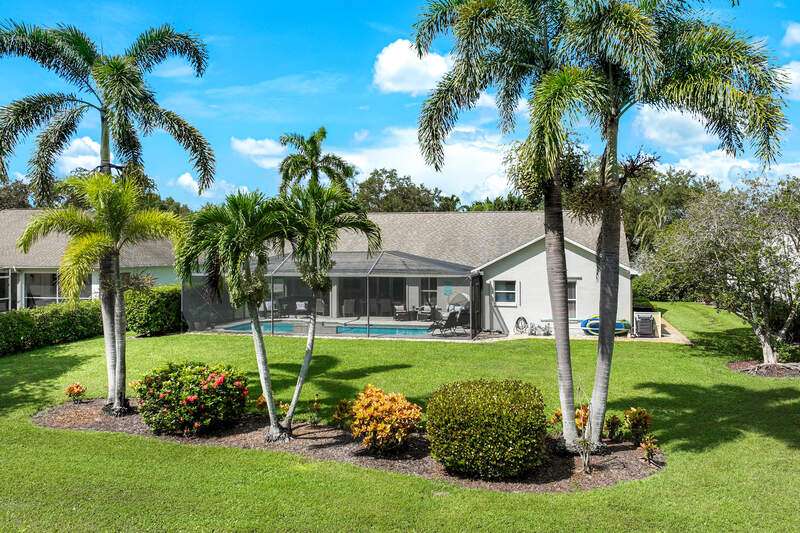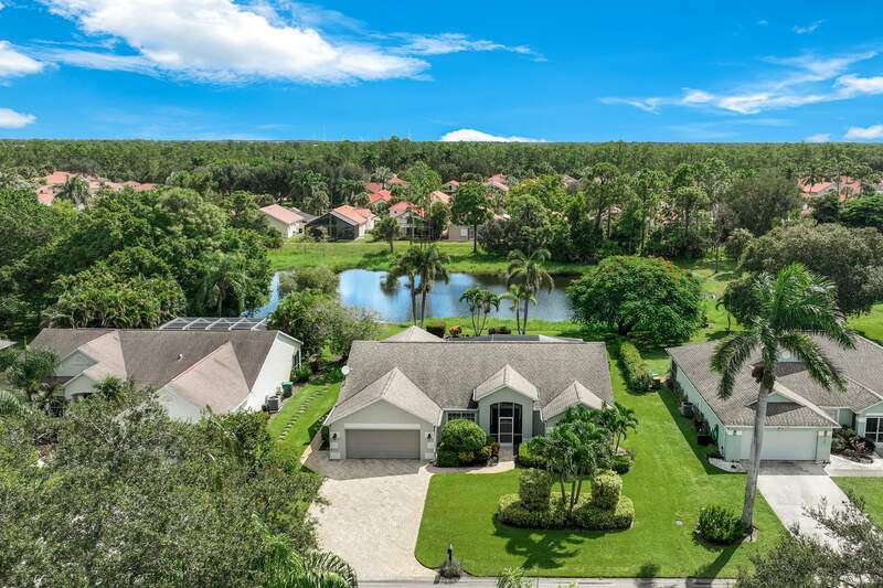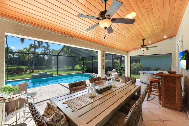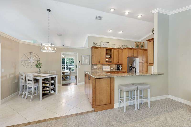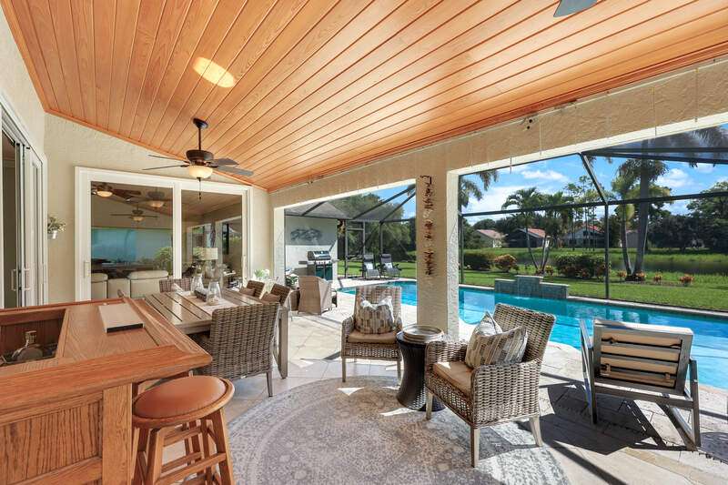 A beauty inside and out! This home, that has been lovingly cared for, immaculately kept, and thoughtfully updated, has so much to offer. Its screened-in heated lap pool surrounded by a travertine deck overlooks a lake. Its 2,000-plus square-foot interior includes formal spaces perfect for entertaining as well as a separate great room, whose family room, breakfast area and kitchen are the heart of the home. Some notable features and finishes include custom wood cabinets, vaulted ceilings defined by crown molding, newer appliances, granite counter tops, and a wood ceiling over the lanai. You'll also appreciate the electric storm shutters on the lanai, the new electric pool heater, and the hot tub that tucks neatly into the corner of the lanai and is included with the sale of the home. The community of Plantation is a treasure with its reasonable HOA fees under $800 per year, wide streets, modest clubhouse, tennis/pickleball courts and pool, plus it's only 7 miles from the beach and the shops and restaurants of downtown Naples.