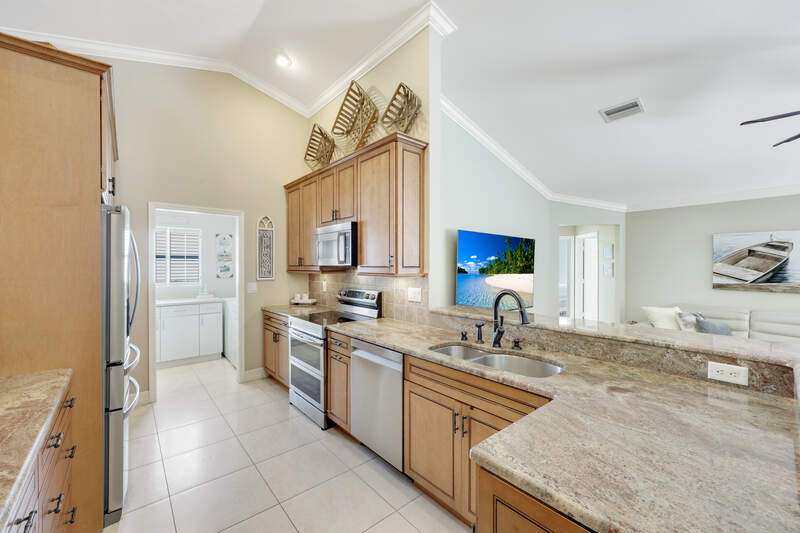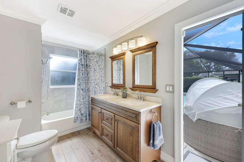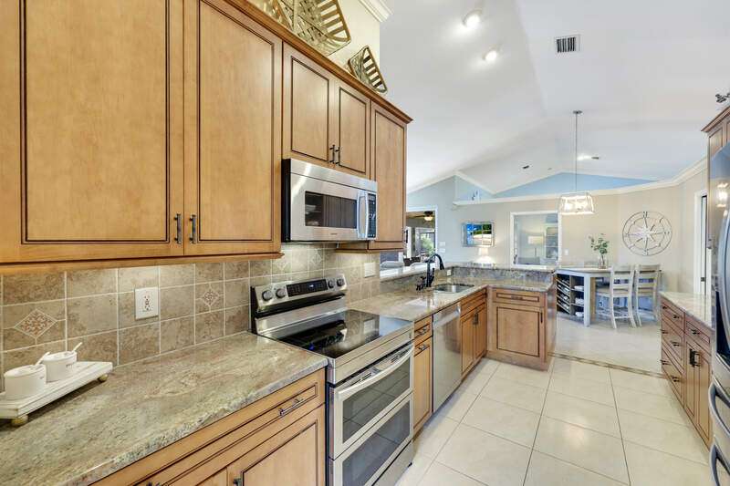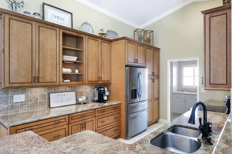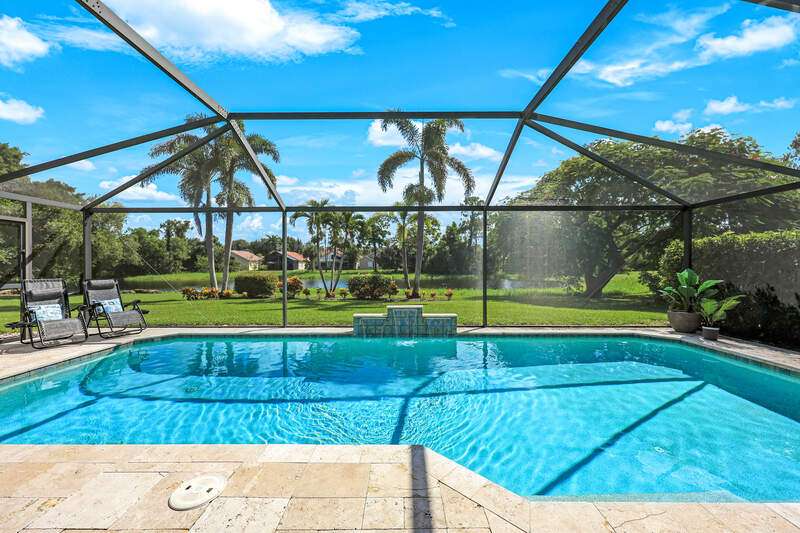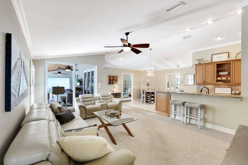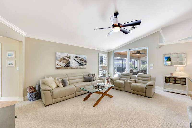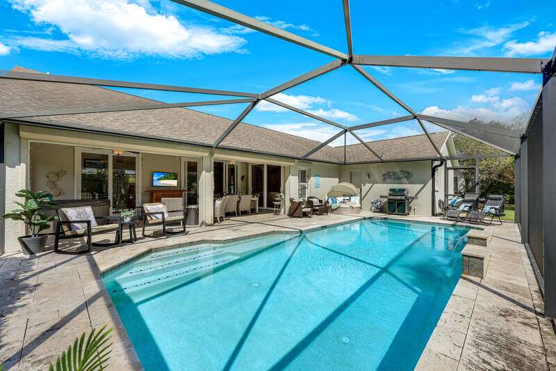A beauty inside and out! This home, that has been lovingly cared for, immaculately kept, and thoughtfully updated, has so much to offer. Its screened-in heated lap pool surrounded by a travertine deck overlooks a lake. Its 2,000-plus square-foot interior includes formal spaces perfect for entertaining as well as a separate great room, whose family room, breakfast area and kitchen are the heart of the home. Some notable features and finishes include custom wood cabinets, vaulted ceilings defined by crown molding, newer appliances, granite counter tops, and a wood ceiling over the lanai. You'll also appreciate the electric storm shutters on the lanai, the new electric pool heater, and the hot tub that tucks neatly into the corner of the lanai and is included with the sale of the home. The community of Plantation is a treasure with its reasonable HOA fees under $800 per year, wide streets, modest clubhouse, tennis/pickleball courts and pool, plus it's only 7 miles from the beach and the shops and restaurants of downtown Naples.