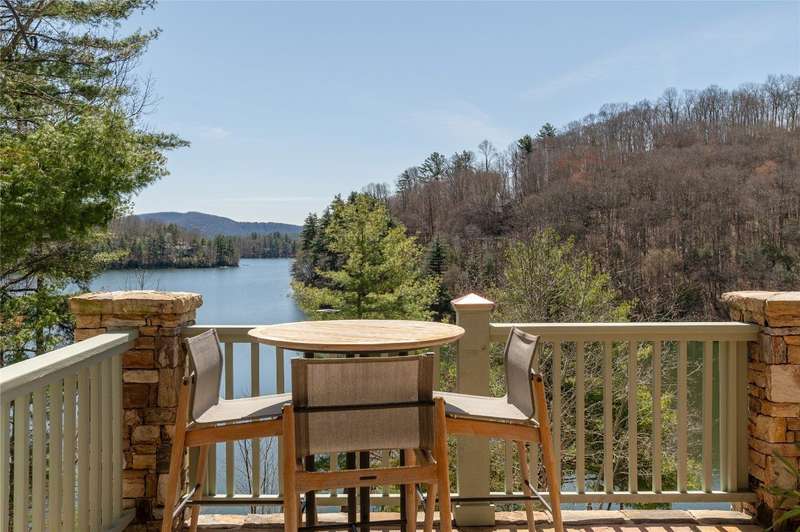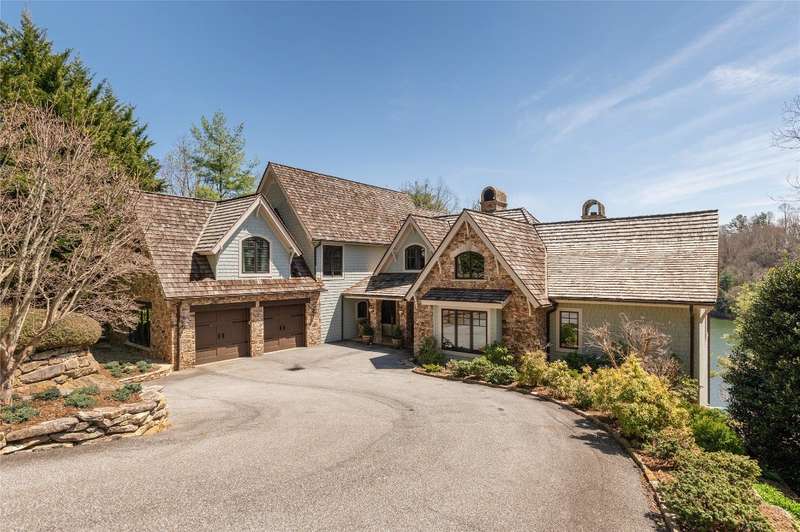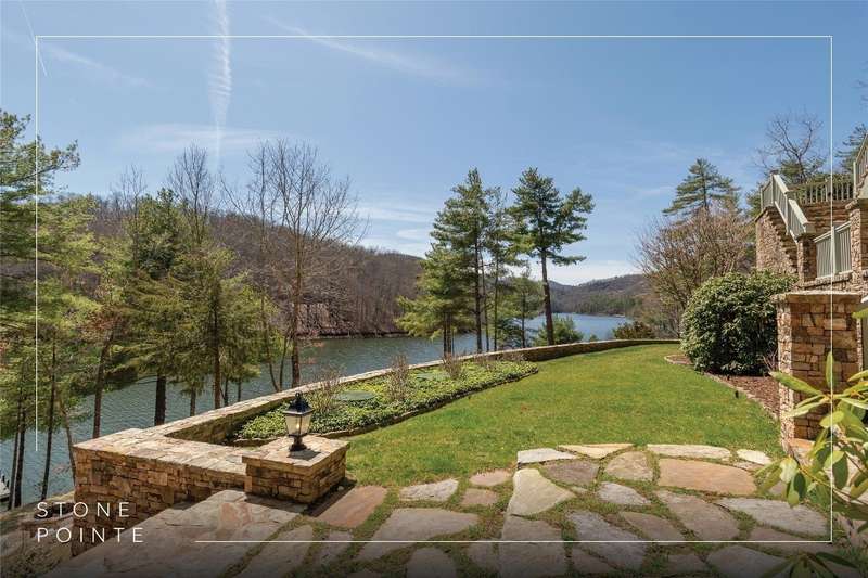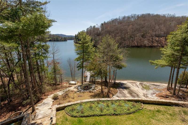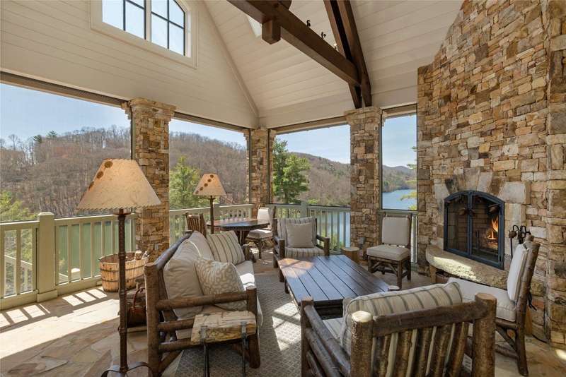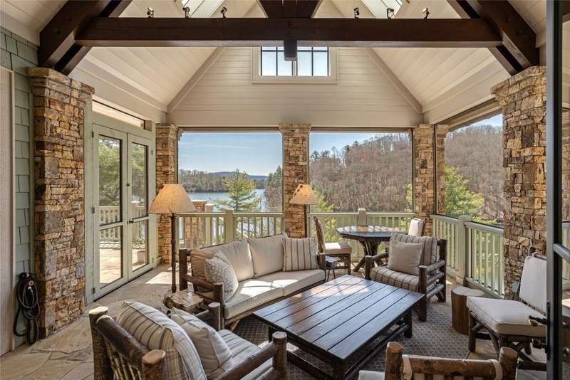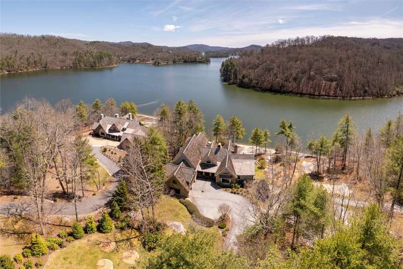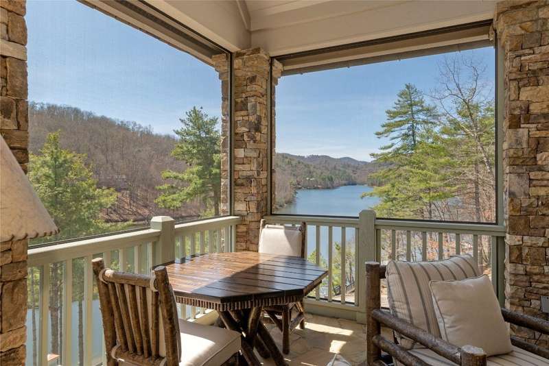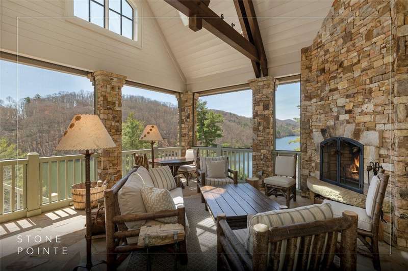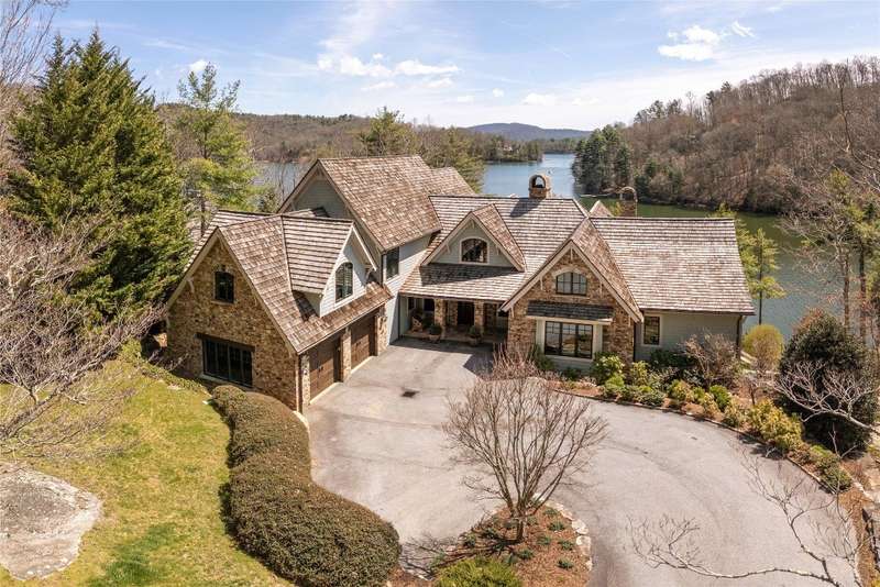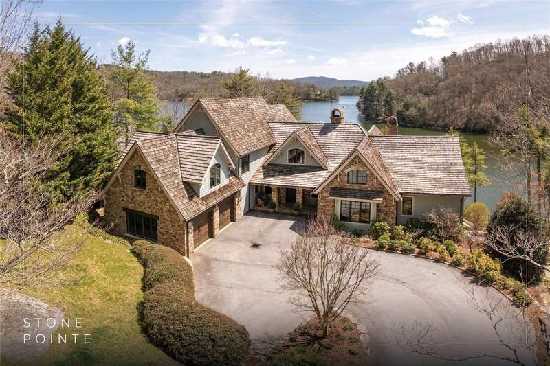 Experience an architectural masterpiece by Tim Greene with this exceptional property on Lake Glenville. Situated on a premier lot with breathtaking panoramic lake views, this home offers an unparalleled combination of thoughtful design, superior craftsmanship, and effortless living. The home has been beautifully decorated by a local designer, and is now being offered fully furnished. A true turnkey and move-in ready home. From its 18-inch foundation walls to the massive beams and beautifully crafted stacked stone, both inside and outside, the residence is as enduring as it is stunning. Shiplap walls, wood ceilings, and hardwood floors throughout most of the home add timeless character. The open floor plan is designed for both daily living and entertaining. Expansive windows showcasing the lake bring sunlight into the spacious living, dining, and kitchen areas. The main-level primary suite features serene views and a beautifully appointed bathroom, while upstairs there are three private ensuite guest bedrooms, creating a welcoming haven for friends and family, plus abundant storage throughout the property. The outdoor areas are thoughtfully designed with expansive stone patios, green spaces, and a custom fire pit that invites gatherings and relaxation, while multiple screened porches - including one with a wood-burning fireplace - offer panoramic views and cozy nooks for quiet moments. The private dock provides easy access to activities on Lake Glenville. Start the day with coffee while enjoying long-range southerly views, watch waterfowl gliding across the lake, or paddleboard to a nearby waterfall. Cruise across the water to visit a bald eagle nest, or host guests for July 4th fireworks over the lake, creating unforgettable memories. Located in the gated enclave of Stone Pointe with just eight exclusive lakefront lots, this property delivers both privacy and a welcoming sense of community. Meticulously cared for and updated by the current owners, the move-in ready home offers a perfect space for lakeside living.