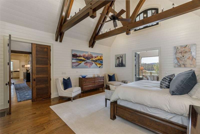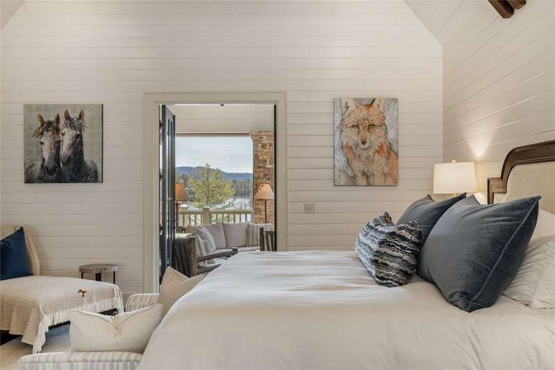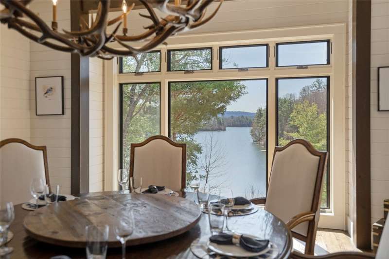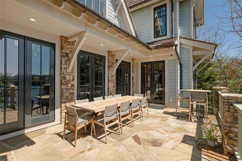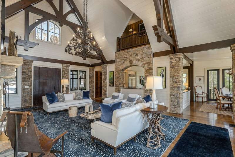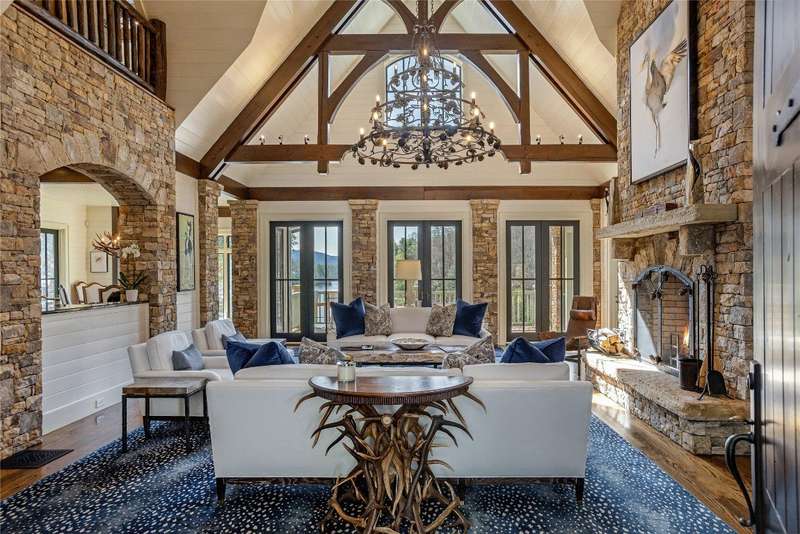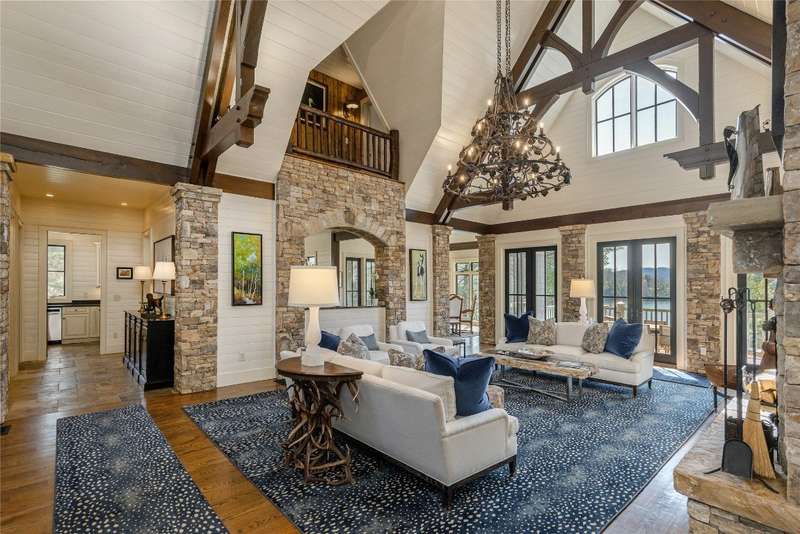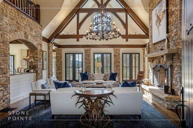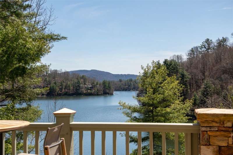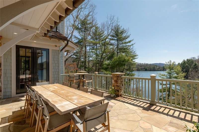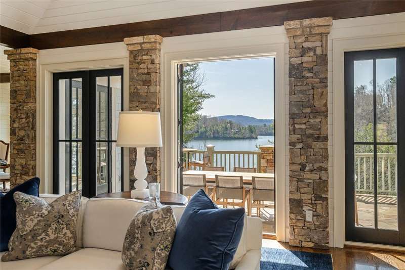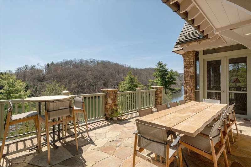 Experience an architectural masterpiece by Tim Greene with this exceptional property on Lake Glenville. Situated on a premier lot with breathtaking panoramic lake views, this home offers an unparalleled combination of thoughtful design, superior craftsmanship, and effortless living. The home has been beautifully decorated by a local designer, and is now being offered fully furnished. A true turnkey and move-in ready home. From its 18-inch foundation walls to the massive beams and beautifully crafted stacked stone, both inside and outside, the residence is as enduring as it is stunning. Shiplap walls, wood ceilings, and hardwood floors throughout most of the home add timeless character. The open floor plan is designed for both daily living and entertaining. Expansive windows showcasing the lake bring sunlight into the spacious living, dining, and kitchen areas. The main-level primary suite features serene views and a beautifully appointed bathroom, while upstairs there are three private ensuite guest bedrooms, creating a welcoming haven for friends and family, plus abundant storage throughout the property. The outdoor areas are thoughtfully designed with expansive stone patios, green spaces, and a custom fire pit that invites gatherings and relaxation, while multiple screened porches - including one with a wood-burning fireplace - offer panoramic views and cozy nooks for quiet moments. The private dock provides easy access to activities on Lake Glenville. Start the day with coffee while enjoying long-range southerly views, watch waterfowl gliding across the lake, or paddleboard to a nearby waterfall. Cruise across the water to visit a bald eagle nest, or host guests for July 4th fireworks over the lake, creating unforgettable memories. Located in the gated enclave of Stone Pointe with just eight exclusive lakefront lots, this property delivers both privacy and a welcoming sense of community. Meticulously cared for and updated by the current owners, the move-in ready home offers a perfect space for lakeside living.