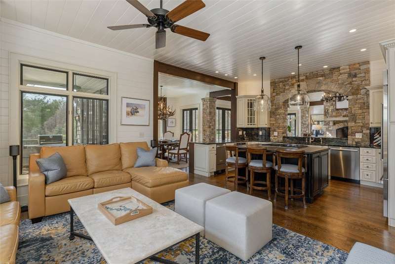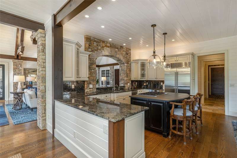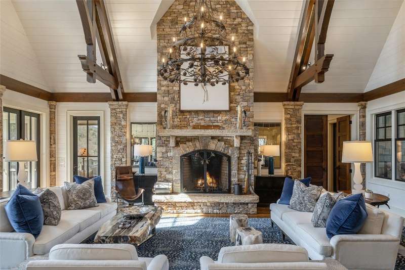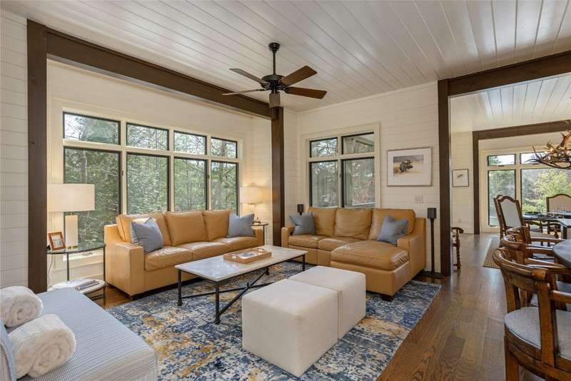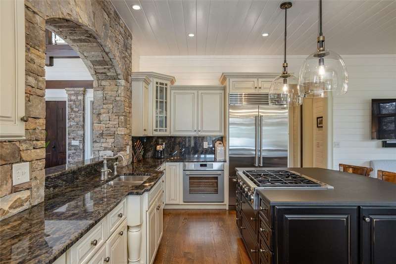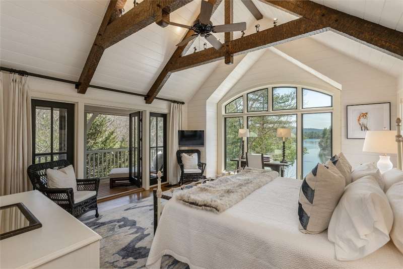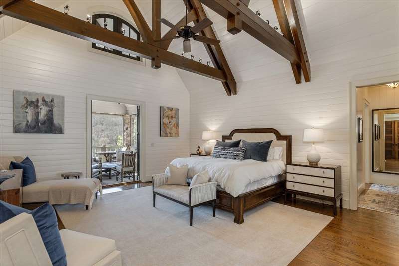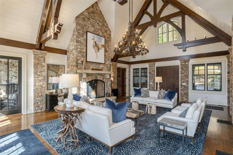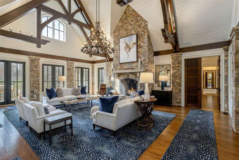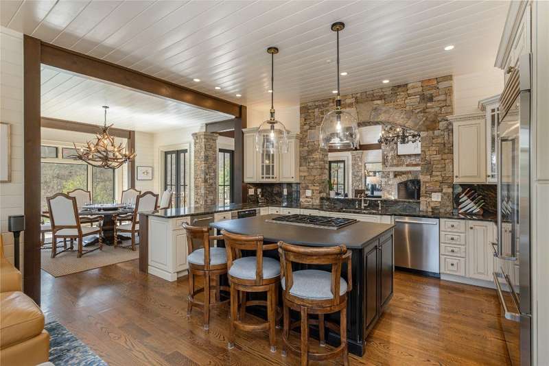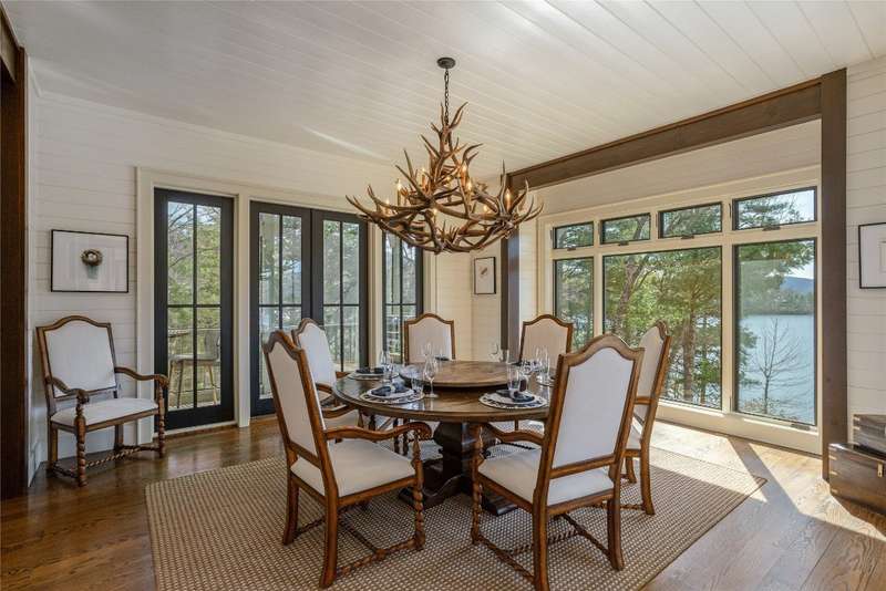 Experience an architectural masterpiece by Tim Greene with this exceptional property on Lake Glenville. Situated on a premier lot with breathtaking panoramic lake views, this home offers an unparalleled combination of thoughtful design, superior craftsmanship, and effortless living. The home has been beautifully decorated by a local designer, and is now being offered fully furnished. A true turnkey and move-in ready home. From its 18-inch foundation walls to the massive beams and beautifully crafted stacked stone, both inside and outside, the residence is as enduring as it is stunning. Shiplap walls, wood ceilings, and hardwood floors throughout most of the home add timeless character. The open floor plan is designed for both daily living and entertaining. Expansive windows showcasing the lake bring sunlight into the spacious living, dining, and kitchen areas. The main-level primary suite features serene views and a beautifully appointed bathroom, while upstairs there are three private ensuite guest bedrooms, creating a welcoming haven for friends and family, plus abundant storage throughout the property. The outdoor areas are thoughtfully designed with expansive stone patios, green spaces, and a custom fire pit that invites gatherings and relaxation, while multiple screened porches - including one with a wood-burning fireplace - offer panoramic views and cozy nooks for quiet moments. The private dock provides easy access to activities on Lake Glenville. Start the day with coffee while enjoying long-range southerly views, watch waterfowl gliding across the lake, or paddleboard to a nearby waterfall. Cruise across the water to visit a bald eagle nest, or host guests for July 4th fireworks over the lake, creating unforgettable memories. Located in the gated enclave of Stone Pointe with just eight exclusive lakefront lots, this property delivers both privacy and a welcoming sense of community. Meticulously cared for and updated by the current owners, the move-in ready home offers a perfect space for lakeside living.
