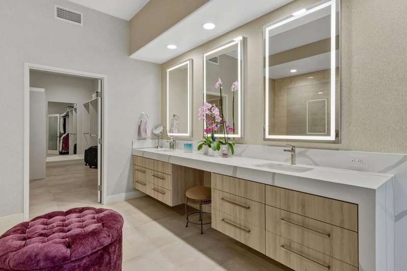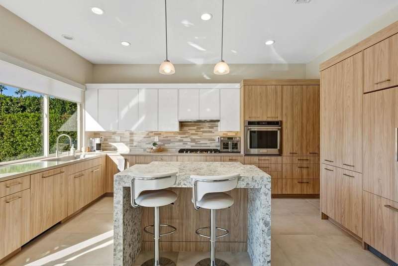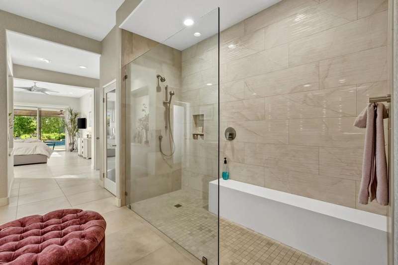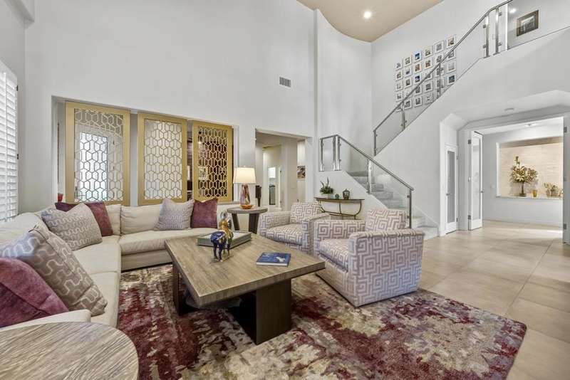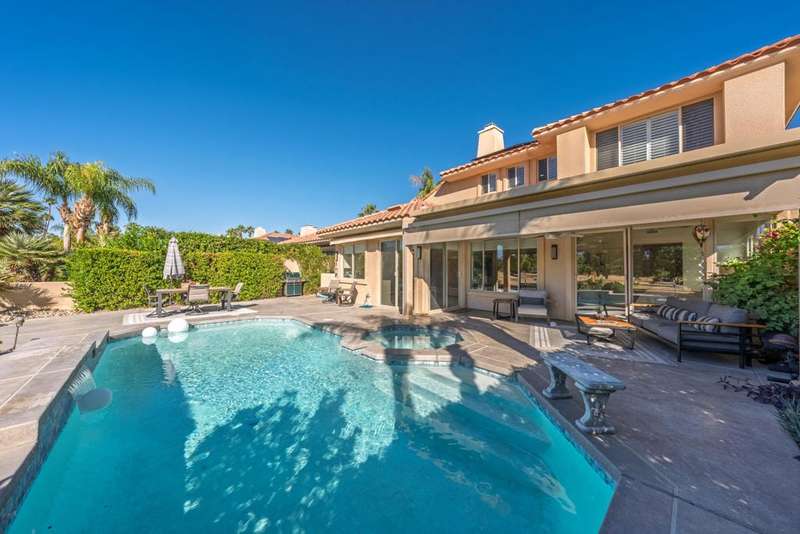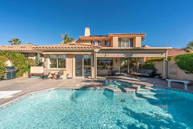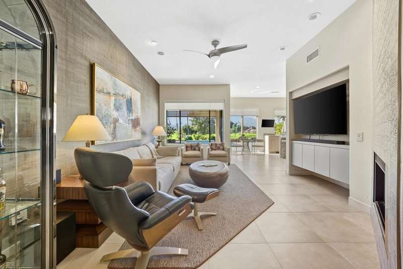 Experience modern luxury and sophisticated design in this fully renovated home, masterfully reimagined by acclaimed designer Steven Cheroske. Perched in an elevated location with stunning views of the San Jacinto Mountains and a beautiful view that overlooks 50 acre green space maintained in a park like condition, this home offers a rare blend of privacy, style, and natural beauty. Featuring three spacious ensuites plus a powder room, the layout is ideal for both comfortable living and upscale entertaining.Inside, you'll find sleek two-foot tile flooring throughout the first level and high-grade new carpeting upstairs and on the staircase. The entire home has been refreshed with designer-grade wallpaper, custom paint, and high-end finishes. The kitchen is a showstopper with modern cabinetry, quartz countertops, a large island with a built-in wine fridge, new appliances, a new sink, and a remote-controlled retractable canopy over the window. Bathrooms have been completely updated with quartz countertops, floating cabinets, custom mirrors, upgraded tile showers, and high-end fixtures. The primary suite features a water closet outlet prepped for a bidet and rebuilt closets with custom shelving and cabinetry.Additional designer touches include custom lighting, new ceiling fans, sleek glass-paneled doors throughout, a dramatic glass-and-metal stair railing, a custom metal wall sculpture in the entry, and a custom-colored glass accent wall flanking the open fireplace. The home also boasts a new built-in TV cabinet, retractable phantom screen doors, and upgraded window coverings in the kitchen, family room, and primary bedroom.Step outside to a beautifully redone cement patio with a new roof cover, a remote-controlled drop-down sunshade, and views that capture the essence of desert living. Mechanical upgrades include a brand-new AC unit (2024), a new pool pump (2025), repaired and serviced AC ductwork, new lighting and switches throughout, a new washer and dryer, and a fully upgraded garage with epoxy floors and custom cabinetry.This is not just a renovation it is a top-to-bottom transformation into a refined desert retreat. Whether you're seeking a luxurious full-time residence, a weekend getaway, or an income-generating vacation home, this designer masterpiece delivers on every level. Come see why We LOVE This Home!!!!