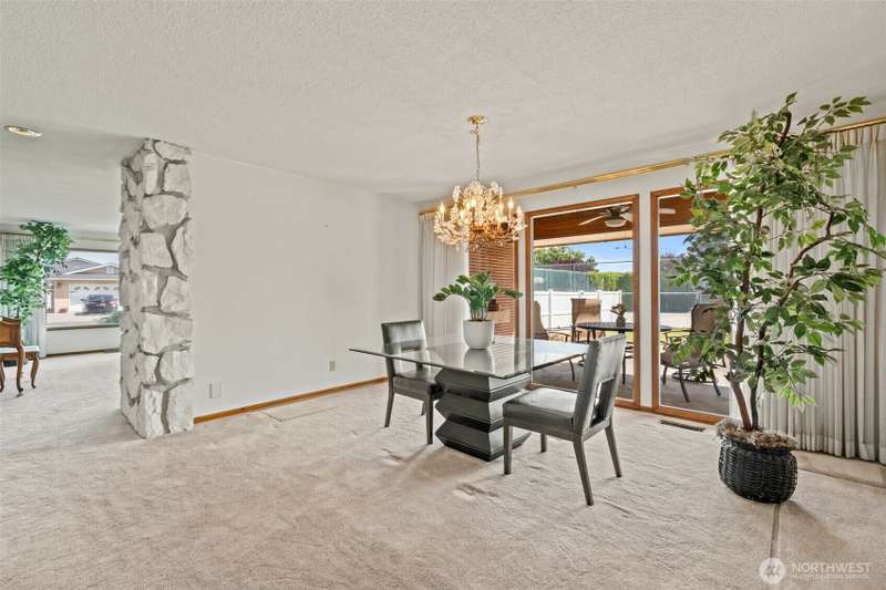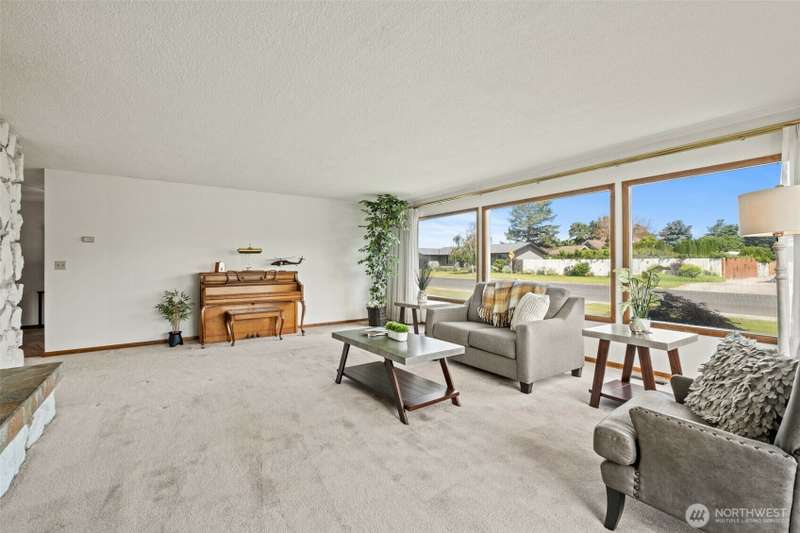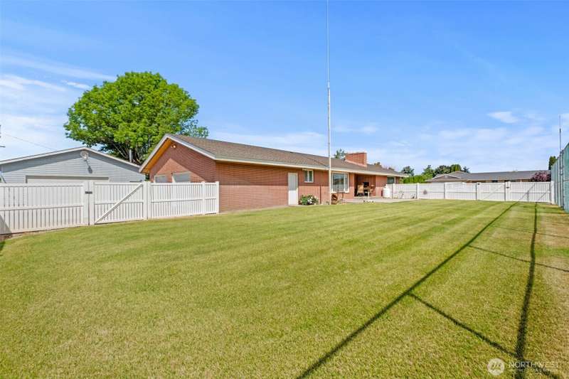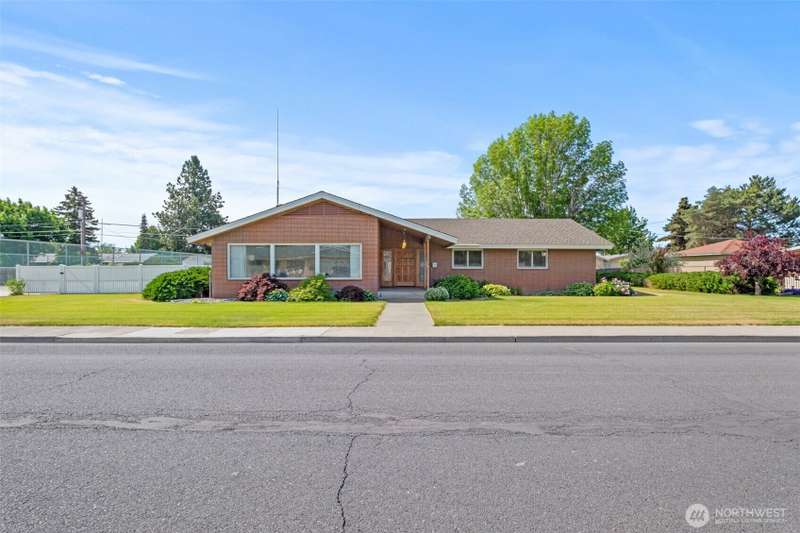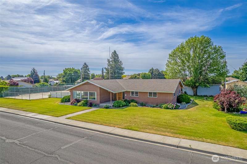 Fantastic property admired by all. Brick home, 2,568 sq ft with 4 bedrooms, 3 baths, huge living room with large picture windows and a gorgeous rock fireplace. Work from home in an office featuring built-in beautifully stained drawers and shelving to keep you organized and sliding glass doors to the covered patio to comfortably relax outdoors. The kitchen takes full advantage of the sunshine with large windows and slider to the covered patio. Corian counter tops and island seating, double ovens, beautiful cabinets and a walk-in pantry ready for you to decide how best to configure it. The primary bedroom suite and 3 additional bedrooms are good-sized. Attached over-sized garage plus 1,088 sq ft garage/shop AND a sport court are all amazing!