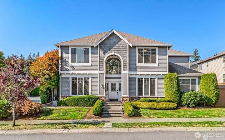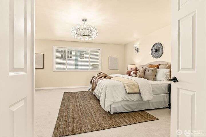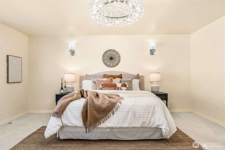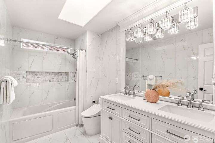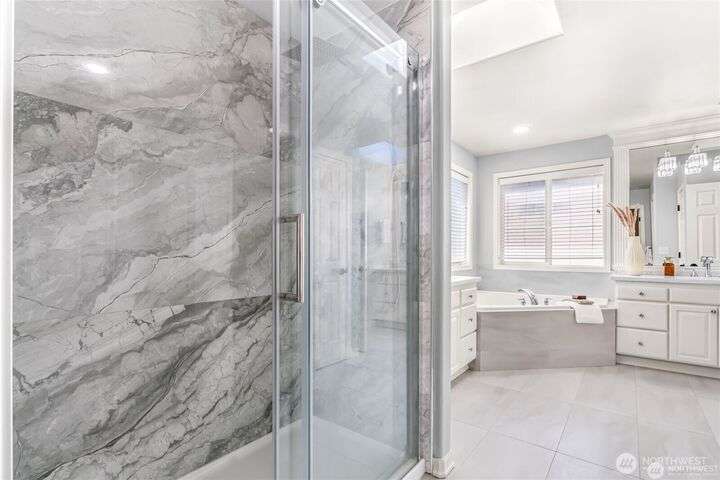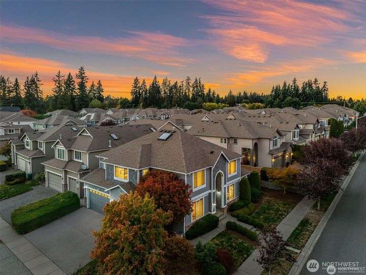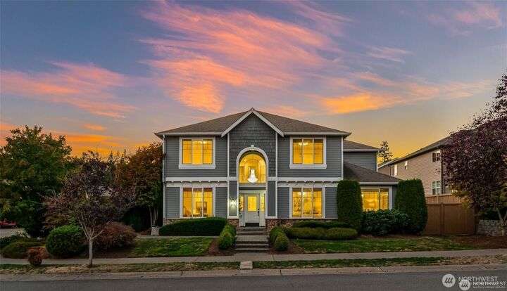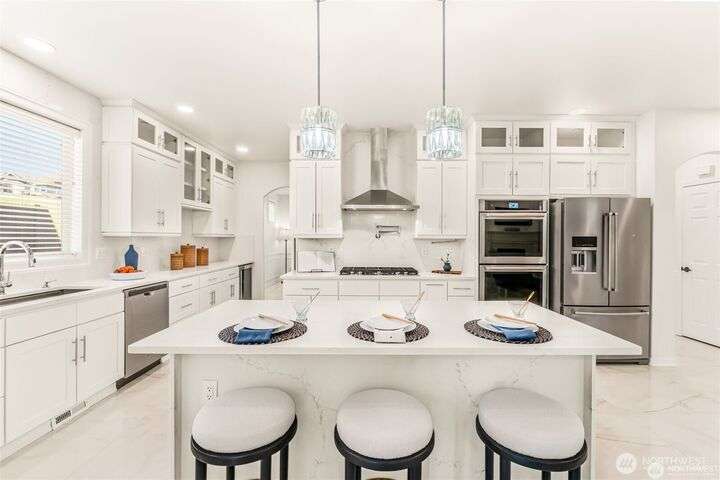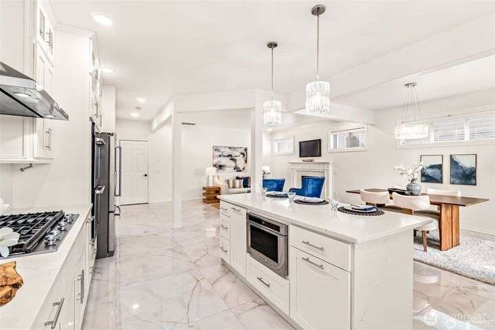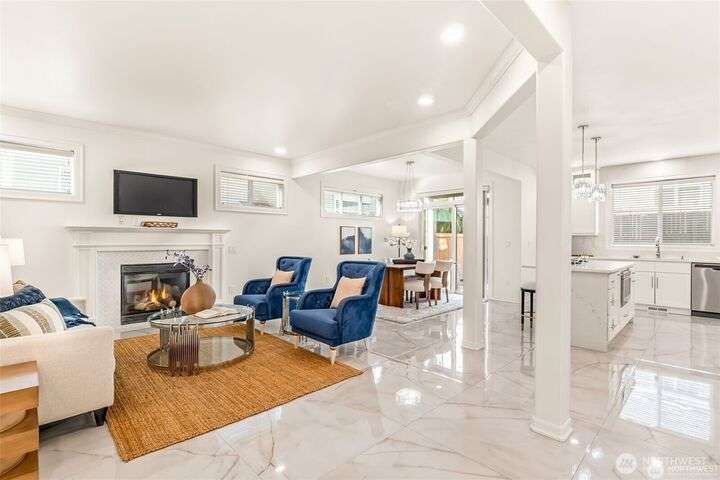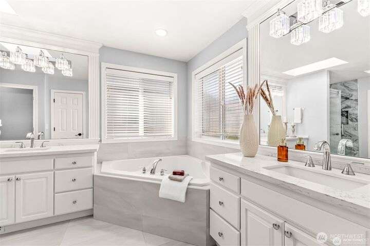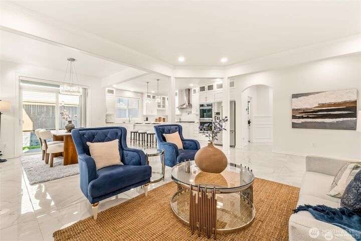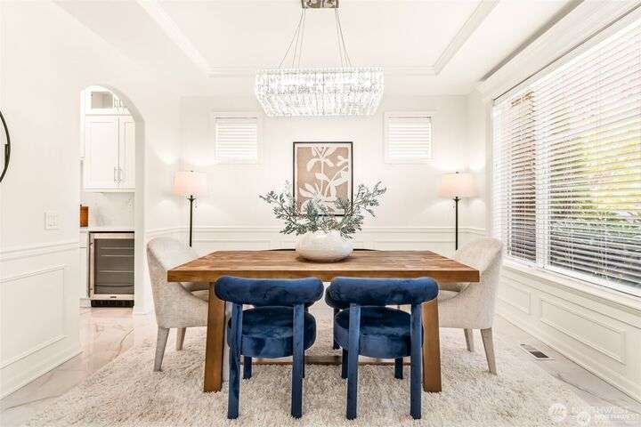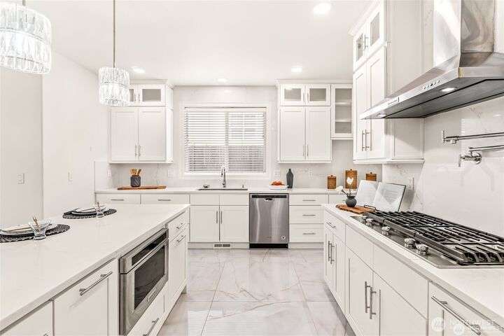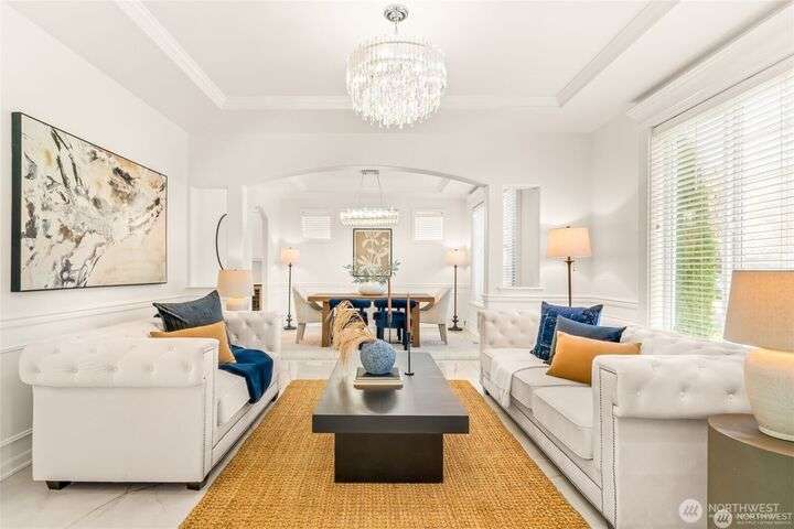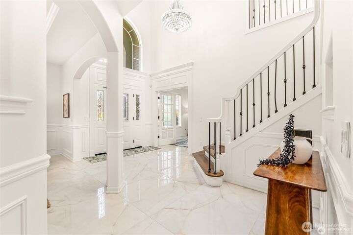 Imagine walking into this stunning East-facing luxury home while sunlight streams through the skylights onto gleaming genuine Marble floors and vaulted ceilings, French doors, illuminating custom cabinetry and dazzling chandeliers. The gourmet kitchen inspires with marble countertops and state of the art appliances. Be pampered with spa inspired bathrooms equipped with heated seats, jetted tubs, and bidets. While the primary suite spoils you adding a 5-piece ensuite and cozy fireplace. Large bedroom/office on main floor in addition to the 5 bedrooms upstairs make this ideal for generational living, guests, or home office. Top rated schools, shopping, restaurants and close to everything!