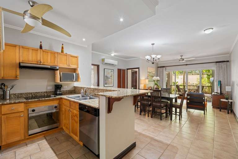 The main living area features an open layout with large sliding glass doors that flow seamlessly onto a spacious covered terrace—perfect for morning coffee or relaxing in the afternoon while enjoying forest views where monkeys often make an appearance. The kitchen includes granite countertops, hardwood cabinets, and newer stainless steel appliances, including refrigerator, stovetop, AC, and hot water heater, plus direct access to a laundry and storage area.