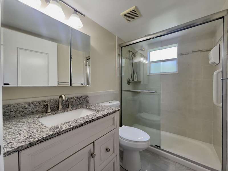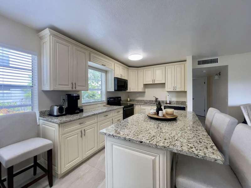 Beautiful First Floor Remodeled condo. 2 Bedroom , 2 Bath. Gorgeous kitchen with real wood soft close cabinetry, Stylish Island, Great storage & Pantry space. Granite counters w/modern appliances. Porcelain tile floors. Completely updated bathrooms & relaxing enclosed Patio space..New Plumbing, & New electrical. This is a beautiful unit, a great location and terrific value.