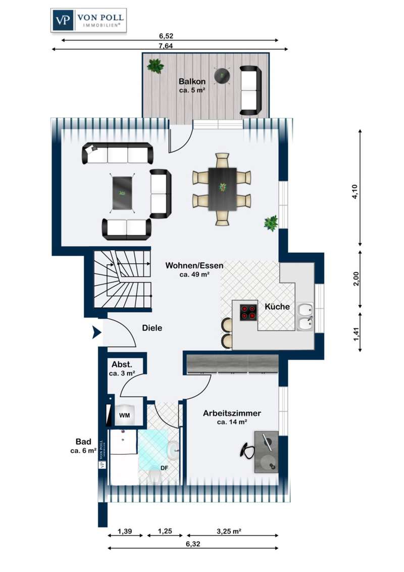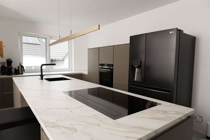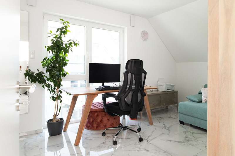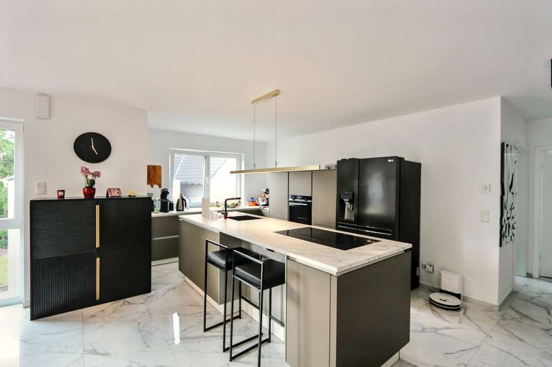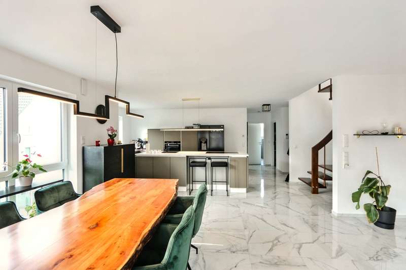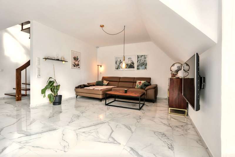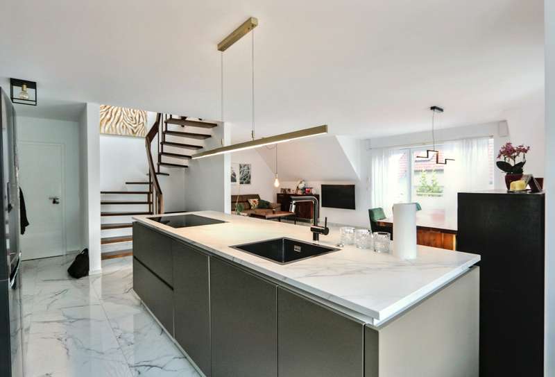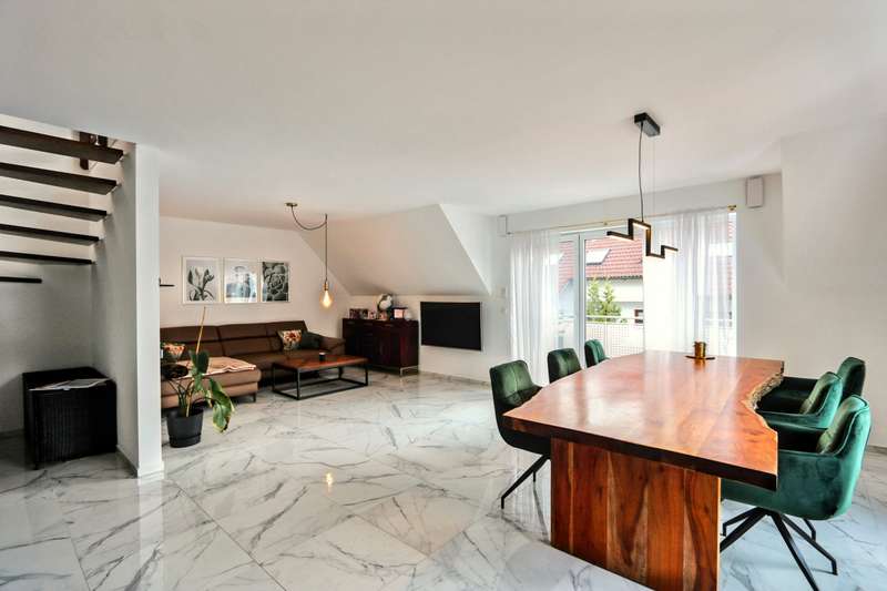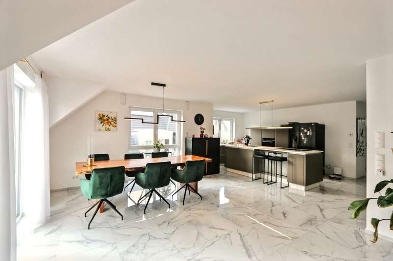 This modern apartment, built in 2021, boasts high-quality fittings, a well thought-out floor plan and a generous living space of approx. 103 m² spread over two levels. With a total of four rooms, it offers plenty of space for couples, families or professionals who need to work from home. The spacious living and dining area is located in the lower part of the apartment, which impresses with its brightness and openness. From here, you have direct access to the covered, large balcony, which invites you to relax outdoors. The elegant marble floor gives this area an elegant touch and underlines the upscale living ambience. The high-quality, open-plan kitchen has a modern design and blends harmoniously into the living area - ideal for sociable cooking and evenings together. An additional room can be used flexibly as a study or second bedroom. The stylish guest bathroom is equipped with an open shower and WC. A storage room and further storage space in the adjoining stairwell provide additional storage options. The spacious bedroom with adjoining dressing room awaits you on the upper floor - a real highlight for anyone who values comfort and storage space. The large master bathroom is equipped with a bathtub, an open shower and a WC and offers a modern feel-good atmosphere. The apartment is located in a quiet and green residential area with good infrastructure and S-Bahn connections - ideal for anyone who wants to live close to the city and yet in the countryside. An underground parking space is included in the offer and ensures convenient parking. The passenger elevator takes you directly to the apartment entrance door. This attractive residential offer is rounded off by gas central heating from 2018 and high-quality fixtures and fittings that leave nothing to be desired.