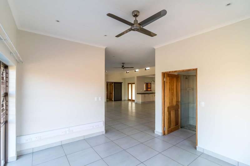 The upper level further hosts a large main bedroom with walk in dressing area and full bathroom and sunroom with bathroom en suite which open via stacking doors, onto a huge covered patio with built in braai and views over tranquil green belt and studio / home office.