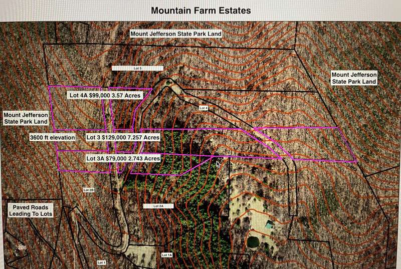 Mountain Farm Estates is a small community of 9 homesites offering big views at over 3,600 feet elevation yet only minutes to downtown West Jefferson. With 3 sides of the development surrounded by Mount Jefferson State Park lands, there are protected views and privacy. Paved roads lead to all lots. This 7.3-acre homesite has a gently sloping build spot with panoramic views and additional acreage to protect your views across the neighborhood. Light restrictions include a 1,200 square foot minimum to build with no modular or mobile homes allowed. The location is convenient to many Blue Ridge Mountain recreational destinations. Call today for additional information on our listing J250.