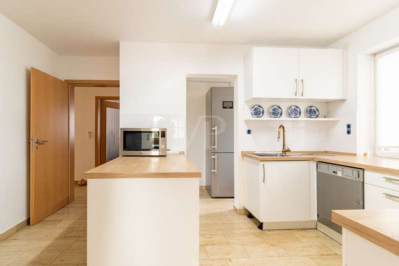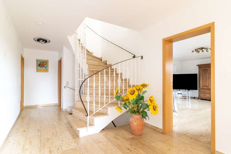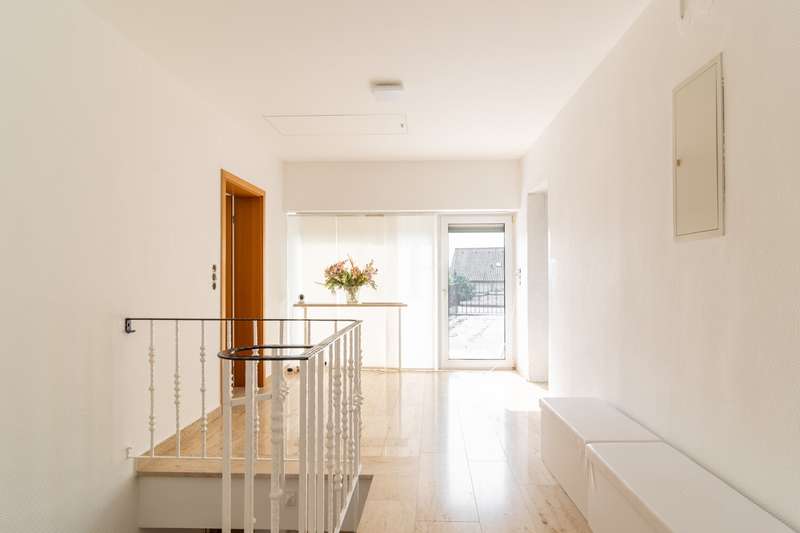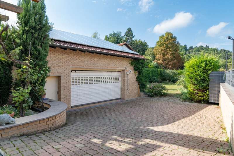 A remarkable combination of residential building, office extension and hall stands on a spacious plot in a quiet and mature residential area. Living, working and hobbies can be ideally combined here. Construction of the house began in 1983. The last work was carried out in 1995 to bring the property up to its current state. The house offers approx. 177 m² of living space on the ground floor and top floor and approx. 79 m² of usable space in the basement, part of which has been converted into living space. From the street, a few steps lead up to the entrance area of the house. Behind the entrance is the spacious living/dining area, which is laid out with Jura marble. Large windows create a bright atmosphere. The adjoining kitchen offers a fitted kitchen and direct access to the pantry. There is a further room for individual use as well as a guest WC with shower. An office wing has been added to the left of the entrance area. This is both accessible from the outside - which is ideal for customer traffic - and connected to the first floor via the hallway. The approximately 55 m² of commercial floor space is divided into an office room with large windows and a file room. On the top floor, a large master bedroom provides access to the south-facing balcony. One room is designed as a walk-through room with a bedroom at the rear. It could be separated. With a further room next to the marble-tiled shower room, you would then have up to four separate rooms of different sizes at your disposal. Three of the rooms are already equipped with air conditioning units. Due to the layout of the plot, the basement is at ground level with the courtyard, the carport, the hall and the garden. It therefore made sense to convert part of the basement into a living space and use it as a separate living unit for the family. The bedroom, the living/dining area, the kitchen with pantry and the shower room have windows that allow a view of the spacious courtyard. There is also a storage room and boiler room on this level, as well as the former garage, which now serves as a spacious storage room. A spacious roof was installed between the residential building and the hall to enable dry storage of materials. In addition, a hall with approx. 94 m² of usable space was built in 1995. It is equipped with a shower toilet and offers additional storage space in the attic. The hall is ideal for parking vintage cars, motorcycles or any other use. There is a 25 kWp photovoltaic system on the roof of the hall. The electricity from this stand-alone system is used by some of the appliances in the house and is not fed into the public grid. The garden is located behind the hall. This can be used as a play or recreational area. The entire property is not very visible due to the elaborate fencing, buildings and planting and offers a lot of privacy. The offer includes a separate plot of approx. 53 m² opposite the courtyard entrance. It can be used as an additional parking space for customers or guests or as an additional maneuvering space for your larger vehicles.