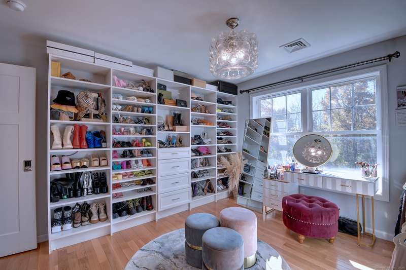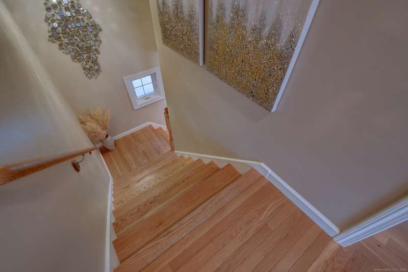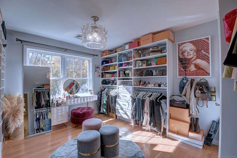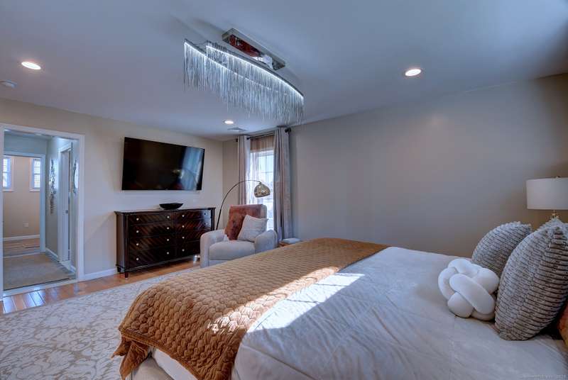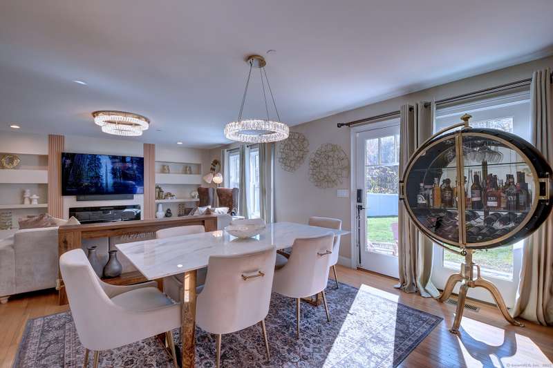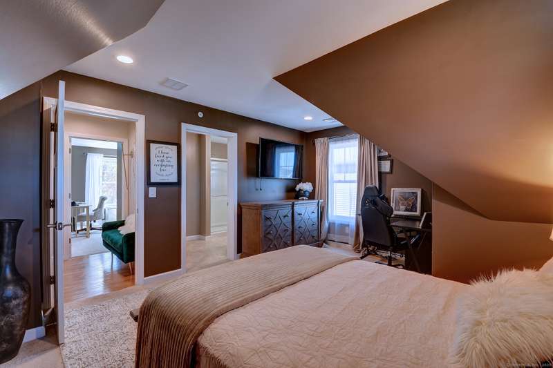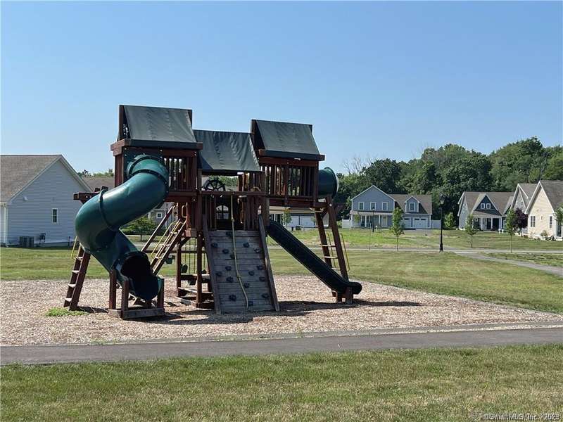 Stunning freestanding unit at The Villages at Poquonock with many premium upgrades and beautiful natural light. The pretty & functional foyer opens to an open floor plan featuring an island kitchen with high end appliances, a dining area with sliders to the back patio, and a living area with a spectacular modern feature wall with a centrally mounted flat-screen TV and cozy electric fireplace flanked by recessed shelves for a clean, custom look. Upstairs, the elegant primary suite has hardwood floors, a beautiful en-suite bath, and generous closets. The walk-in closet has been tranformed into a spa-like tub room but the seller plans to remove the tub and reinstall the closet shelving. One bedroom is being used as a closet/dressing room but will be restored to a bedroom - also with hardwood floors. Two additional bedrooms, a full bath, and a laundry closet complete the 2nd floor. The full basement is clean, dry, and unfinished. The deep yard backs to woods for additional privacy and is f