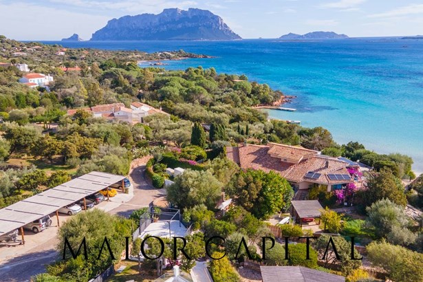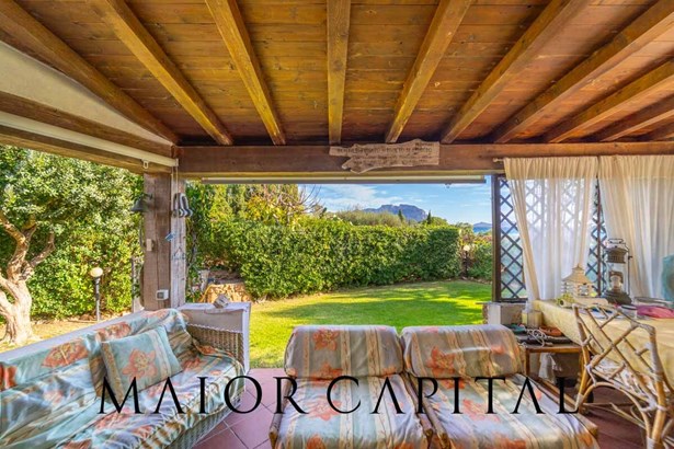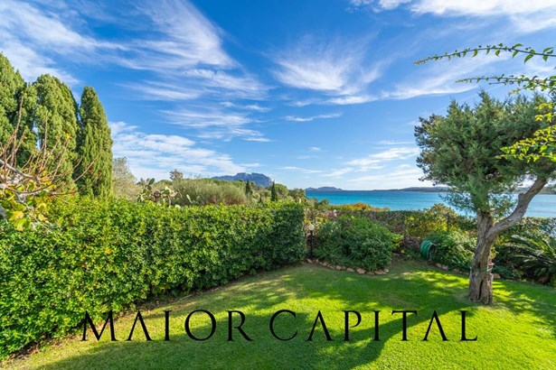 The house, which is on a single level, is nestled in a garden with green grass and has a large veranda that offers a breathtaking view of the sea and Tavolara Island.