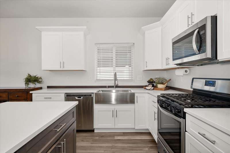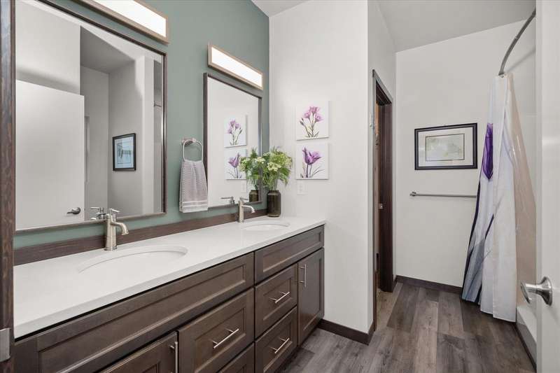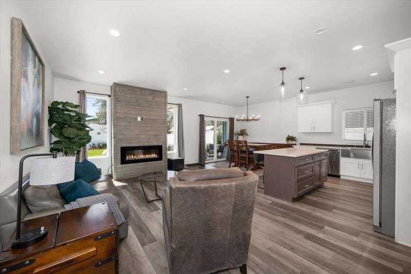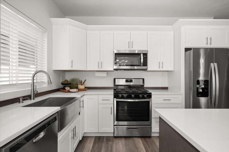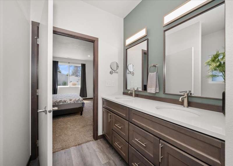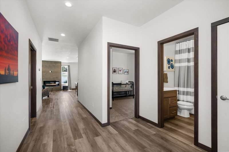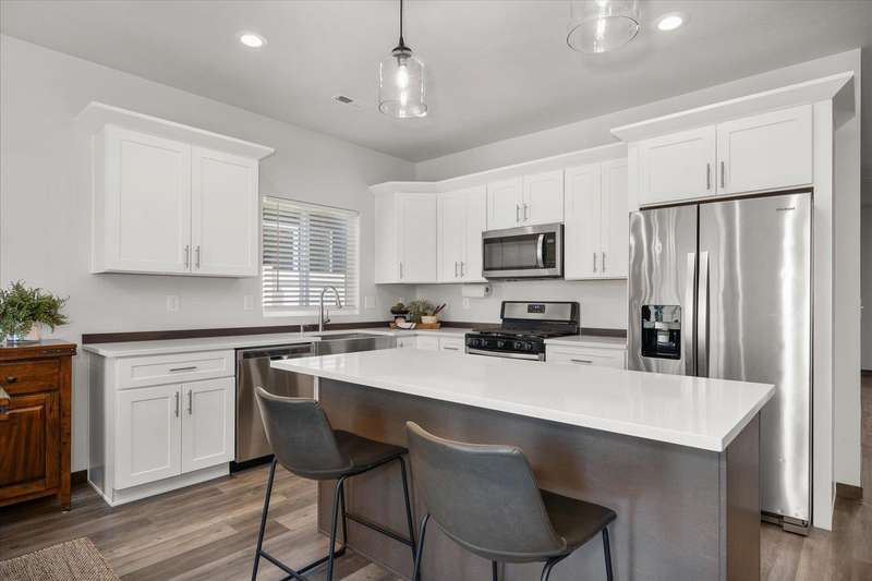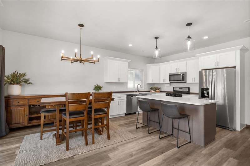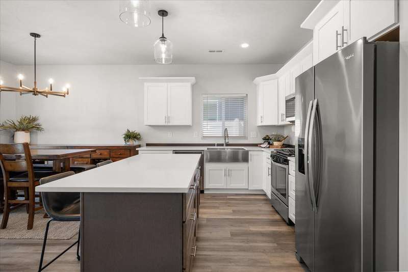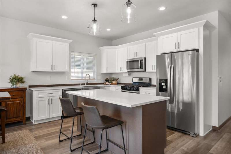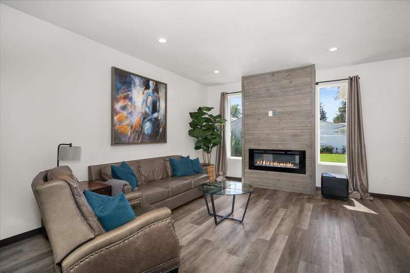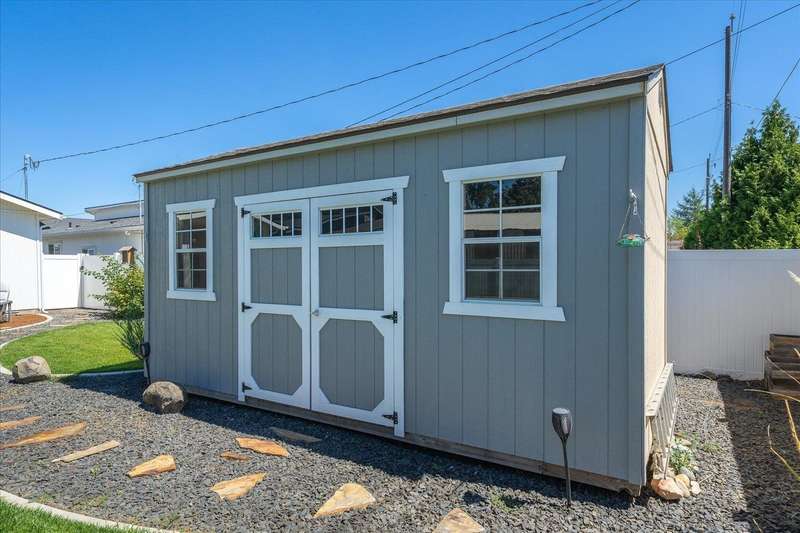 Stunning turn-key South Hill modern farmhouse with zero-step entry! This like-new, single-owner home has an open layout with 9’ ceilings, abundant natural light, and contemporary custom finishes. Enjoy quartz countertops, soft-close cabinetry, a farmhouse sink, stainless appliances including a gas range, quiet dishwasher, and fridge, plus a spacious island for entertaining. LVP flooring flows through the home, leading to a cozy electric fireplace with custom feature wall. The large primary suite offers a walk-in closet and double-sink vanity with walk-in shower. Extras include Nest thermostat, Ring doorbell, MyQ smart garage, and smart washer/dryer with utility sink and storage. Fully fenced backyard oasis with covered patio, concrete curbing, sprinklers, 10x18 shed, and raised garden beds. Insulated garage with 8' door and windows. Truly a must-see home in a fantastic location!