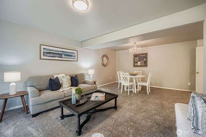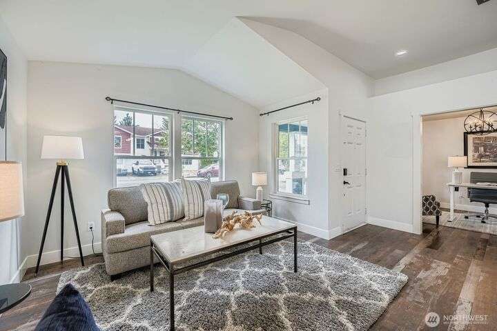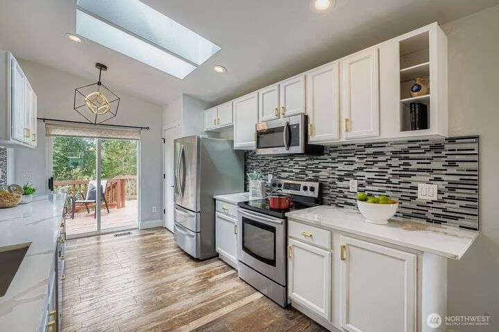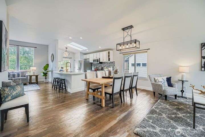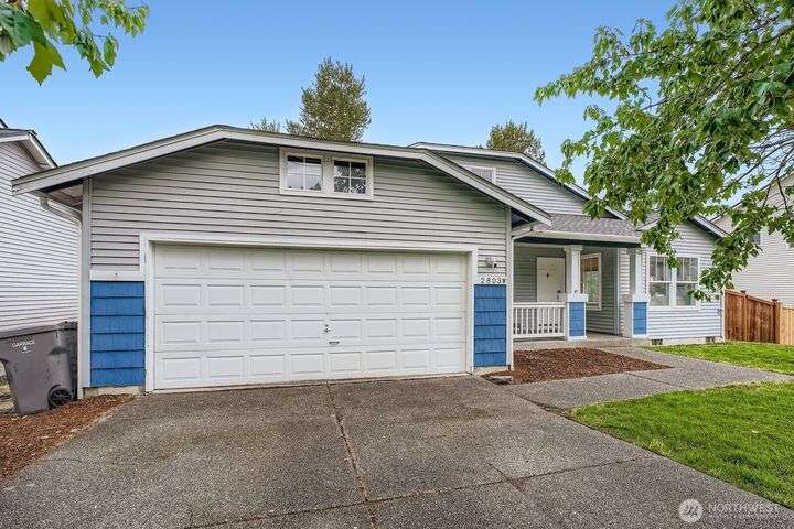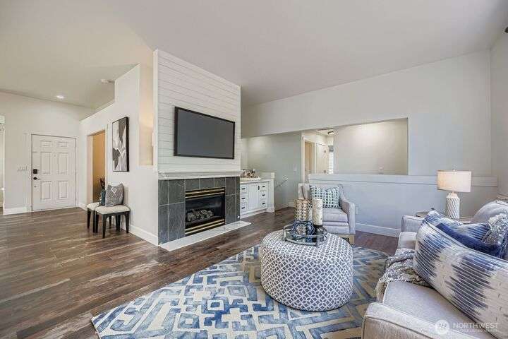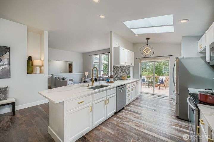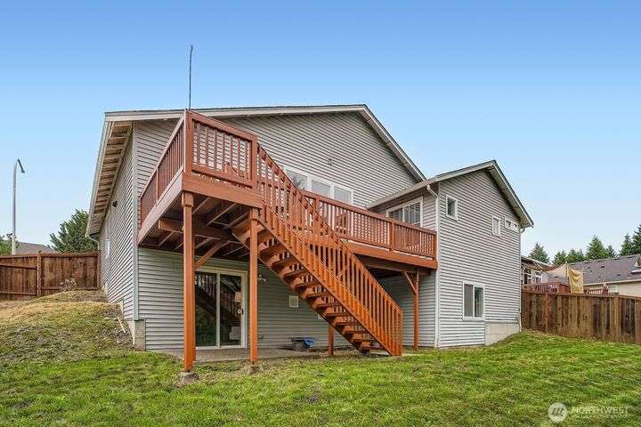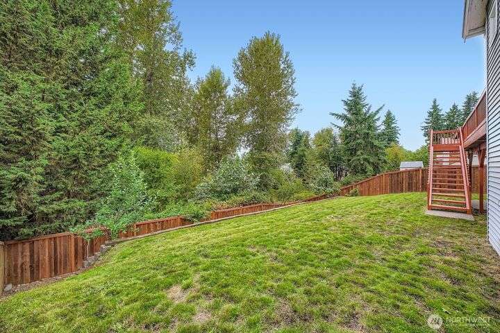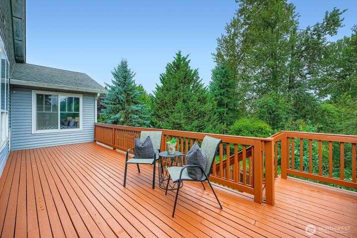 One story with a full finished daylight basement offers loads of square footage and backs to private open space (owned by HOA) Spacious main floor has a den/office just inside the front door, a great work from home space. Open kitchen features white cabinets and quartz counter tops. Large adjoining living room and family room with a gas fireplace for cozy evenings at home. Main floor primary suite has a private bathroom and walk-in closet. Stylish distressed wood look laminate flooring throughout the main level. Basement has a huge rec room, two bedrooms, a full bathroom and a bonus room that would make a great home gym or theater room. Fully fenced backyard has a party sized deck with stairs to the yard all backing up to wooded privacy