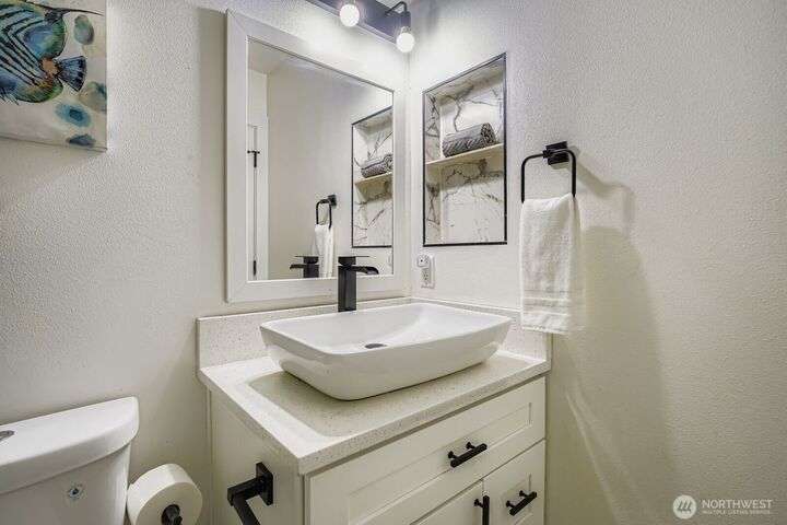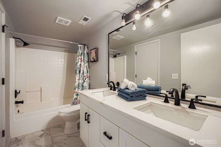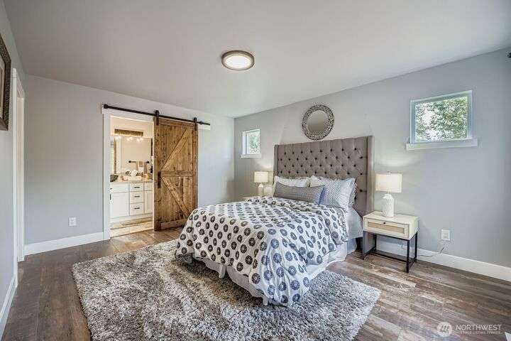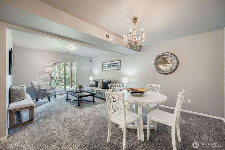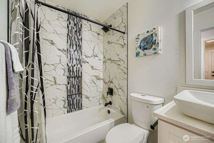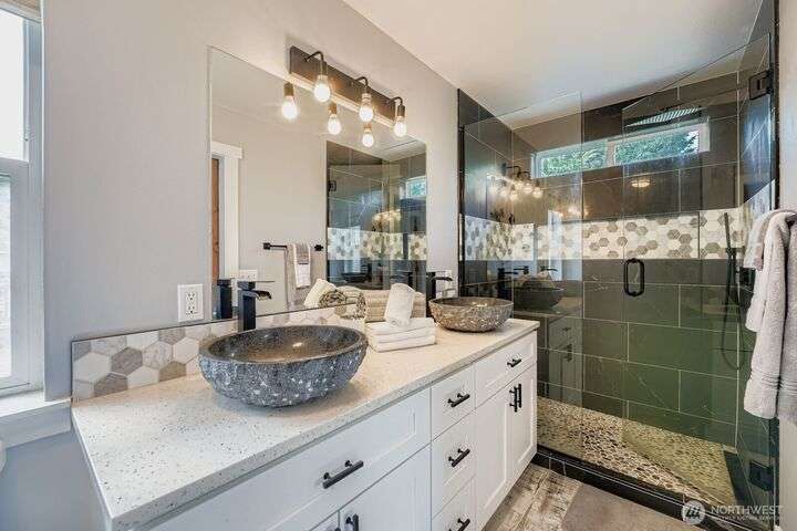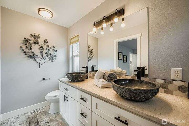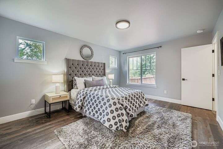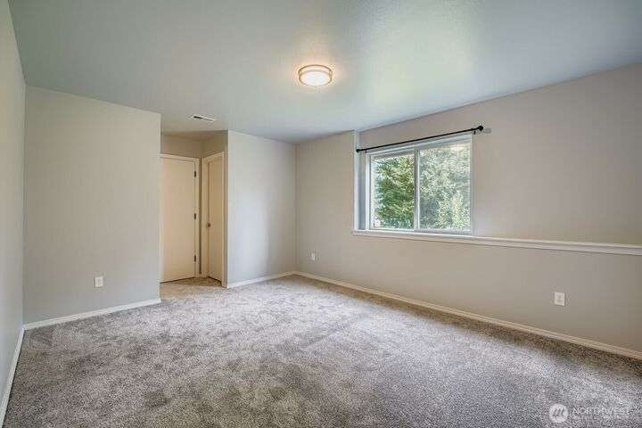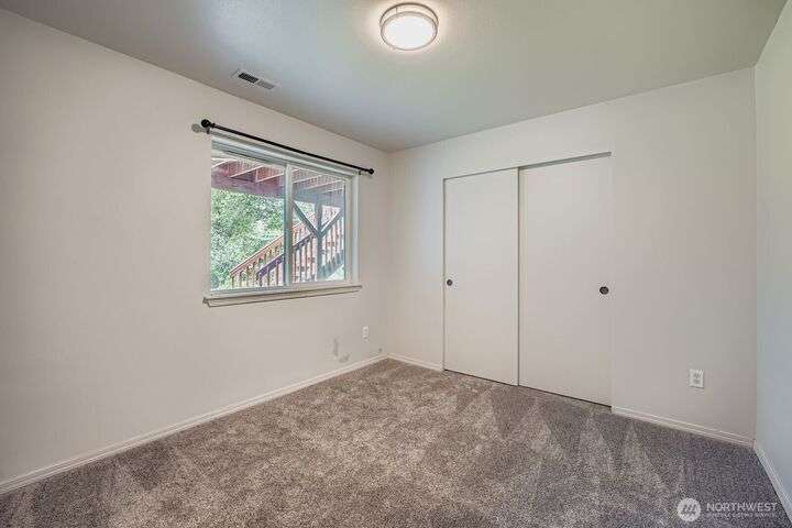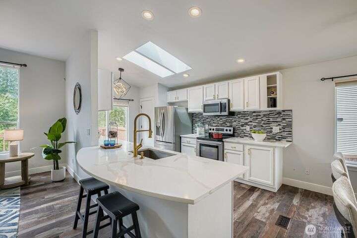 One story with a full finished daylight basement offers loads of square footage and backs to private open space (owned by HOA) Spacious main floor has a den/office just inside the front door, a great work from home space. Open kitchen features white cabinets and quartz counter tops. Large adjoining living room and family room with a gas fireplace for cozy evenings at home. Main floor primary suite has a private bathroom and walk-in closet. Stylish distressed wood look laminate flooring throughout the main level. Basement has a huge rec room, two bedrooms, a full bathroom and a bonus room that would make a great home gym or theater room. Fully fenced backyard has a party sized deck with stairs to the yard all backing up to wooded privacy