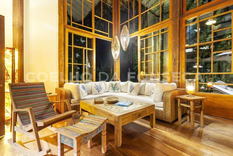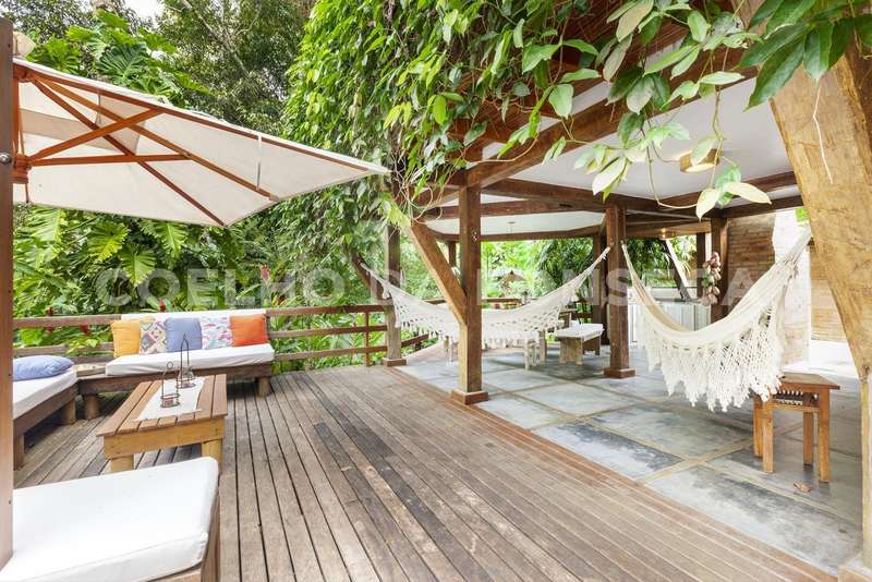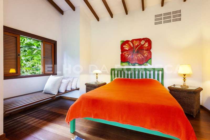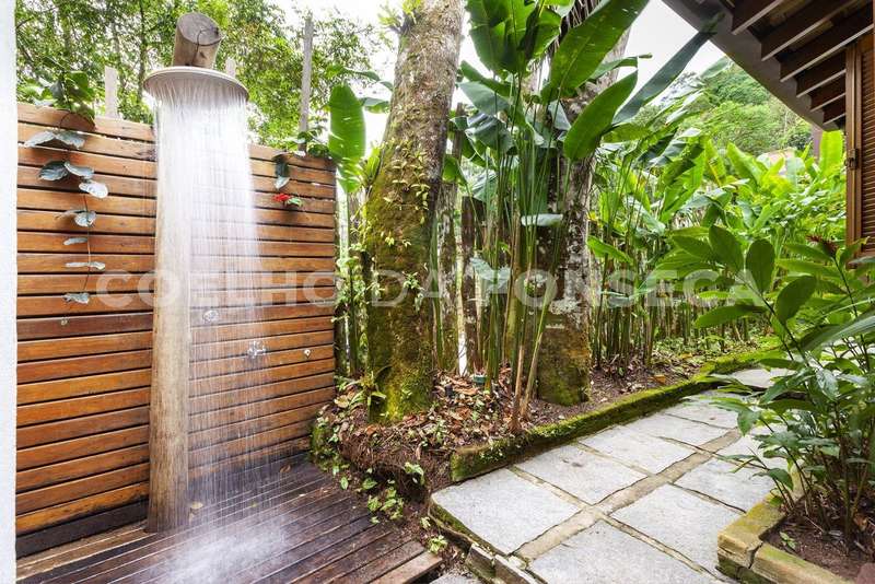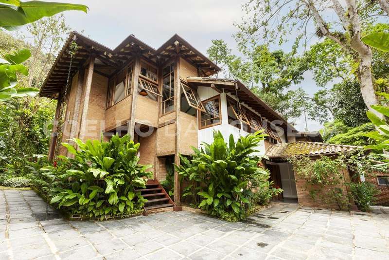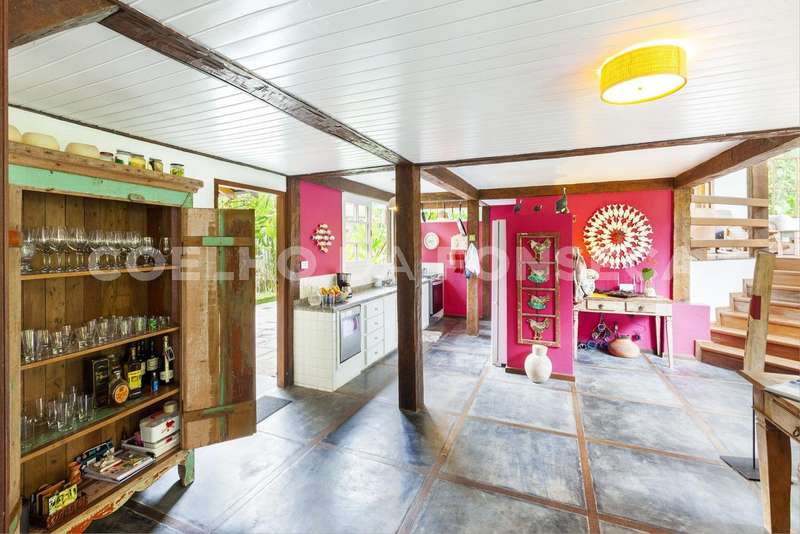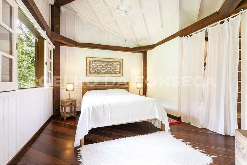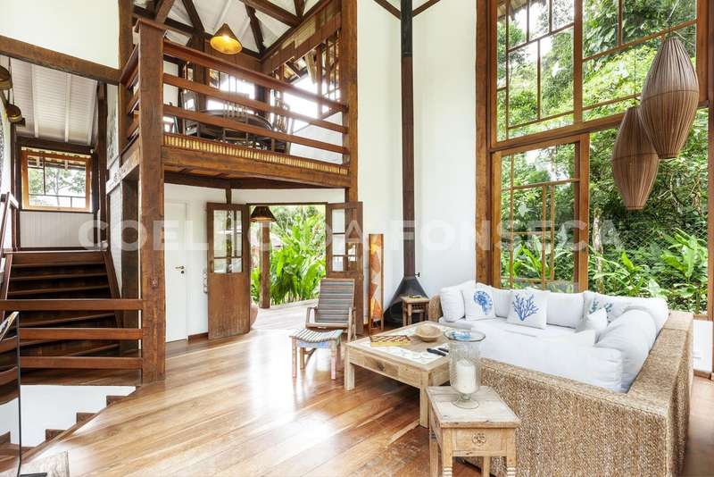 Casa muito charmosa, toda em madeira e vidro, com projeto do arquiteto Guy Mattos. Ambientes amplos e integrados ao lindo jardim, projeto de Gil Fialho, cercada pela Mata Atlântica. Ao lado, cachoeira e rio represado, transformado em piscina natural. Muitos tucanos e pássaros variados. Última casa em rua sem saída, segura, a 10 minutos da bela e exclusiva parte sul da praia. Cozinha aberta, integrada à sala de jantar, espaço gourmet com churrasqueira. Área de escritório com vista para o mar. Vale a pena visitar!