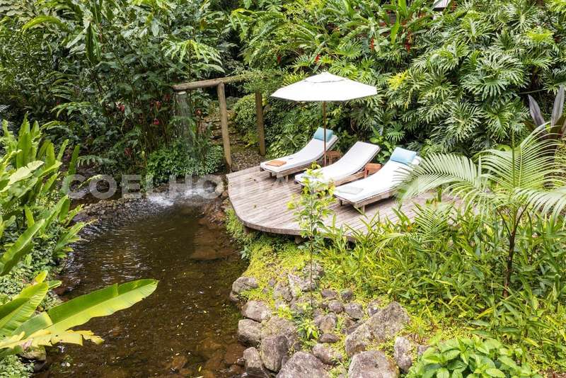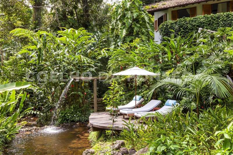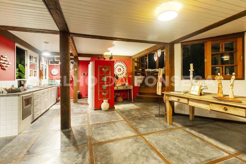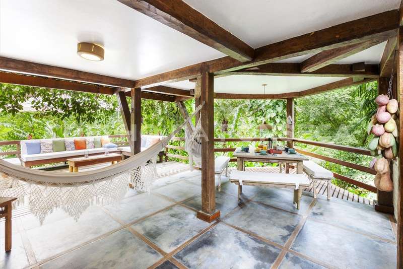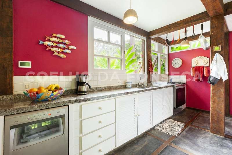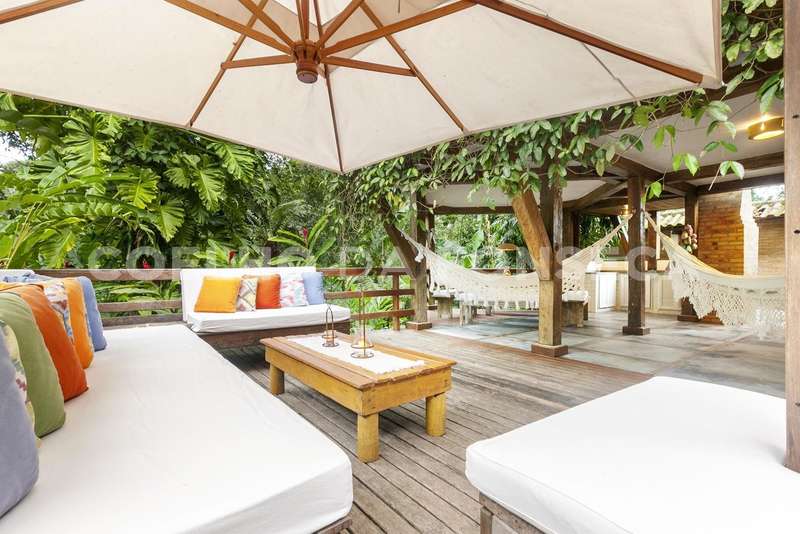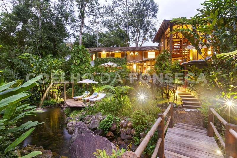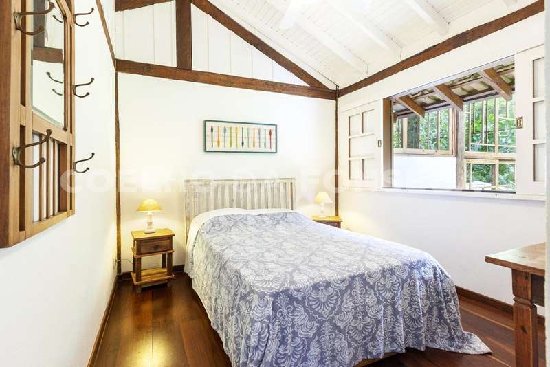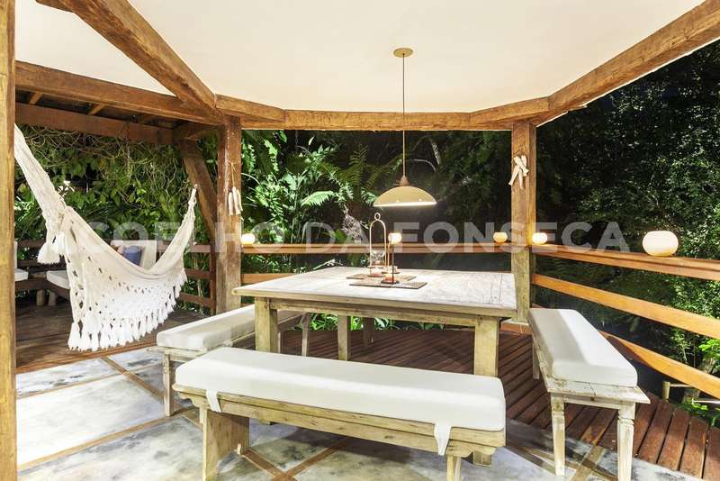 Casa muito charmosa, toda em madeira e vidro, com projeto do arquiteto Guy Mattos. Ambientes amplos e integrados ao lindo jardim, projeto de Gil Fialho, cercada pela Mata Atlântica. Ao lado, cachoeira e rio represado, transformado em piscina natural. Muitos tucanos e pássaros variados. Última casa em rua sem saída, segura, a 10 minutos da bela e exclusiva parte sul da praia. Cozinha aberta, integrada à sala de jantar, espaço gourmet com churrasqueira. Área de escritório com vista para o mar. Vale a pena visitar!