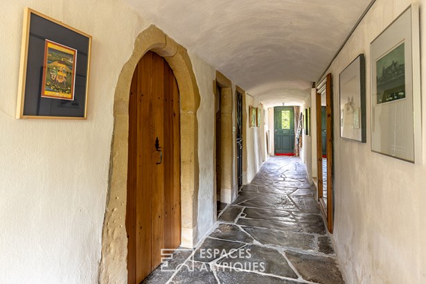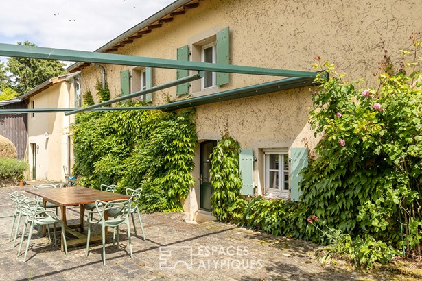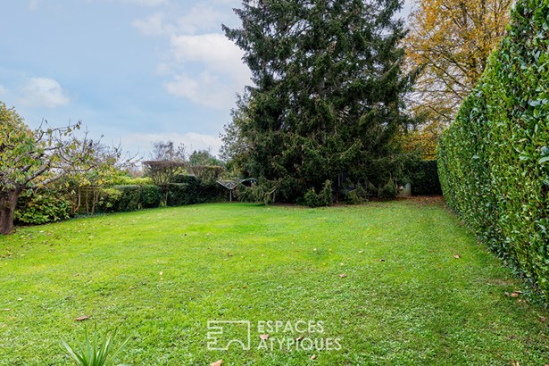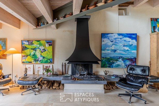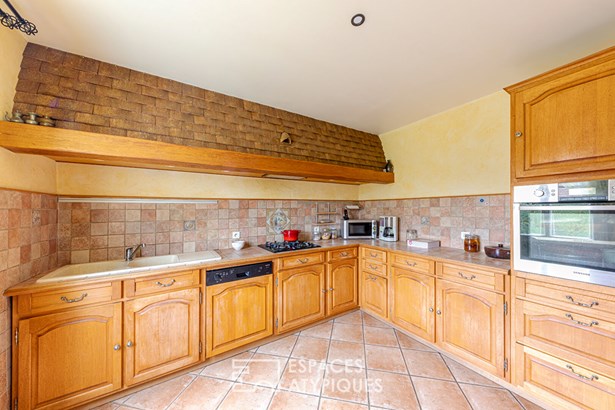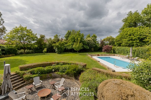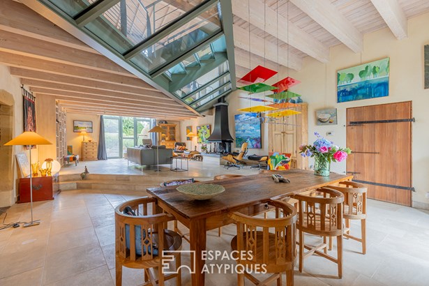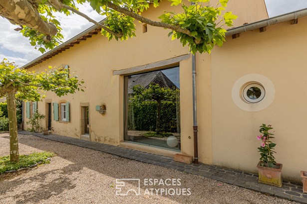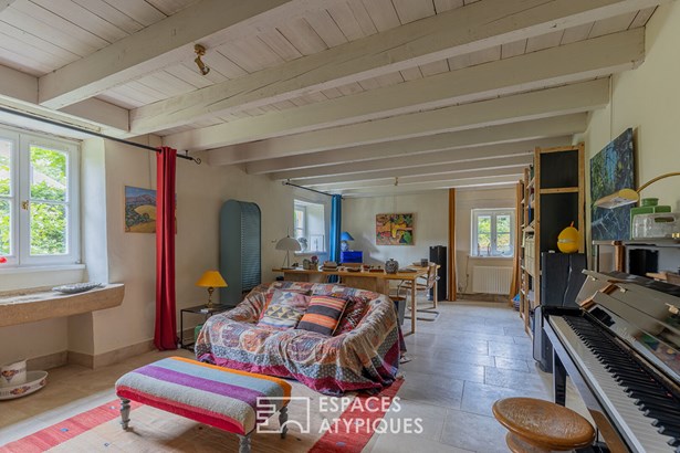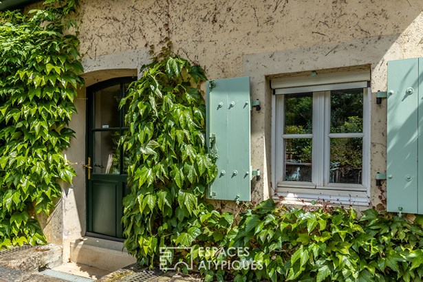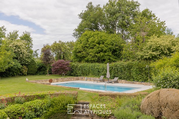 Outside, the carefully maintained landscaped garden features a swimming pool that blends harmoniously into the bucolic surroundings. The enclosed, wooded grounds guarantee peace and privacy. A double garage completes the property, while a separate extension also offers the possibility of setting up a professional practice. The choice of natural materials, such as old wood, Burgundy stone and lime plaster, is in keeping with an ecological and heritage-conscious approach.