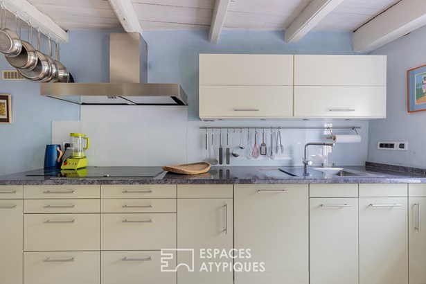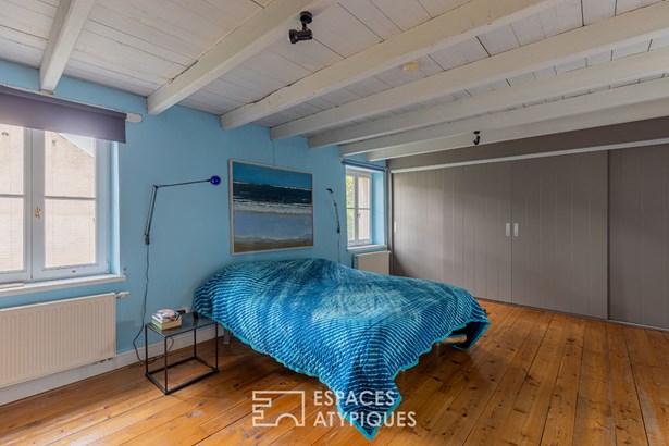 The charm is evident as soon as you walk through the door. A vast entrance hall with high ceilings sets the tone for a place where the authenticity of the building has been enhanced. The main living area, bathed in light, covers 82 m2 and features a charming fireplace in the centre. The partially glazed ceiling offers a glimpse of the upper floor and creates an elegant visual connection between the levels. The separate kitchen adjoins this space. Next to it is a dining room and a small lounge that can also be used as an office or bedroom. A pantry/cellar completes this level.