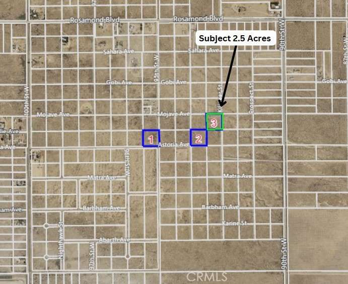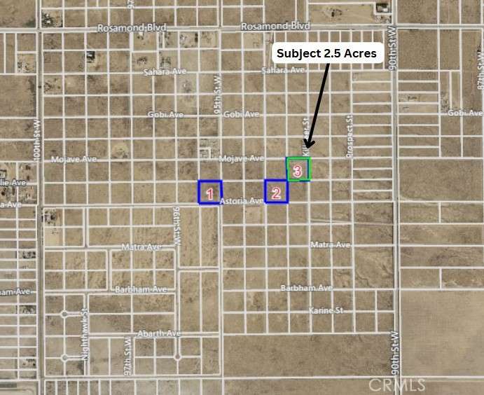 Explore the possibilities with this 2.5-acre parcel, ideally flat and usable for a range of projects. Perfectly suited for building a private ranch, this property is conveniently located just off Rosamond Blvd. It offers expansive panoramic views of the valley and mountains, enhancing its serene rural appeal. A great investment opportunity, enjoy proximity to Willow Springs Racetrack and easy access to the nearby towns of Rosamond, Lancaster, and Tehachapi, CA.