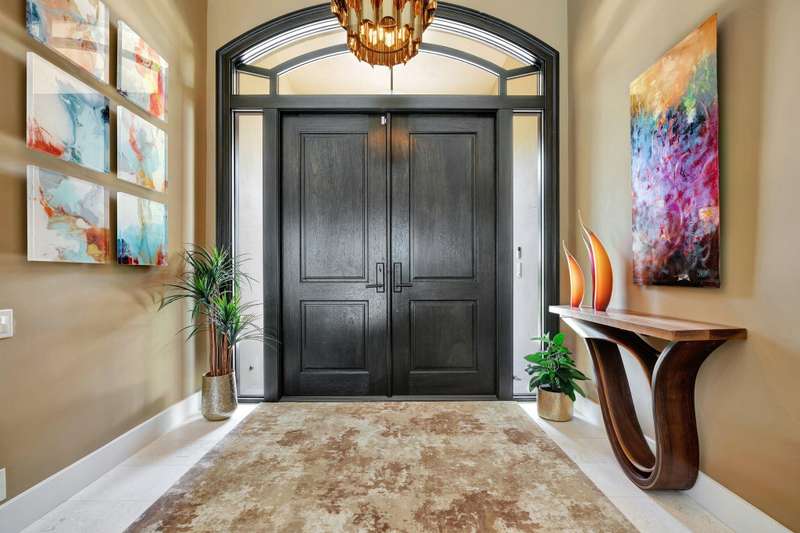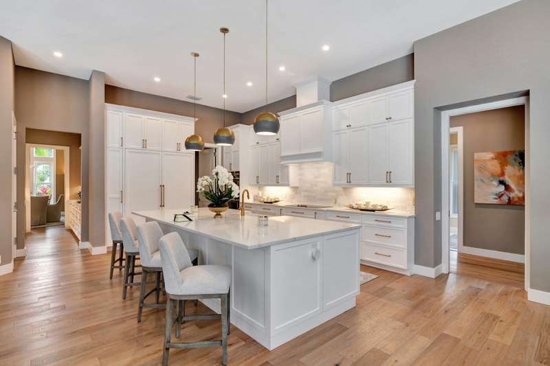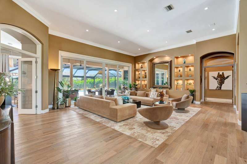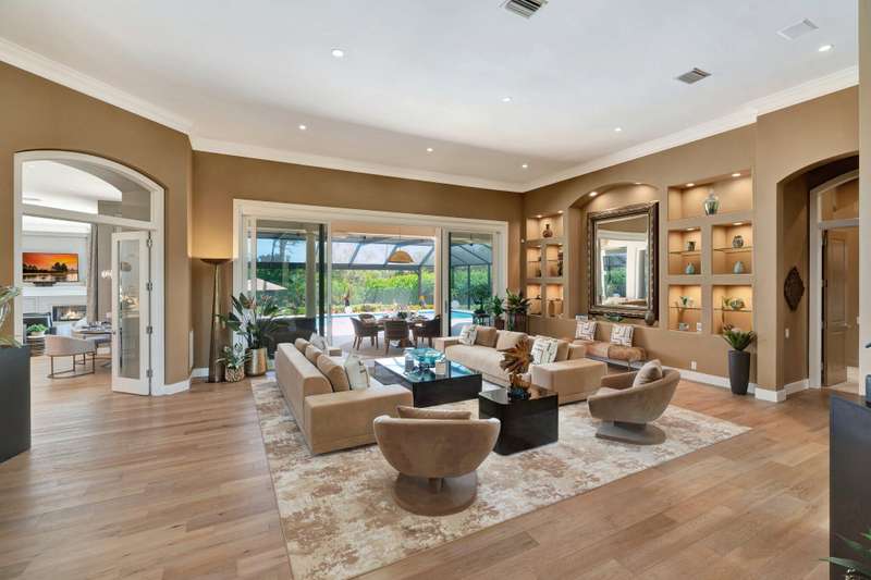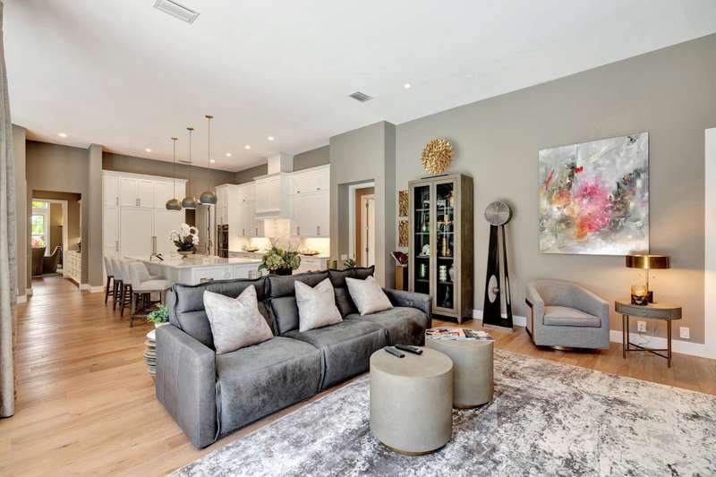 LIKE NEW CONSTRUCTION, RH FURNISHED! it is truly a perfect blend of elegance , comfort, and style, making it an ideal sanctuary for both relaxation and entertaining. This impeccably designed residence features sandy blonde wood floors and exquisite designer furnishings , all situated in a prime location overlooking a legendary golf course. A Stunning remodel by RJS Construction, open and bright floorplan with 4 bedrooms on ground level including a spectacular primary suite. The primary suite is an oasis of pleasure with regal designer finishes and rich colors, complemented by plantation shutters, and window treatments that add warmth and sophistication. Chef's kitchen with top of line appliances, Butler's pantry, wet bar, and huge island with seating with a gorgeous view. (cont)
