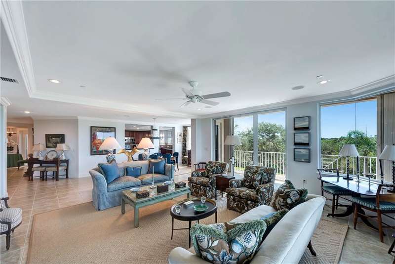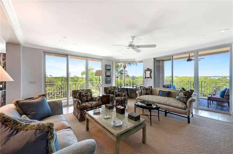Unparalleled river and preserve views! Beautifully remodeled residence offers an open floor plan with a private elevator that opens into a grand foyer. The island kitchen boasts abundant cherry wood cabinetry. Spacious primary bedroom w/ sweeping river views. Tile floors flow throughout the home, leading to a large, covered wraparound balcony. Additional features incl. private 2-car garage, A/C storage closet, and pet-friendly policy w/no weight limit. Exclusive access to River Village pool & clubhouse included. Grand Harbor membership available w/approval. Sizes approx./subj. to error.