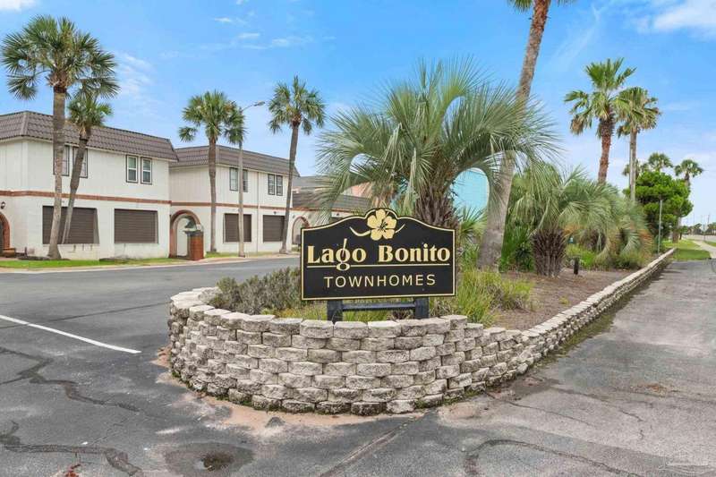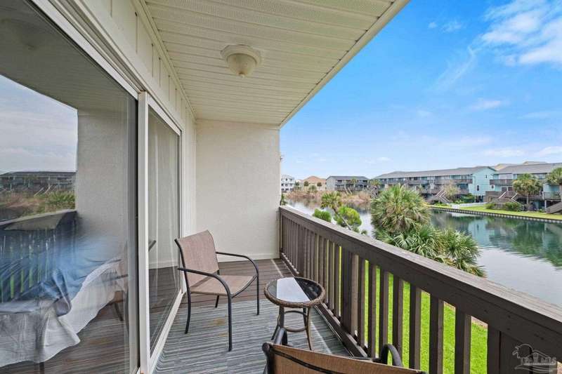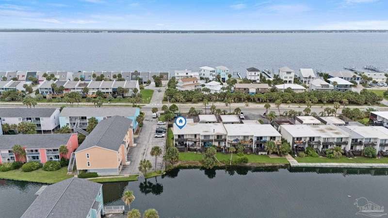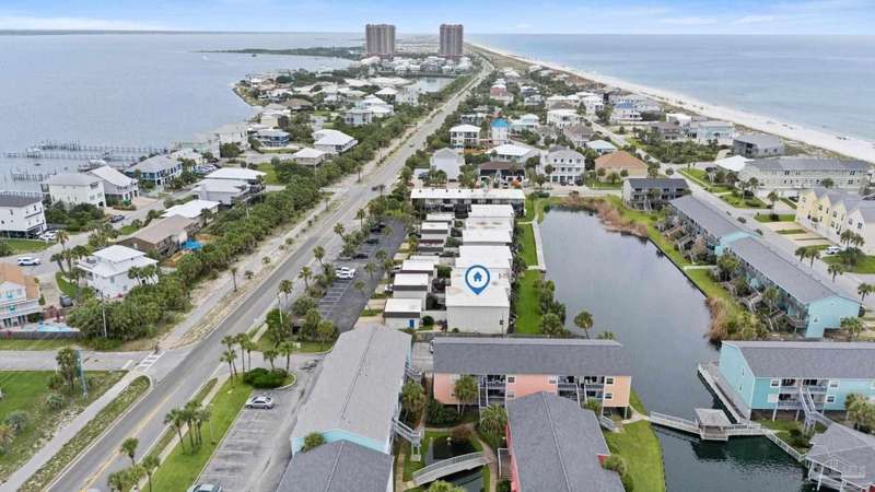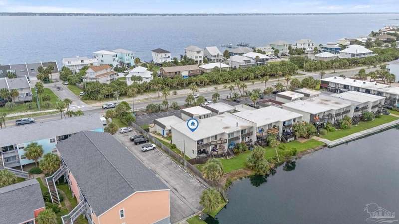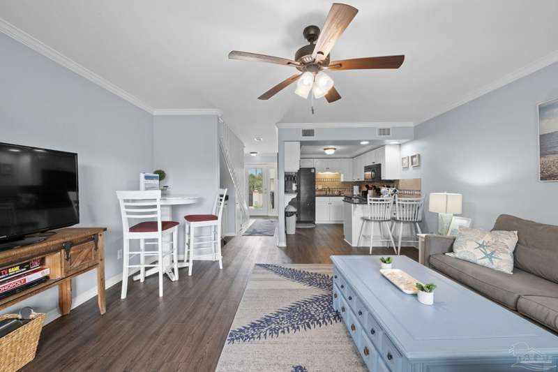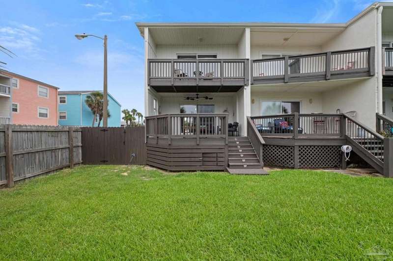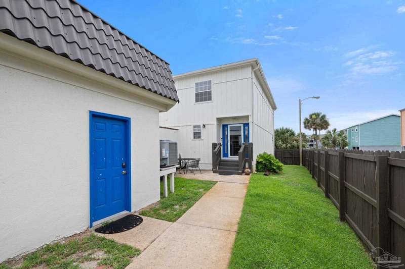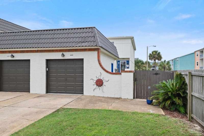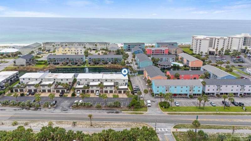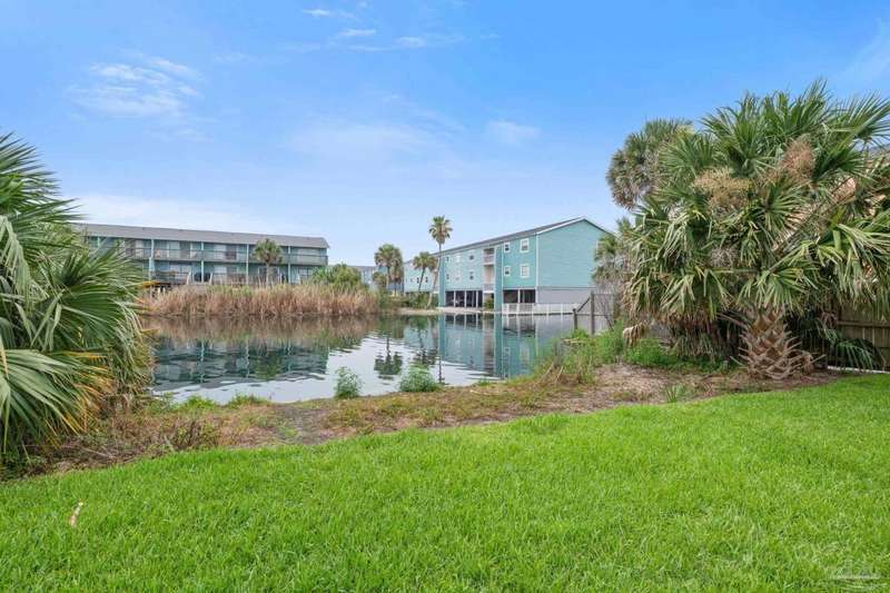 Welcome to your coastal retreat! This fully furnished, turn-key end unit townhome is located just a short, distance from the beautiful white sands of Pensacola Beach. Whether you're looking for a full-time home, vacation getaway, or income-generating rental, this thoughtfully maintained property offers flexibility, comfort, and convenience. Enter the home through your private courtyard, which features green space and a patio area perfect for visiting, relaxing, or grilling. This outdoor area provides a welcoming and private transition into the home. The home's layout is designed for both functionality and enjoyment. The downstairs level includes a spacious kitchen and living area offering views of the spring-fed lagoon. A dedicated work/study station is located just off the living room, providing a defined space for remote work, reading, or study. The deck off of the living area offers easy access to the back yard and beautiful views of the lagoon. Upstairs, the primary bedroom suite includes a beautiful view, an en-suite bathroom with double vanity, and ample storage. The primary suite opens to a spacious private deck for a quiet relaxation space. The second bedroom includes a double bed and a twin-over-full bunk, providing flexible accommodations for guests or family. The detached one-car garage includes laundry appliances and additional space to store beach equipment or personal items. Currently active on Airbnb, making it an attractive option for continued short-term rental use. It also transitions easily into a year-round residence.