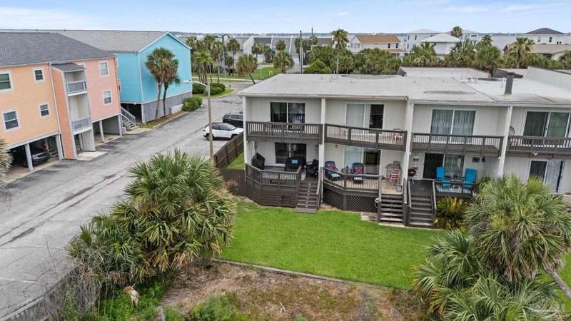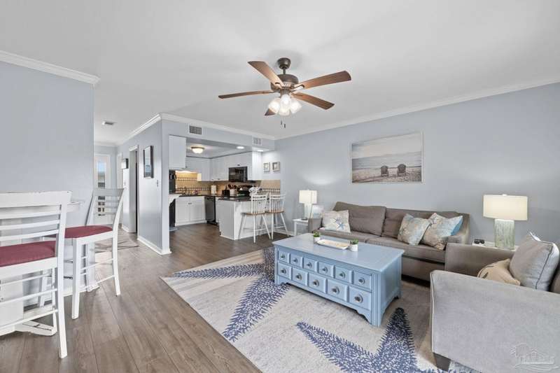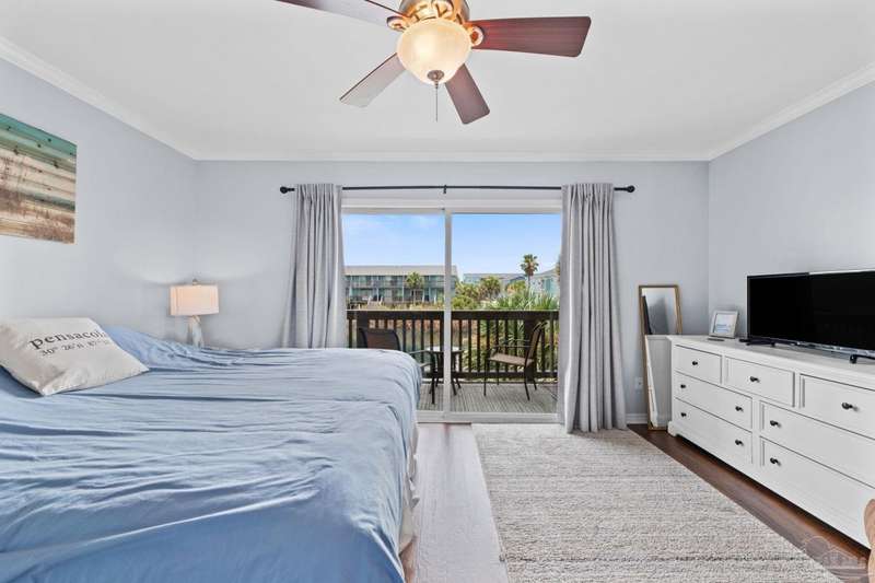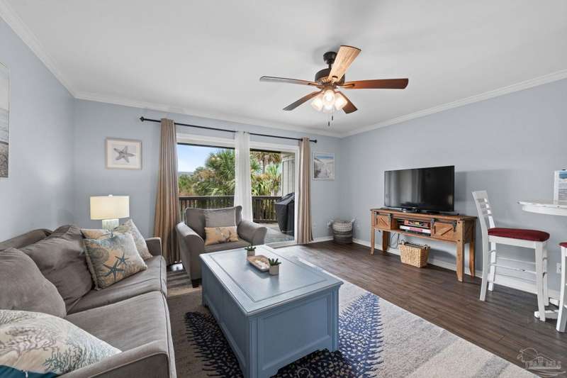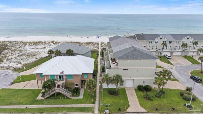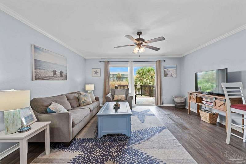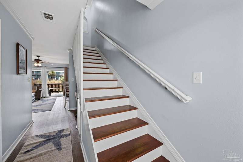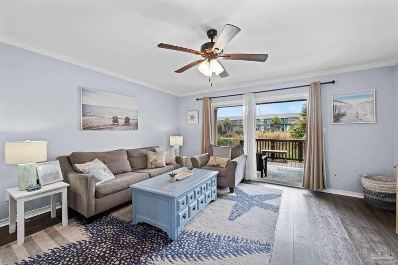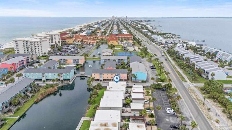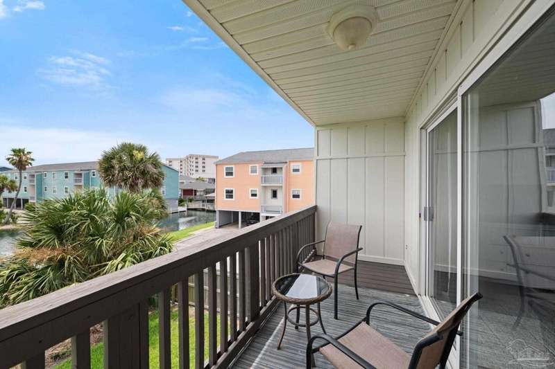 Welcome to your coastal retreat! This fully furnished, turn-key end unit townhome is located just a short, distance from the beautiful white sands of Pensacola Beach. Whether you're looking for a full-time home, vacation getaway, or income-generating rental, this thoughtfully maintained property offers flexibility, comfort, and convenience. Enter the home through your private courtyard, which features green space and a patio area perfect for visiting, relaxing, or grilling. This outdoor area provides a welcoming and private transition into the home. The home's layout is designed for both functionality and enjoyment. The downstairs level includes a spacious kitchen and living area offering views of the spring-fed lagoon. A dedicated work/study station is located just off the living room, providing a defined space for remote work, reading, or study. The deck off of the living area offers easy access to the back yard and beautiful views of the lagoon. Upstairs, the primary bedroom suite includes a beautiful view, an en-suite bathroom with double vanity, and ample storage. The primary suite opens to a spacious private deck for a quiet relaxation space. The second bedroom includes a double bed and a twin-over-full bunk, providing flexible accommodations for guests or family. The detached one-car garage includes laundry appliances and additional space to store beach equipment or personal items. Currently active on Airbnb, making it an attractive option for continued short-term rental use. It also transitions easily into a year-round residence.