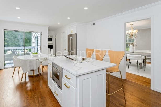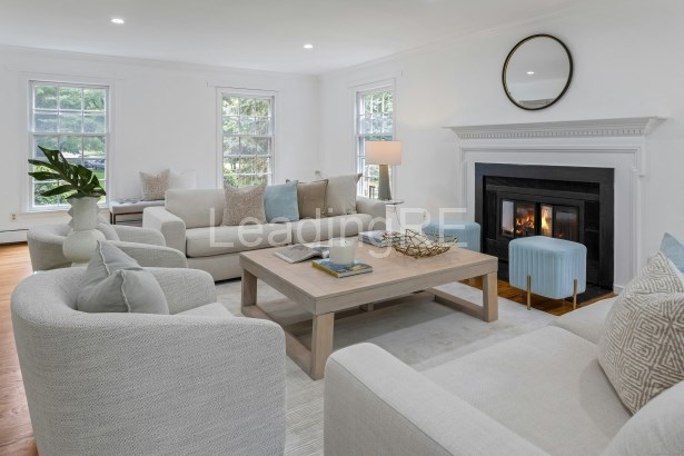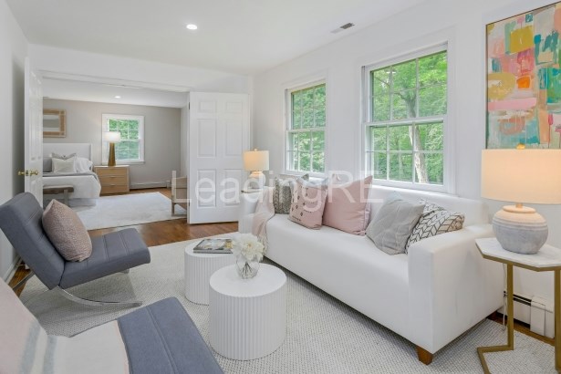 Just renovated to perfection, this 5BR, 3.5BA classic Connecticut colonial with extra 1900 square feet of finished lower level gives you over 5300 square feet of living area and is situated on a very private much sought-after cul de sac in New Canaan's loveliest areas of 4+ acres estates and properties. This home has it all. Beautiful quartz countertops in your new light filled family kitchen with custom cabinets and high end appliances, big island and breakfast room which leads through floor to ceiling glass sliders to your deck and connects to your huge family room with fireplace for ultimate gatherings. Upon entering the foyer, you find a lovely formal dining room, comfortable living room and wonderfully designed office with wood floors and bright windows looking onto your magic estate like private property. Newly renovated bathrooms grace 4 large bedrooms and laundry, with primary suite a sitting room (or nursery), walk-in closet, and a spa-like bath. The connecting and private entry in-law suite has a separate staircase with its own exterior entrance leading to a fifth bedroom suite with sitting room. The huge 1900 square feet of newly finished lower level with glass doors walking out to private patio and has a huge playroom/media room and additional lower-level family room. The 2-car attached garage and possible wine room gives entertaining a new meaning. All just minutes to town, train, and schools!