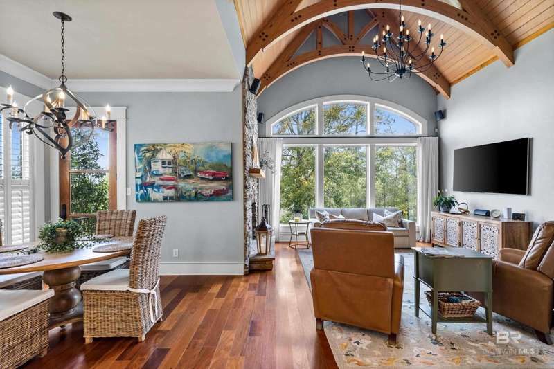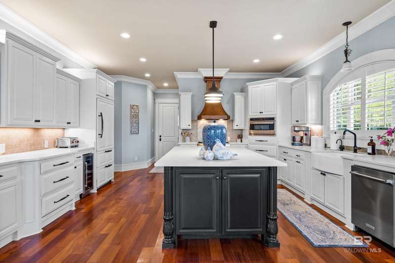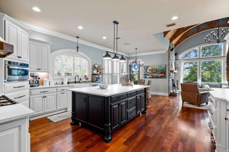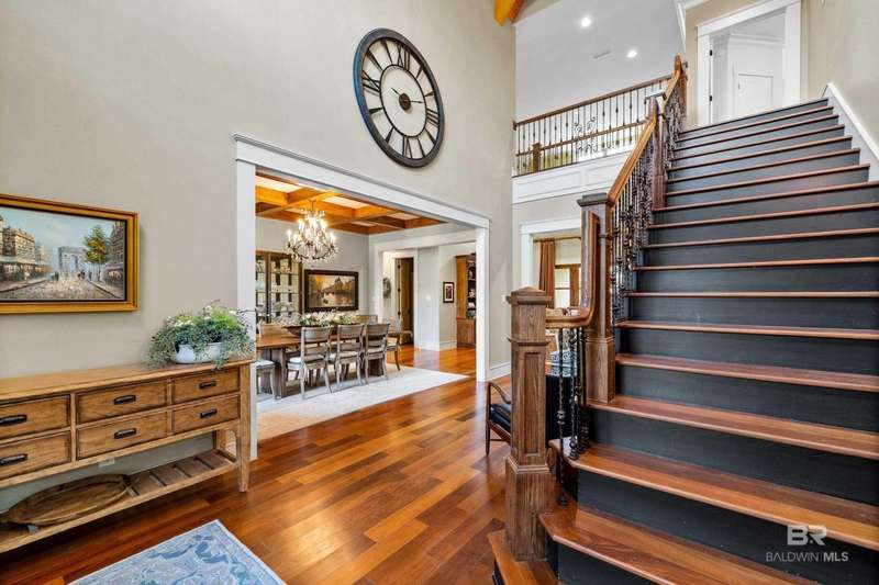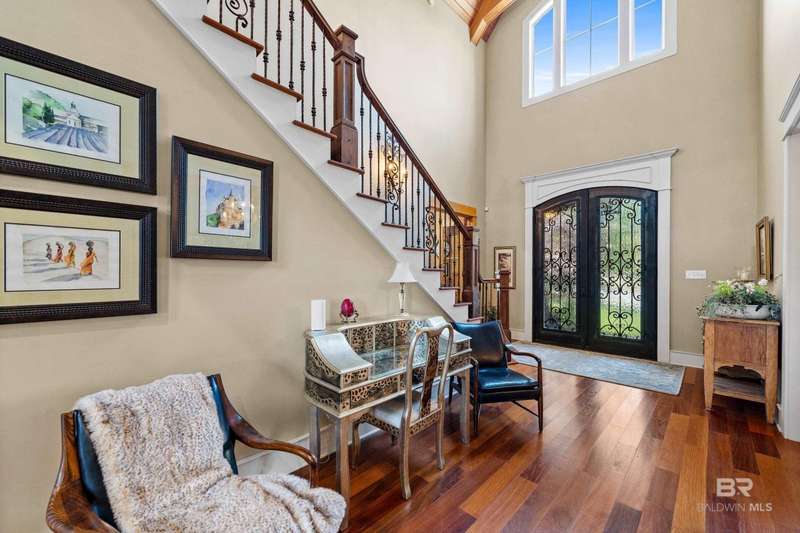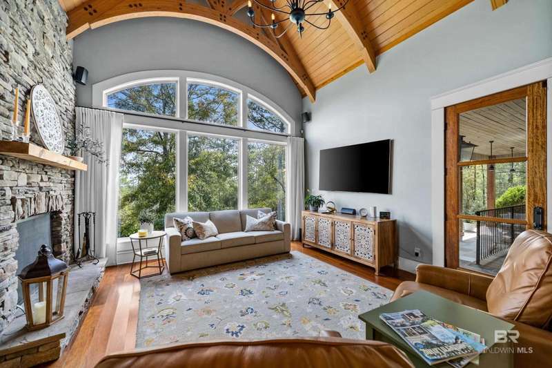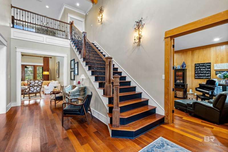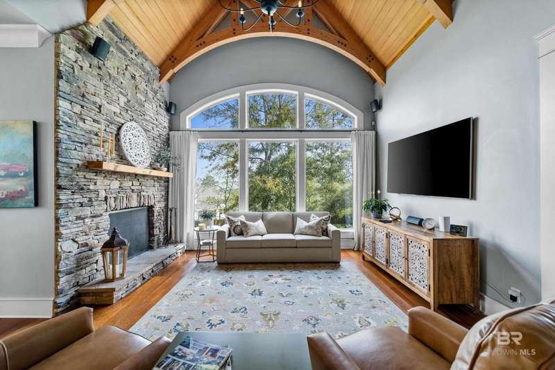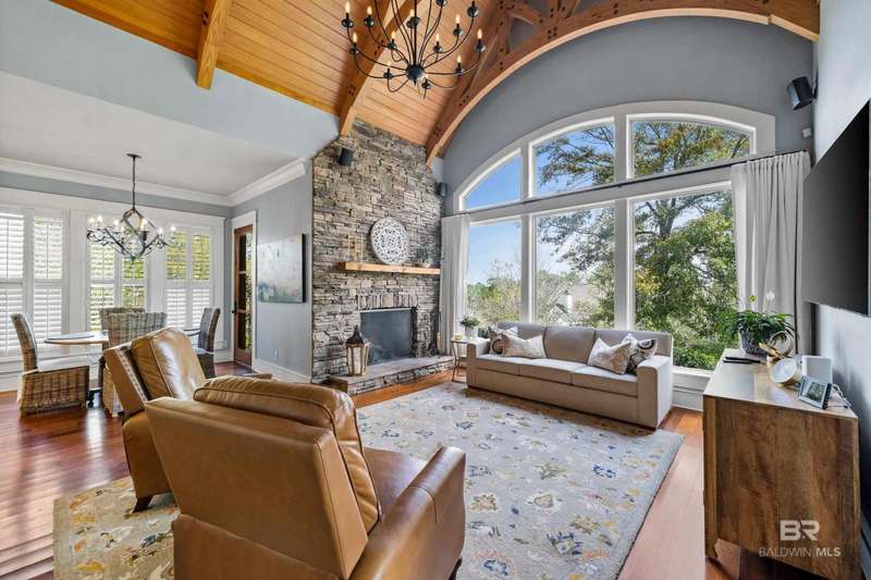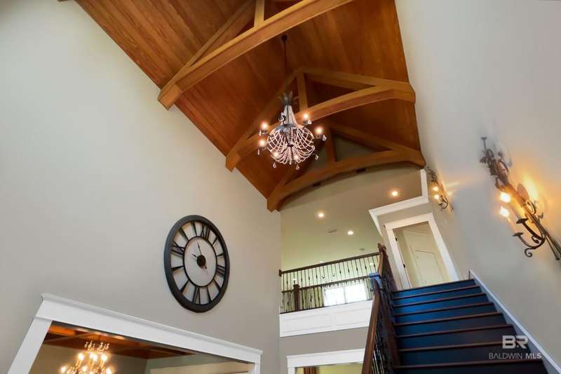 ONE-OF-A-KIND Home in Spanish Fort with new POOL! 2023 Fortified Roof and 35KW Whole House Generator! Stepping through the grand double doors, you're greeted by an architectural masterpiece that will leave you in awe. The soaring ceilings are adorned with custom-milled wood trusses, arched to create a sense of refined grandeur. Right away you will notice the attention to every detail from the solid teak floors, plantation shutters throughout the home, extensive custom trim work, beautiful lighting, coffered ceilings in the dining room and Cypress walls in the office. The expansive kitchen is open to the breakfast room and den with stone woodburning fireplace and more arched custom milled trusses with floor to ceiling windows and updated lighting fixtures. Recent kitchen updates include: Bertrazzoni 6 burner dual fuel range, GE speed cook oven, quartz countertops, wine fridge, modified and painted cabinets, new subway tile, on demand hot/cold water dispenser, and new Brizo faucet. The oversized primary bedroom retreat with two graciously sized walk-in closets and double-sided gas fireplace that can also be enjoyed in the luxurious en-suite bath. Upstairs you will find 3 additional bedrooms, 2 full bathrooms and an extra room with cabinets. The catwalk upstairs serves as both a functional passage and an eye-catching design element. This unique addition enhances the open concept of the home, allowing for breathtaking views of the living space below. Back porch is screened extending the living space outdoors. ADDITIONAL FEATURES: personal well for commercial grade irrigation, New LED landscape lighting, 3-car garage, double water filtration system, 3 Trane HVAC systems (one installed August 2025) with full-service contract, Custom built by Dan Mooney, located in the beautiful Blakeley Forest neighborhood in Spanish Fort. Buyer to verify all information during due diligence.