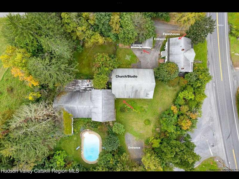Extraordinary opportunity to acquire nearly 10,000 sq ft of adaptable space in a reimagined 1897 church compound. The property features multiple structures, including a 33' x 76' studio with kitchen and loft suite, a 35' x 50' sanctuary with original stained glass and choir loft, and a 2,400 sq ft three-bedroom farmhouse with detached garage for income or additional housing. Landscaped grounds include a heated saltwater pool and gardens. Zoning permits a wide variety of potential uses (with approvals), such as art gallery, retreat center, inn/B&B, restaurant, retail or antique center, daycare, or health/educational facility. Ideally located near the NYS Thruway, minutes from Saugerties, Woodstock, Kingston, Rhinebeck, and Hudson, and just 30 minutes to Hunter Mountain. A rare investment in one of the Hudson Valley's most dynamic and desirable markets.