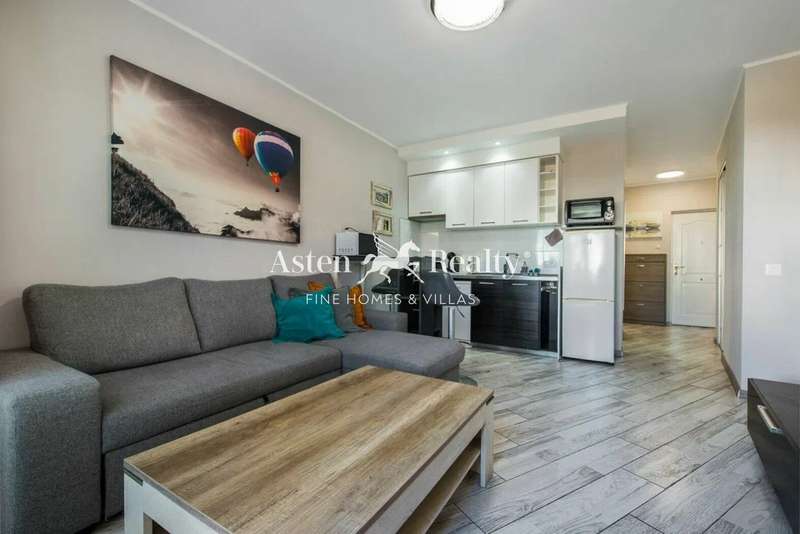 The property features a bright and spacious living-dining area with a modern fully equipped kitchen, one bedroom with a built-in wardrobe, a bathroom with a shower, and a terrace perfect for relaxing outdoors.