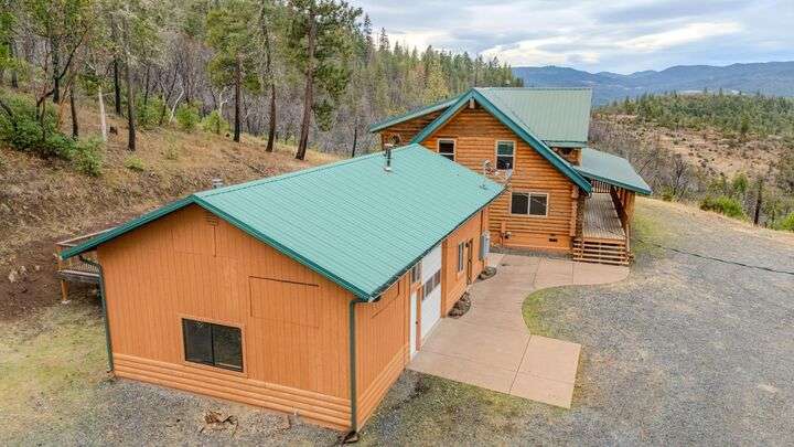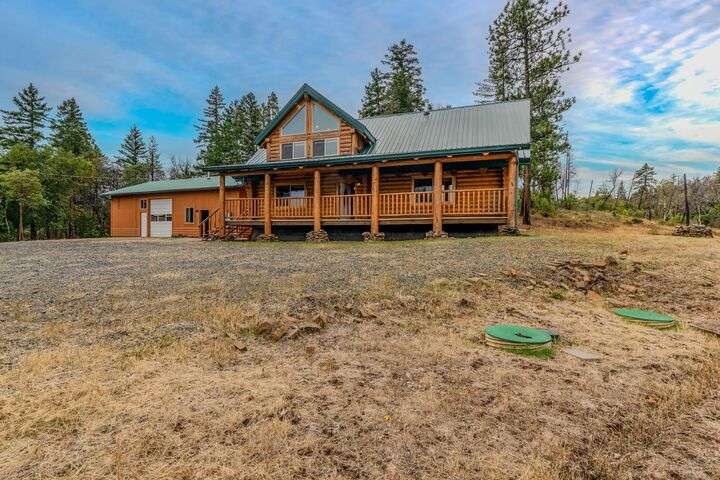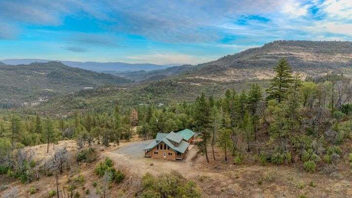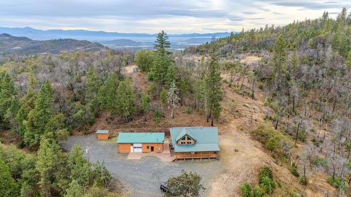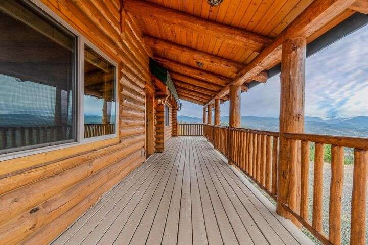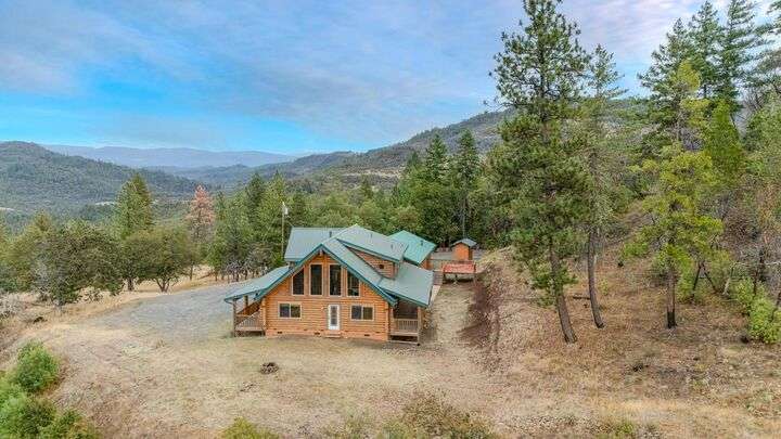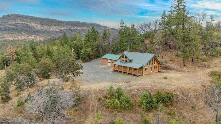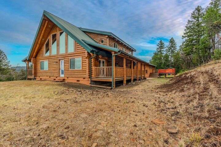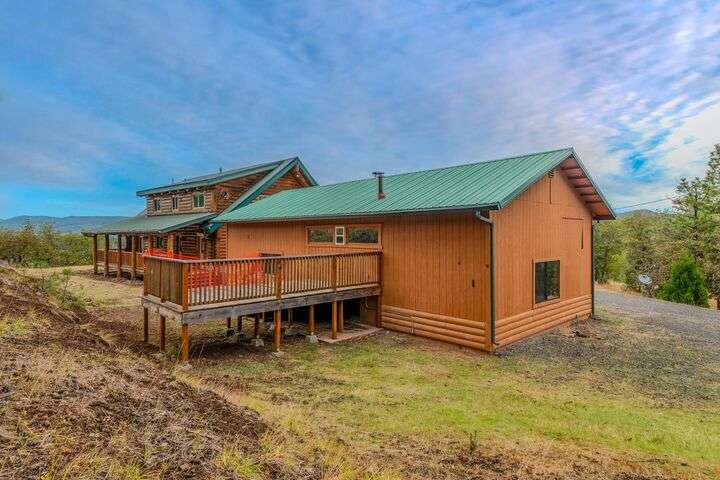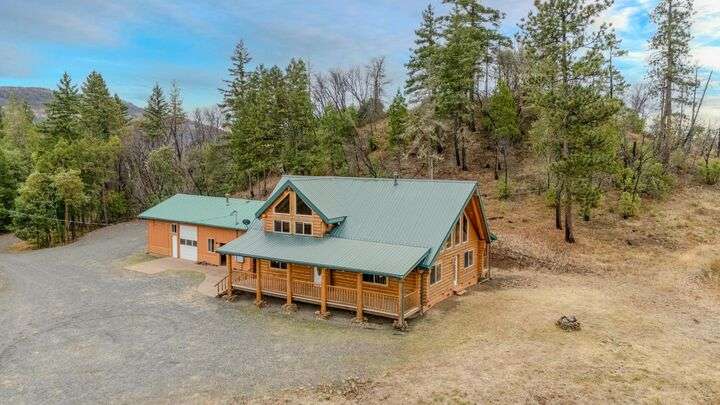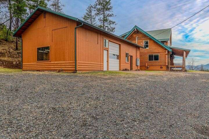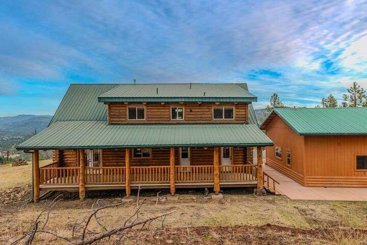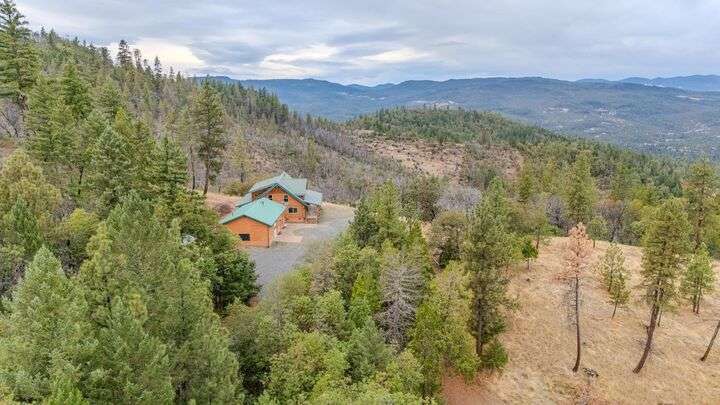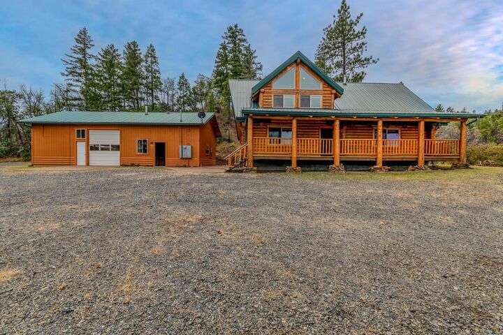 This stunning custom-built log home sits on nearly 40 timbered acres behind a gated entrance, offering the ultimate in secluded luxury living. The expansive open-beamed great room features soaring vaulted ceilings and amazing windows that frame breathtaking panoramic valley views. Cozy up to the certified wood stove on cool evenings, or enjoy your morning coffee on the wonderful, covered front or rear decks. The gourmet kitchen boasts beautiful granite countertops and a generous island perfect for entertaining, while a dedicated office area provides the ideal work-from-home space. Outside, discover endless possibilities with a large gardening area, a spacious 24x44 shop with guest quarters ideal for visitors, and ample parking. Bordering BLM land, this property provides direct access to unlimited outdoor recreation while maintaining complete privacy. Whether you're seeking a full-time retreat or weekend getaway, this exceptional log home delivers mountain living. AMAZING!