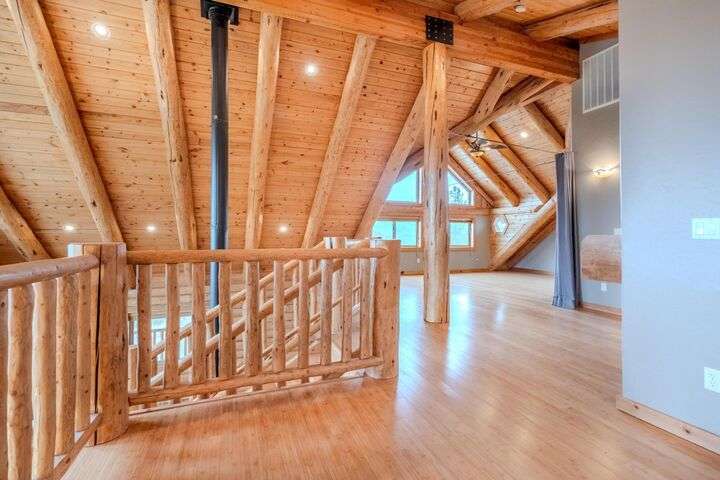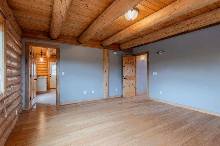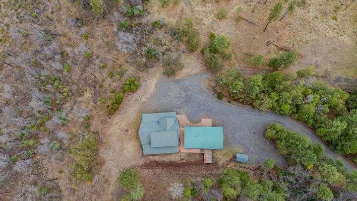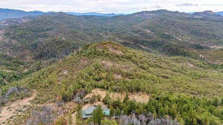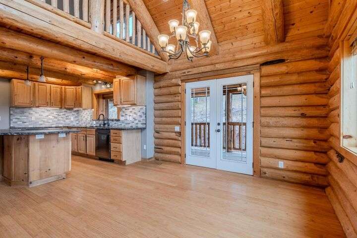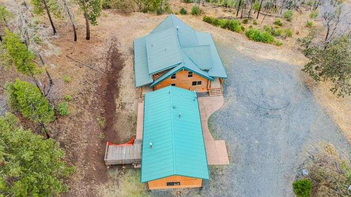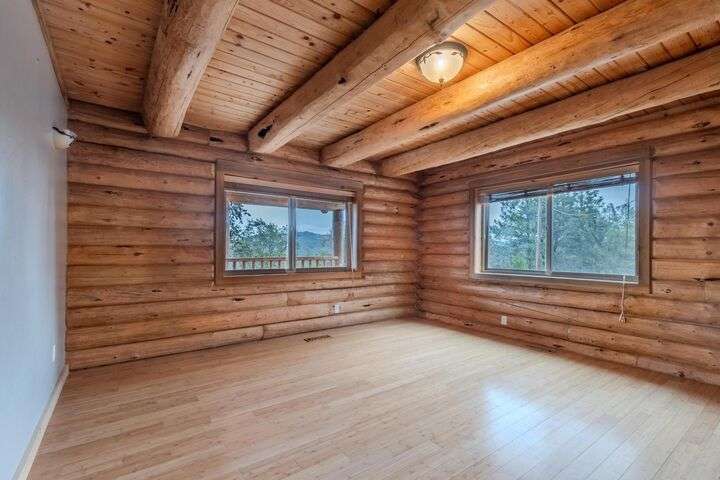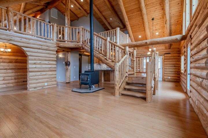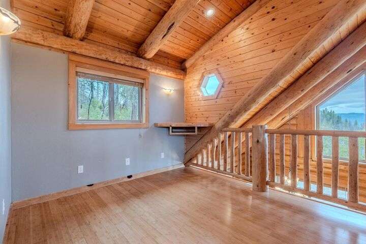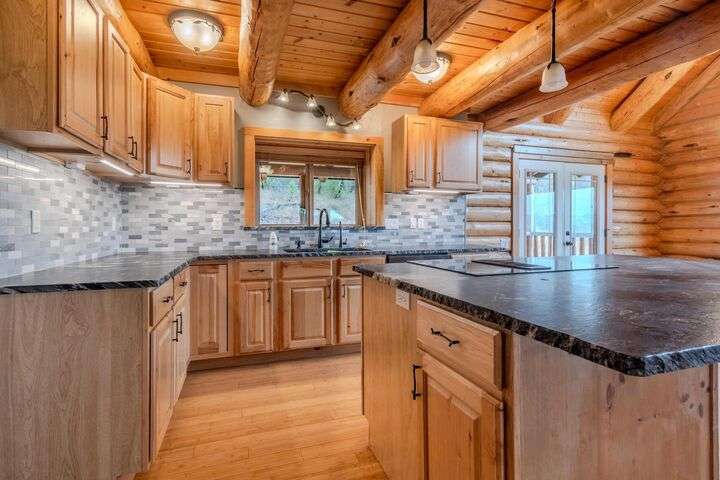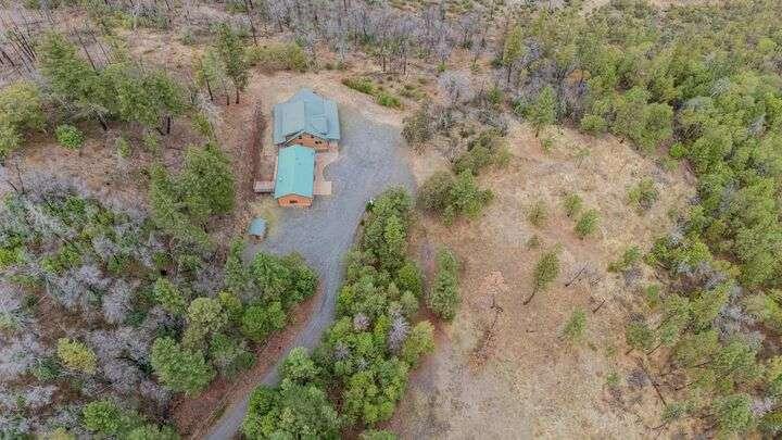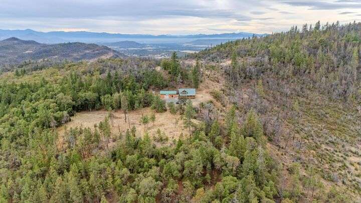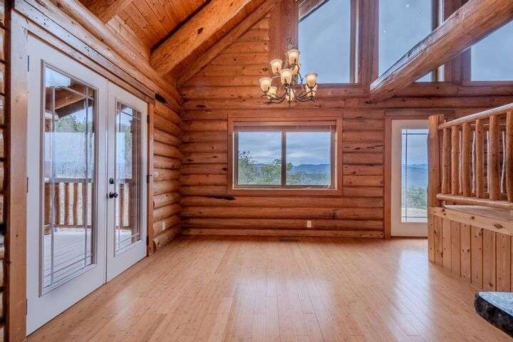 This stunning custom-built log home sits on nearly 40 timbered acres behind a gated entrance, offering the ultimate in secluded luxury living. The expansive open-beamed great room features soaring vaulted ceilings and amazing windows that frame breathtaking panoramic valley views. Cozy up to the certified wood stove on cool evenings, or enjoy your morning coffee on the wonderful, covered front or rear decks. The gourmet kitchen boasts beautiful granite countertops and a generous island perfect for entertaining, while a dedicated office area provides the ideal work-from-home space. Outside, discover endless possibilities with a large gardening area, a spacious 24x44 shop with guest quarters ideal for visitors, and ample parking. Bordering BLM land, this property provides direct access to unlimited outdoor recreation while maintaining complete privacy. Whether you're seeking a full-time retreat or weekend getaway, this exceptional log home delivers mountain living. AMAZING!