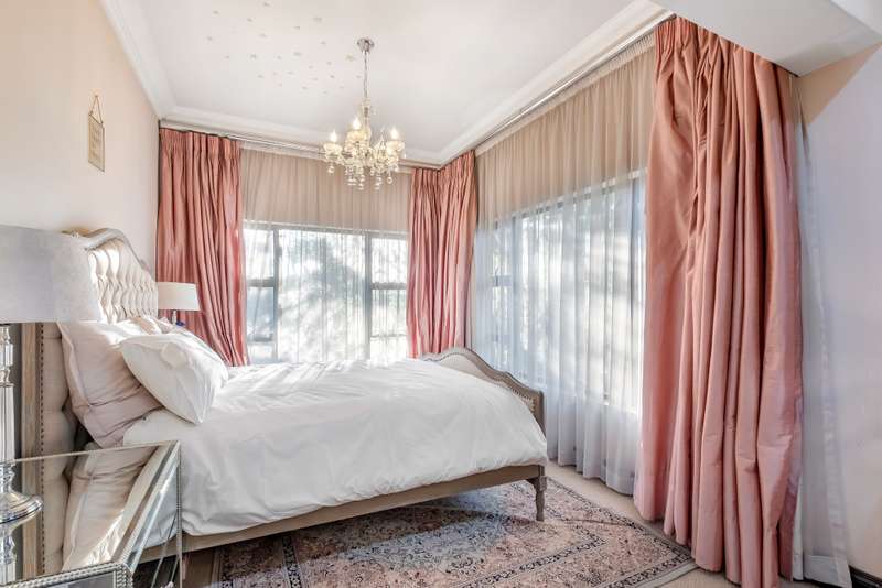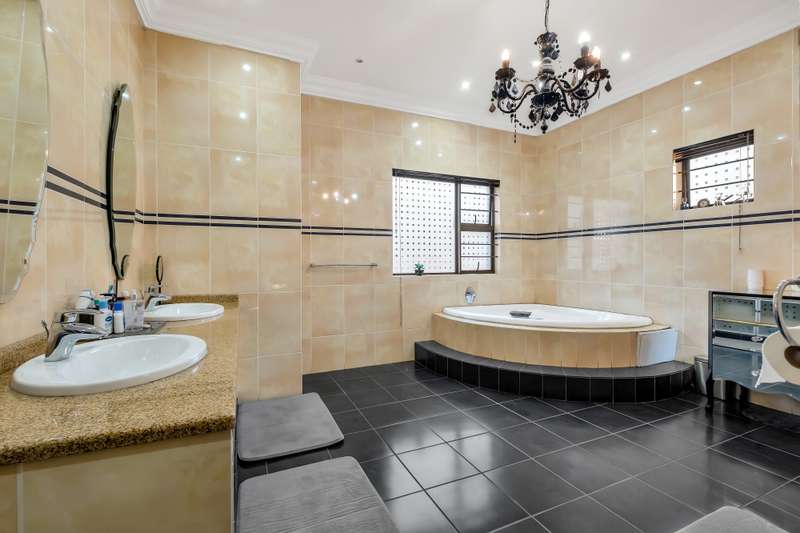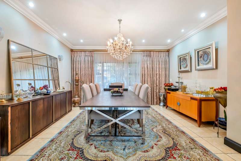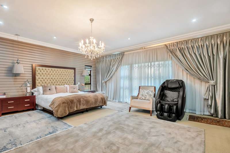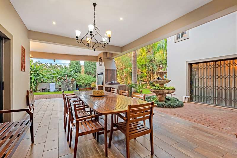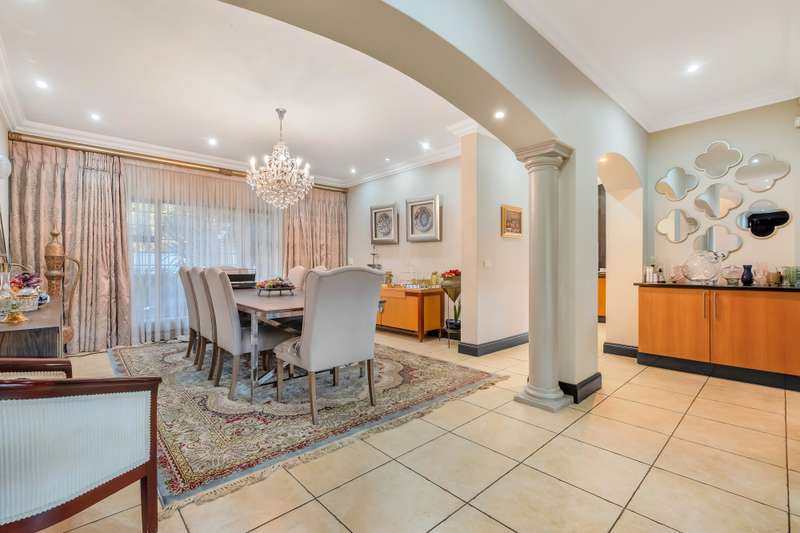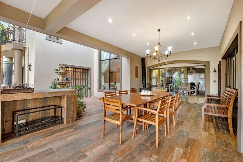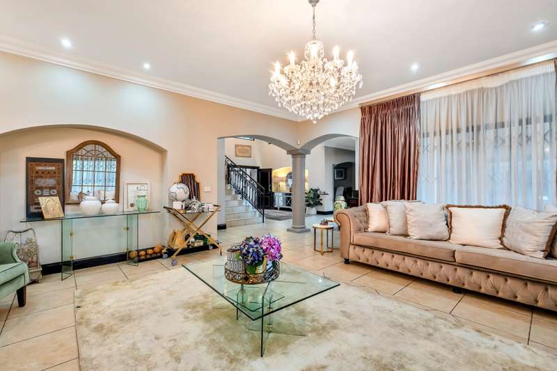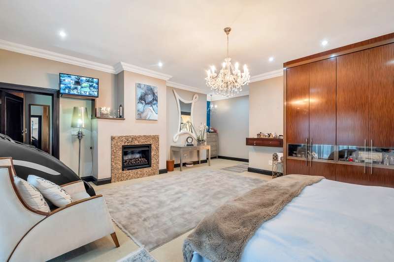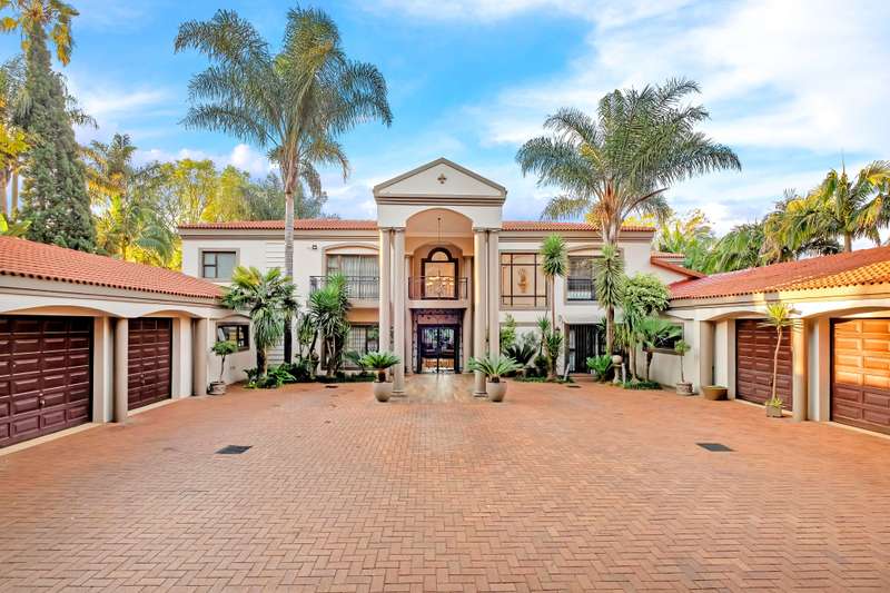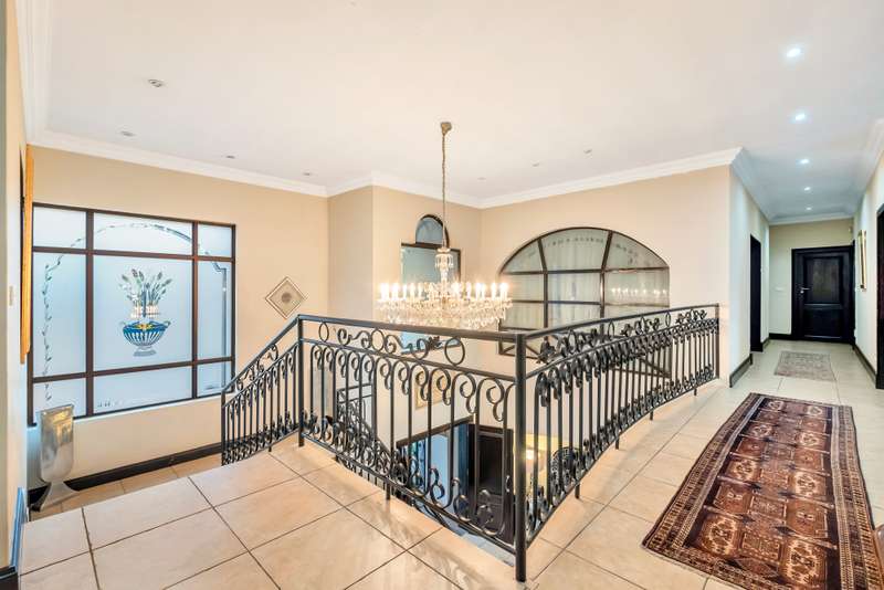 This gorgeous double storey 2479 sqm home exudes sophistication and elegance, and is surrounded by lush, manicured gardens and imported palm trees. Every detail is a masterpiece. Step into a grand entrance foyer with chandeliers and a staircase. Formal lounge with fireplace, diningroom, TV lounge with fireplace, kitchen with granite countertops, natural wood cabinets equipped with the finest kitchen appliances. Gas top stove, eye level oven, eat in dining area. Scullery/additional kitchen area with 5x gas stove hob and oven. Extra cupboards. Walk in separate pantry. Laundry. Guest bathroom. The home offers five spacious bedrooms, plus a dedicated study with mahogany wall unit and private walk-out balcony. The principal bedroom is a private retreat, complete with a fireplace, walk-in dressing room with cherry wood cabinetry and a deluxe en-suite bathroom, walk-out balcony overlooking the garden. 2nd and 3rd bedrooms, fitted with beechwood cabinetry with doors leading onto a walk-out balcony. Full bathroom. Linen room. Additional lounge area. This property has the opportunity to be partitioned into two separate dwellings - the two bedrooms downstairs, fully equipped kitchen with gas hob stove and oven, open plan lounge, storeroom, private entrance and garden. Covered entertaining patio with built in braai, jet master fireplace. Domestic accommodation with 2x bedrooms, two bathrooms and a kitchen area. 4x garages. Direct access into property. Off-street parking. Finest fixture and fittings– crystal chandeliers, wrought iron balustrades, underfloor heating throughout, storage space under staircase, 3x inverters, 24 solar panels, 5000L JOJO tank. Municipal gas. CCTV surveillance with its own control room. Burglar alarm, armed response, electric fence. Trellidors on all doors and windows. There is a service road attached to this property for added convenience. So much more to see.