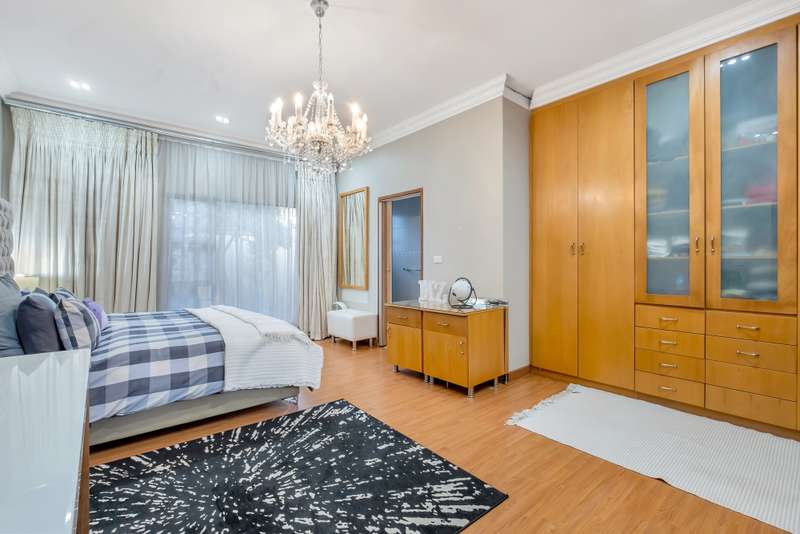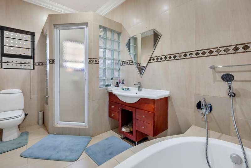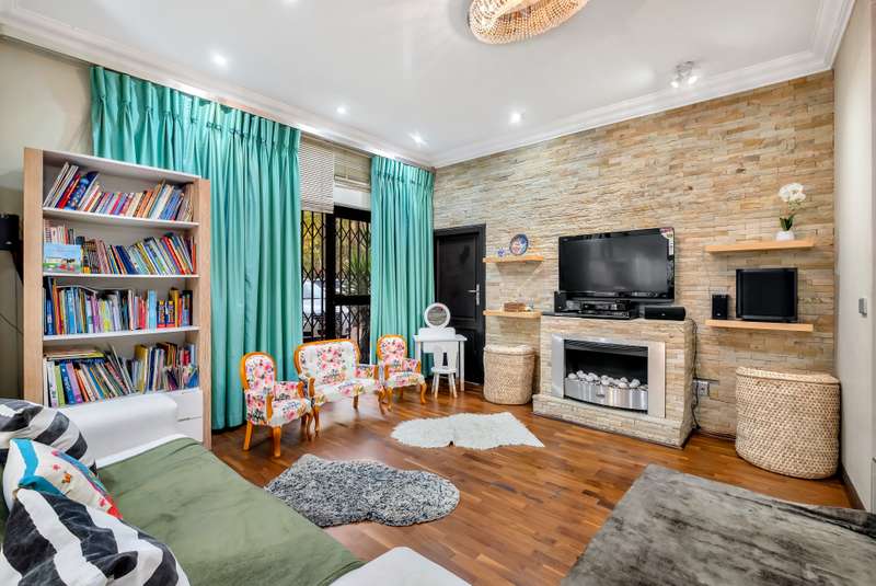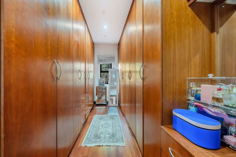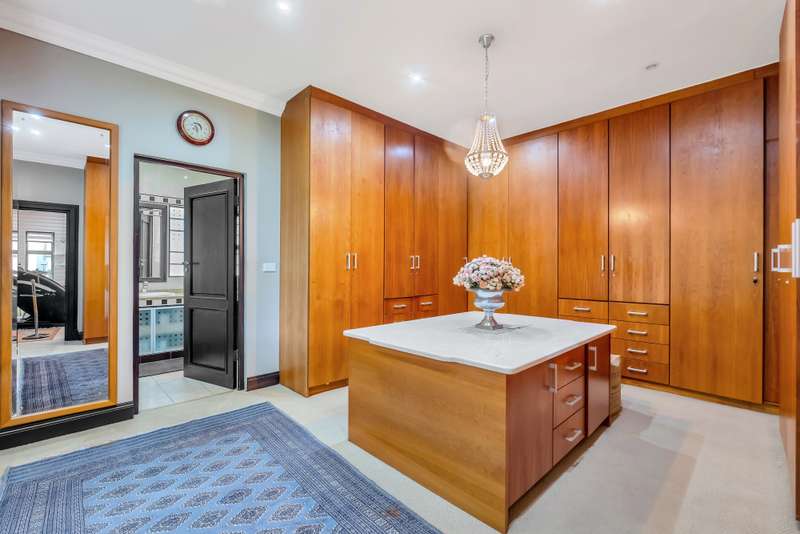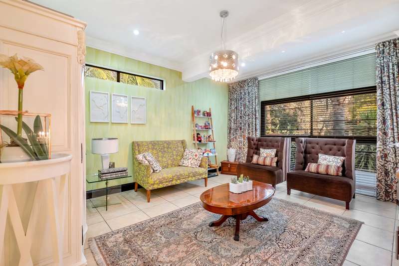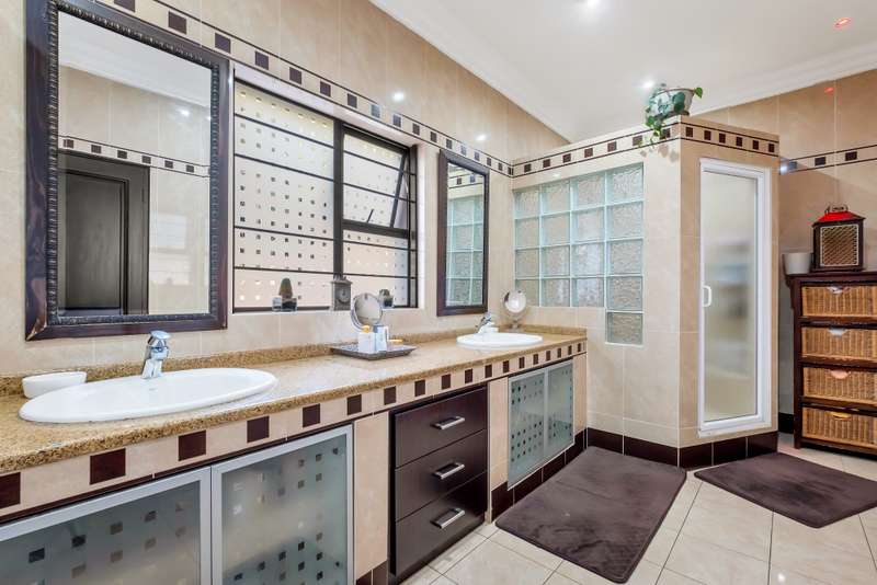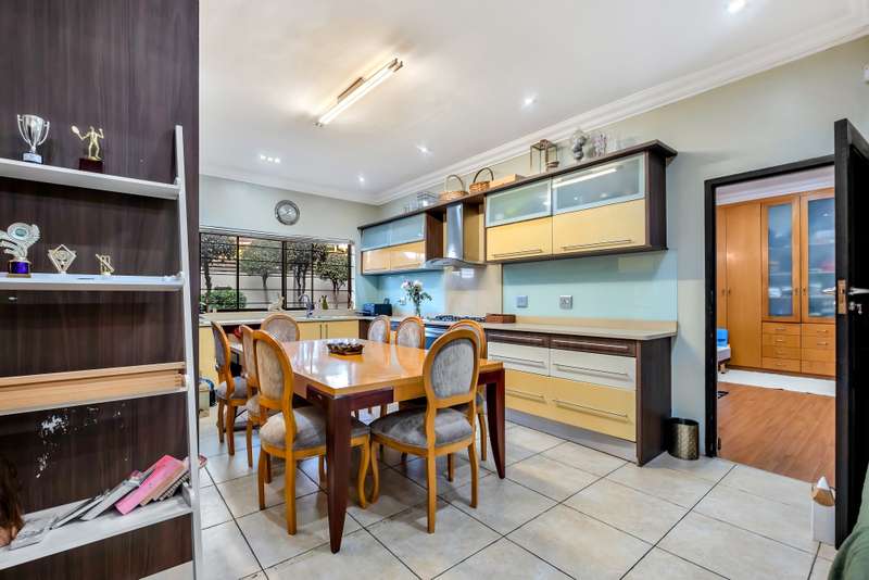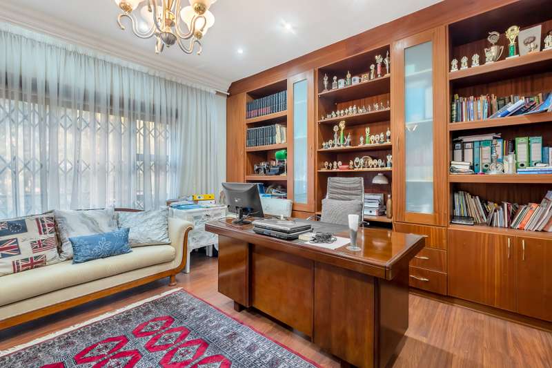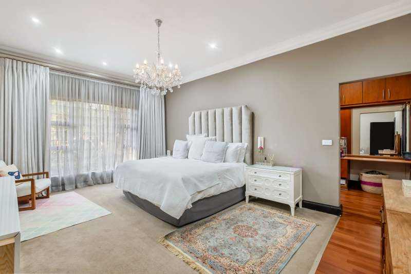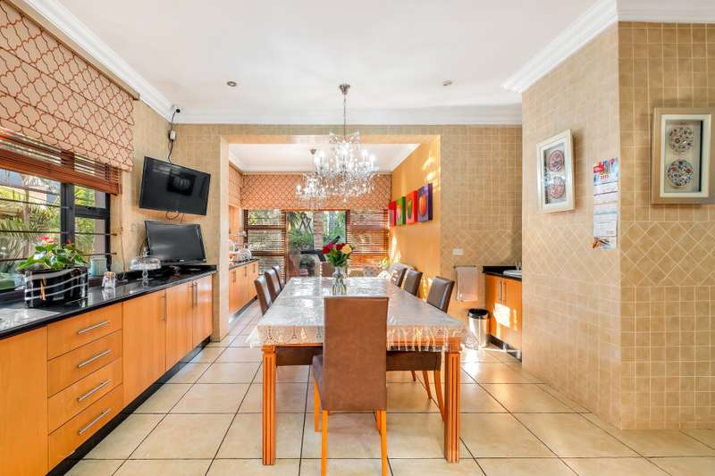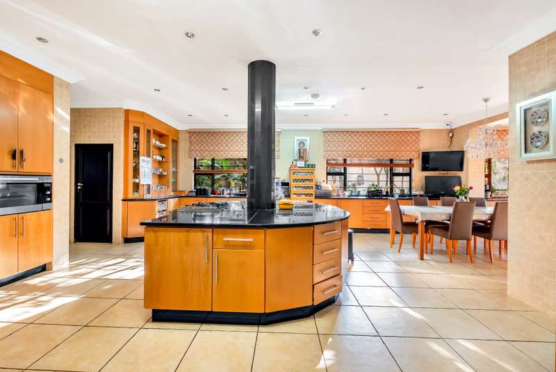 This gorgeous double storey 2479 sqm home exudes sophistication and elegance, and is surrounded by lush, manicured gardens and imported palm trees. Every detail is a masterpiece. Step into a grand entrance foyer with chandeliers and a staircase. Formal lounge with fireplace, diningroom, TV lounge with fireplace, kitchen with granite countertops, natural wood cabinets equipped with the finest kitchen appliances. Gas top stove, eye level oven, eat in dining area. Scullery/additional kitchen area with 5x gas stove hob and oven. Extra cupboards. Walk in separate pantry. Laundry. Guest bathroom. The home offers five spacious bedrooms, plus a dedicated study with mahogany wall unit and private walk-out balcony. The principal bedroom is a private retreat, complete with a fireplace, walk-in dressing room with cherry wood cabinetry and a deluxe en-suite bathroom, walk-out balcony overlooking the garden. 2nd and 3rd bedrooms, fitted with beechwood cabinetry with doors leading onto a walk-out balcony. Full bathroom. Linen room. Additional lounge area. This property has the opportunity to be partitioned into two separate dwellings - the two bedrooms downstairs, fully equipped kitchen with gas hob stove and oven, open plan lounge, storeroom, private entrance and garden. Covered entertaining patio with built in braai, jet master fireplace. Domestic accommodation with 2x bedrooms, two bathrooms and a kitchen area. 4x garages. Direct access into property. Off-street parking. Finest fixture and fittings– crystal chandeliers, wrought iron balustrades, underfloor heating throughout, storage space under staircase, 3x inverters, 24 solar panels, 5000L JOJO tank. Municipal gas. CCTV surveillance with its own control room. Burglar alarm, armed response, electric fence. Trellidors on all doors and windows. There is a service road attached to this property for added convenience. So much more to see.