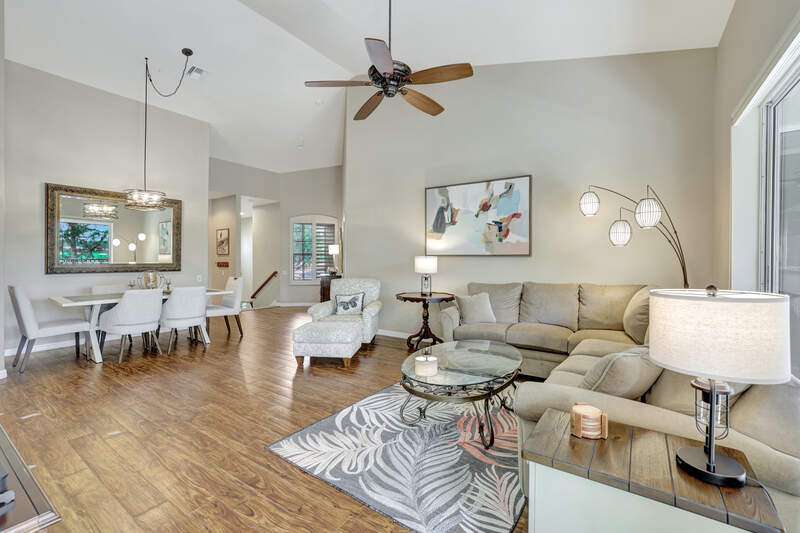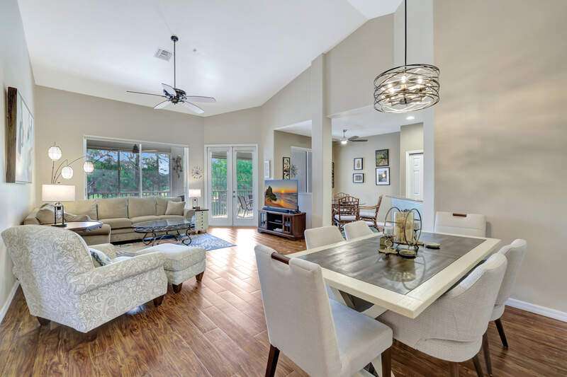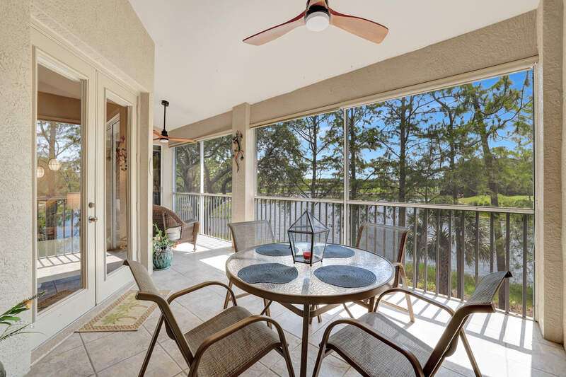 Enjoy lake and long golf course views from the lanai of this western exposure Lancaster III carriage home. This spacious unit has soaring ceilings, laminate and tile flooring with carpeting in the bedrooms, newer fixtures and fans. The kitchen has granite countertops and stainless-steel appliances. The attached one car garage has extra storage and room for a golf cart, which can be used on the golf course for a trail fee. You will appreciate the many community amenities offered including bundled golf, a newer resort-style pool, and spa 3 satellite pools, a state-of-the-art fitness center with optional classes, massage services and physical therapy, and Har-Tru tennis courts where you can also play bocce and pickleball. Enjoy al fresco dining at the renovated Terrace Cafe as well as casual and fine dining at the recently refreshed clubhouse.