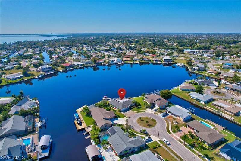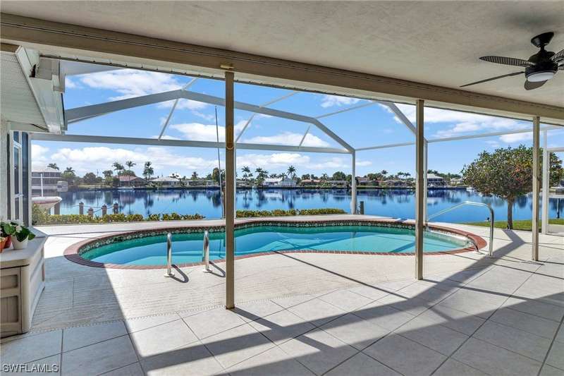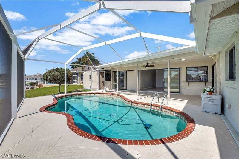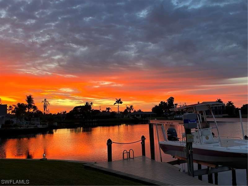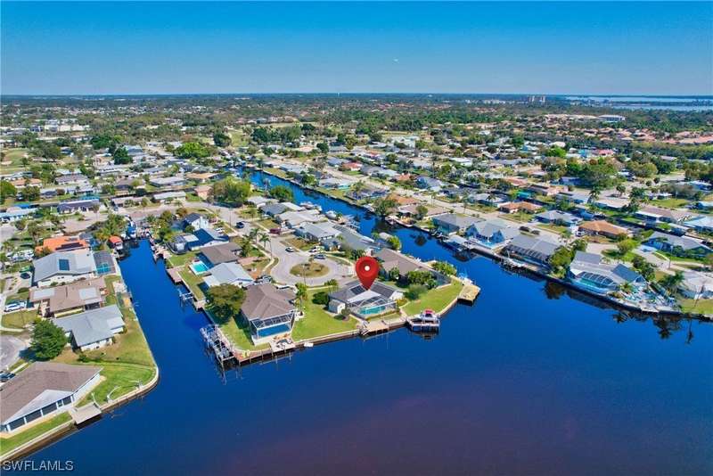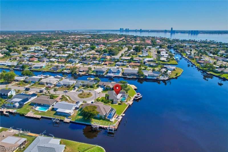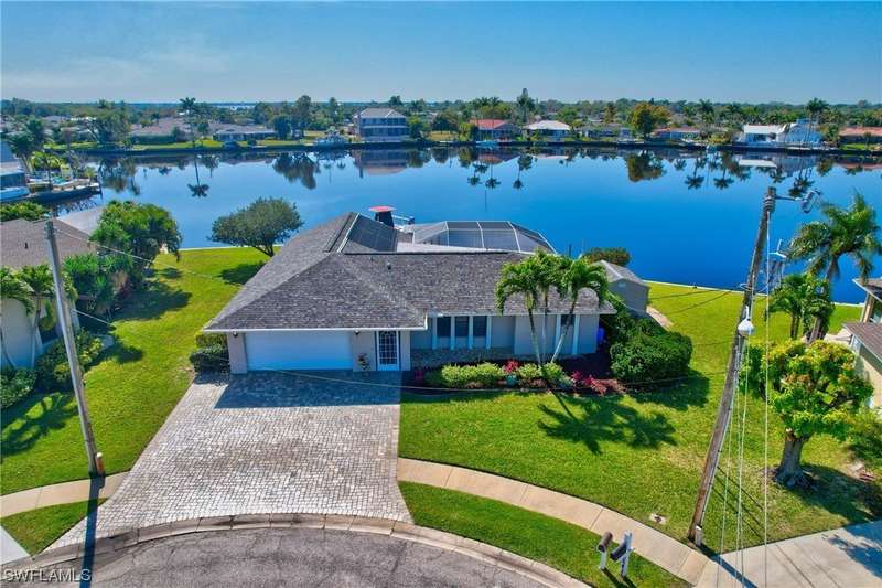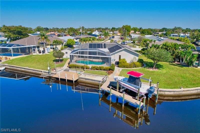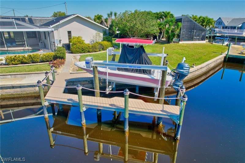 Talk about a Million Dollar View! Boaters Paradise, SAILBOAT GULF ACCESS home situated on Little Lake Michigan that has never flooded from storms. Southern Exposure and Breathtaking Sunrise & Sunset Views! Feel like you are on vacation everyday with water views from every room. Large fully open sliders in Great Room, Breakfast Nook, and Primary Bedroom, all lead to expansive covered pool deck and SALTWATER POOL, warm year-round with SOLAR HEAT. So much storage with Walk-in closets in all 3 bedrooms, Large closets in both baths, and Full attic above house and garage. Both Bathrooms were recently updated to include Fresh Paint, New Fixtures and New Lights. A Quick Boat ride gives you access to some of the Best Beaches In SW Florida, Including Fort Myers Beach & Sanibel Island. The lot is .29, just shy of a Triple Lot located on the end of a Quiet Cul-de-sac! BRAND NEW HVAC added 2025. New Roof added 2018 ( fully inspected after Ian), Driveway Expanded with Sealed Pavers (2019) accommodates 3+ vehicles, Solar Heated Pool (2019), New 10K Boat Lift with Composite Decking and Captains Walk (2021),Custom Built Tough Shed/Workshop 10x12 (2019), Waterproof Porcelain Tile in Formal living & Primary Bedroom (2020), Luxury Vinyl Plank added to both Guest Bedrooms (2024), Gorgeous Kitchen Backsplash (2024), Gutters Extended (2019), Tesla Charging port in extra deep Garage. Less than 5 Miles to Downtown Fort Myers Entertainment District. No flooding during Ian or other hurricanes . Pet Free / Smoke Free Home! No HOA fees. Homes directly on the lake are Rarely Available, schedule a showing today!