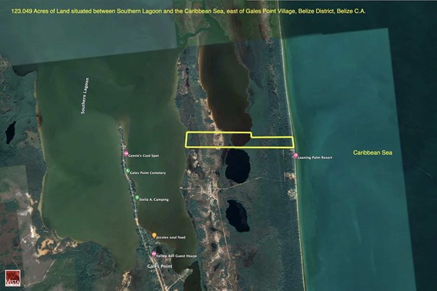This superb investment opportunity of an impressive 123.04 acres of land, situated in southern Belize District. This exceptional property is between Southern Lagoon and the Caribbean Sea, east of Gales Point Village. It boasts an approximate 660 ft of stunning sandy beachfront and 936 ft of splendid waterfront along Southern Lagoon. This diverse terrain consists of high, dry land along the Caribbean Sea and is connected to the Quashie Trap Lagoon. Accessible by land and sea, this remarkable area of land is still in its natural state. The property’s magnitude and location present great residential and commercial potential, ranging from waterfront luxury estates, bespoke vacation rental residences to substantial, luxury eco-resorts. The diverse flora and fauna will be a major contributor to this style of tourism development.The Southern Lagoon frontage is a pristine estuary system that is home to a manatee reserve and is conducive to tours of the wetlands, sport fishing, bird watching, and so much more.This property is just 2.5 miles off the recently paved coastal road, 3 miles east of Gales Point Manatee, 23 miles north of Dangriga. It is approximately 2 hour away from the International Airport.
