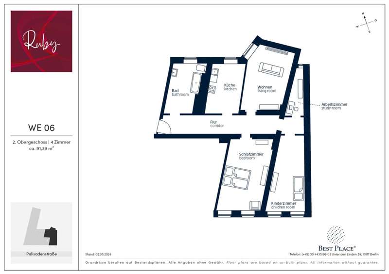 Ruby is a charming Wilhelminian-style building, constructed in 1900 and situated on the serene single-lane Palisadenstrasse. Its red-painted facade, which inspired the building’s new name, is adorned with stucco, adding an extra touch of elegance to this attractive five-story residential and commercial building. Twelve apartments with two to four rooms and living areas of approx. 61 to 101 sqm are located on the property’s 1st to 4th floors. These classic Wilhelminian-style units not only boast desirable apartment sizes but also feature highly efficient floor plans. In keeping with the typical style of Wilhelminian apartment buildings, each unit has a separate kitchen offering space for a small breakfast nook. A majority of the units have daylight bathrooms, most of which are equipped with bathtubs. Additionally, many of the apartments have balconies and, thanks to their south-facing orientation, they provide a tranquil outdoor space to relax in the fresh air and soak up the sunshine. Two apartments on the top floor are currently being renovated. The two commercial units are located on the ground floor and are rented out.