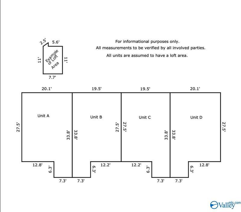 Great investment 4-plex opportunity in Huntsville! Units are one bedroom, one full bathroom, with laundry room and loft area above Kitchen. Loft Area is 86 sqft and is not included in each unit's total square footage. Private parking in front for tenants. Close proximity to University of Huntsville Alabama Campus and Oakwood College. Buildings are available individually or as part of a package of three contiguous 4-Plexs co-located on Ascent Trail. Included addresses are 1417, 1419, and 1421 Ascent Trail. Package Price $900,000. Property sold AS-IS.
