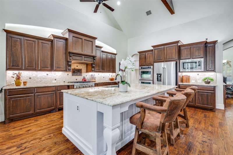 Like new M. Christopher 1.5 story custom home within walking distance to park and schools. Walk into walls of windows offering panoramic views of private backyard, lush landscaping and resort style pool. Backyard features a large, covered veranda complete with built-in grill perfect for entertaining. Home showcases vaulted ceilings, hardwood floors, and floor to ceiling fireplace. Large chefs kitchen opens to family room. Kitchen offers granite island, stainless steel appliances, cabinets galore, and double ovens. Private library with custom bookcases and hidden storage closet. Flexible layout plus an upstairs retreat with large closet, ideal as game or media room or second master complete with full bath. Sought after location close to PGA, shopping, restaurants, and tons of amenities.