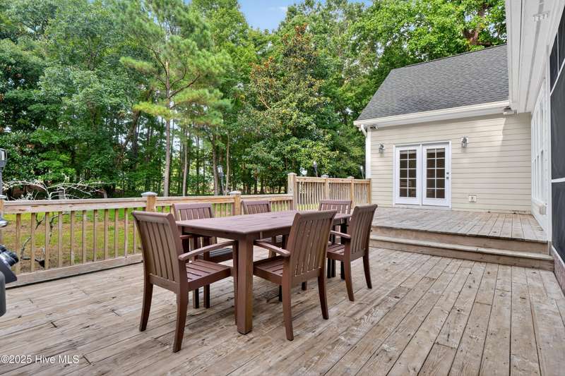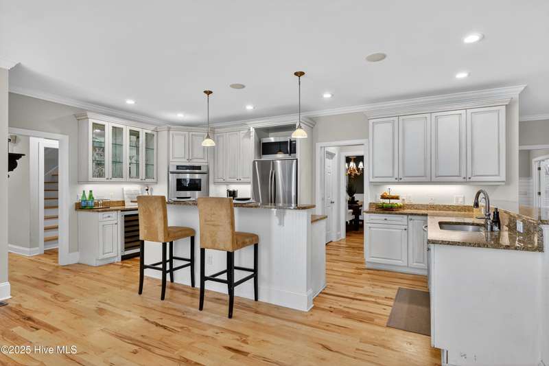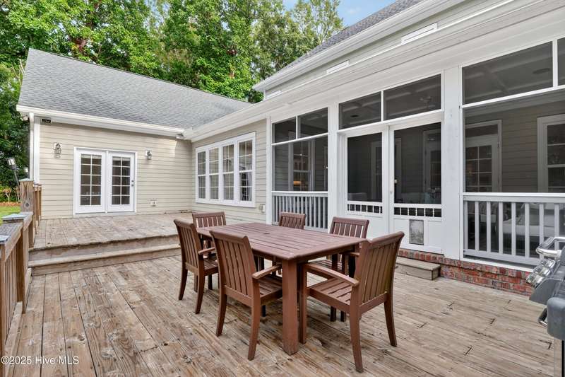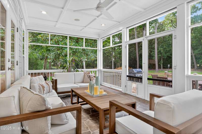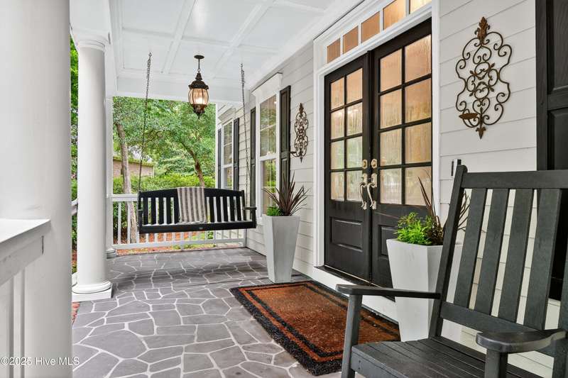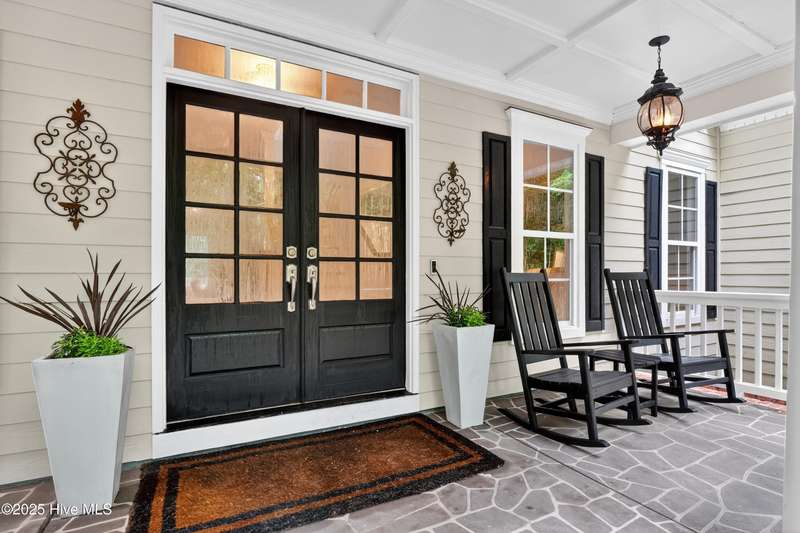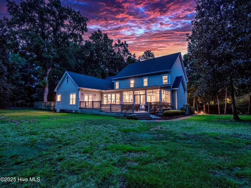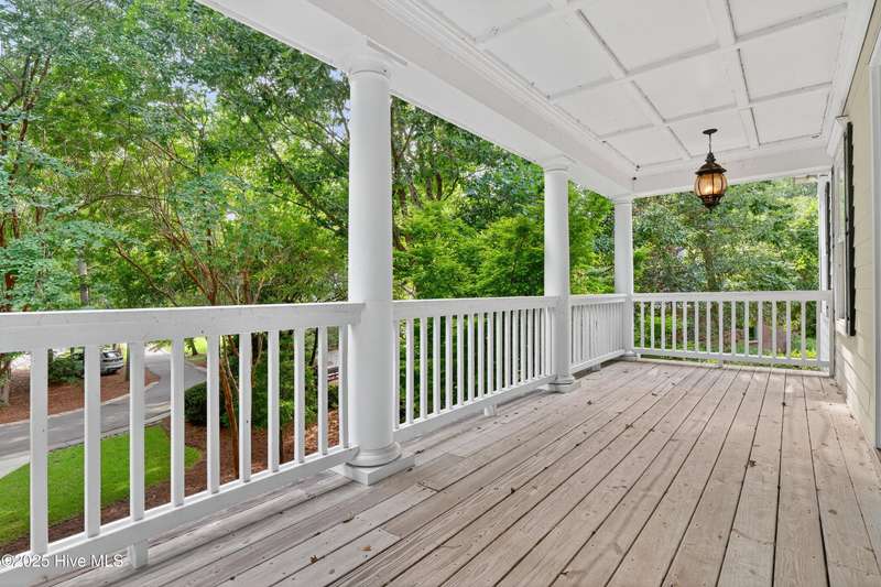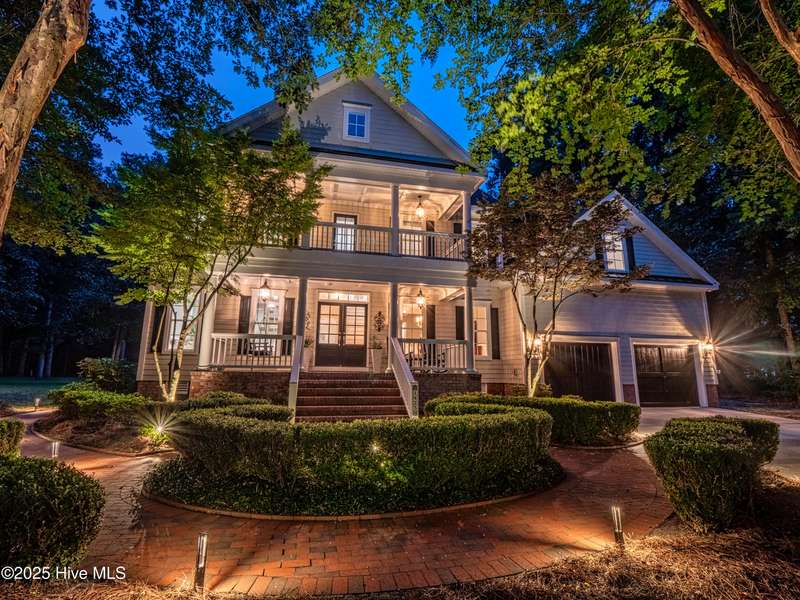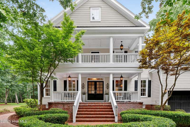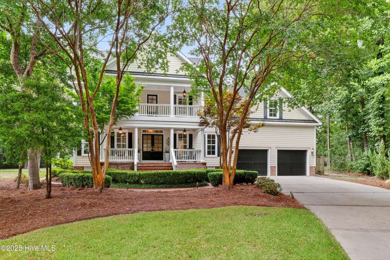 Welcome to Avenel, a waterfront community nestled along the Intracoastal Waterway just before the Figure Eight Island bridge. This rare gem boasts heavily wooded surroundings, tree-canopied roads, and spacious, private lots with gentle rolling hills, unique to the area. Avenel features newly refurbished docks and a community pier extending into the waterway, exuding Southern charm with its raised timber medians and distinctive street signs.This welcoming home sits at the end of a cul-de-sac, offering 220 feet of views on the 11th fairway of the exclusive Eagle Point Golf Club, a Tom Fazio design and top 100 course in the US, currently ranked #6 in North Carolina. This 4800 square foot Charleston inspired porch over porch invites you to relax in rocking chairs and relish the beauty of the outdoors. Inside, a formal dining room sets the stage for gatherings, while French doors lead to an office with panoramic windows. The first floor features an open floorplan with hickory hardwoods throughout. The chef's kitchen boasts a commercial-style gas range, wrap-around bar and island, and flows seamlessly with the large great room with gas log fireplace and sunny breakfast area all overlooking the park like setting of Eagle Point golf course. The screened porch and expansive deck provide the perfect spot to relax and enjoy the private expansive back yard. The downstairs primary suite, with direct access to the back deck, features two dedicated closets and a large bathroom complete with a tile shower, jacuzzi tub, dual vanities. Upstairs, a massive bonus room with a gaming closet and four large bedrooms (three with walk-in closets) await. Two large bedrooms share a Jack & Jill bath; perfect for kids. A third bedroom serves as a guest suite with its own bathroom and walk-in closet, while the fourth bedroom accesses the guest suite bath. Off the bonus room is an expansive unfinished space full of possibilities, and the third floor features a large, unfinished bonus room with